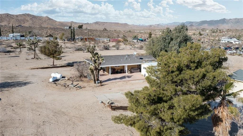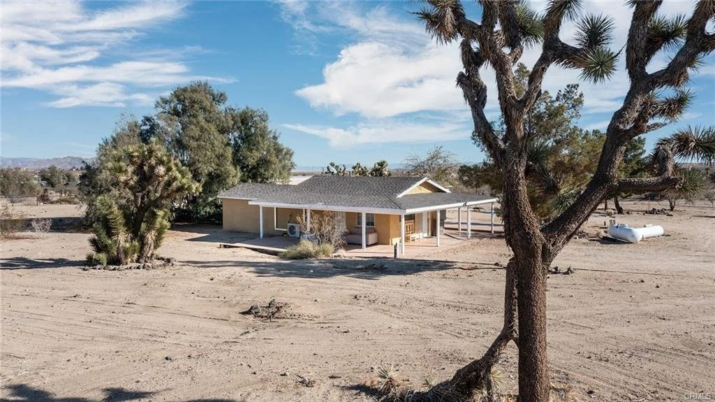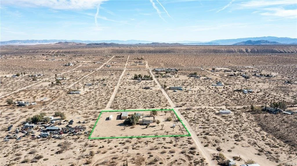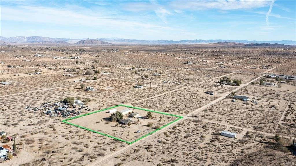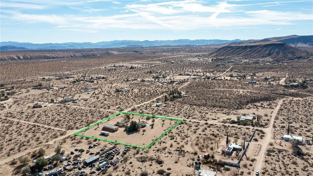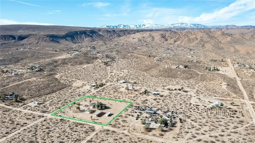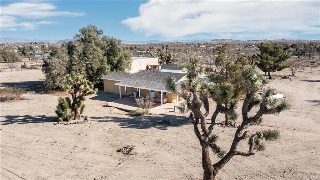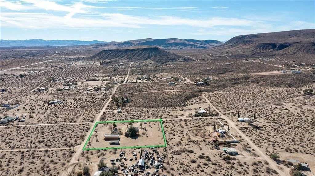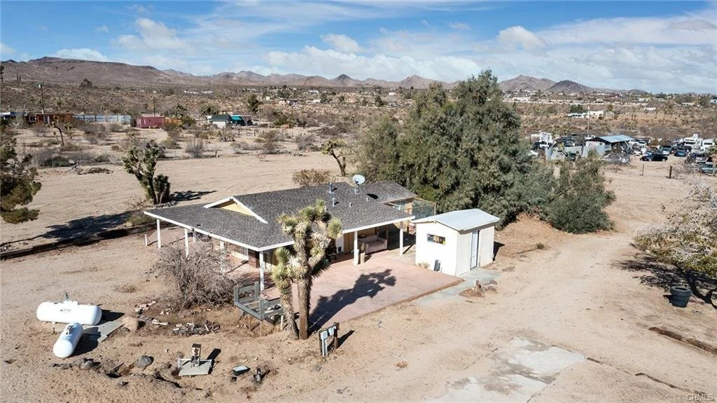 Rock n' Roll! Don't let this baby go. FLAMINGO HEIGHTS COMPOUND: Four separate PERMITTED structures, including a cozy 1 bed/1 bath home with wrap-around porch to stay cool in the shade; a detached laundry house for washer/dryer & storage; a detached two-car garage converted into an insulated, finished room; and 1,800 square feet permitted structure that can be used as office space, an art/music studio, indoor greenhouse, storage and, possibly, living space (buyer to confirm all w S.B. County). Property can be used as a primary residence, long-term or short-term rental. Would make an excellent Base-of-Operations or your business. Purchase includes a working, fully-permitted 400-AMP ELECTRICAL PANEL. Fully-fenced. 2.5-acre corner lot. Solar-powered electric-gate. Walking distance to Sand to Snow National Monument. Excellent wilderness hikes nearby. Panoramic views of the mountains to the south and west. Sweet, unusual location and configuration that can be used for a multitude of purposes.