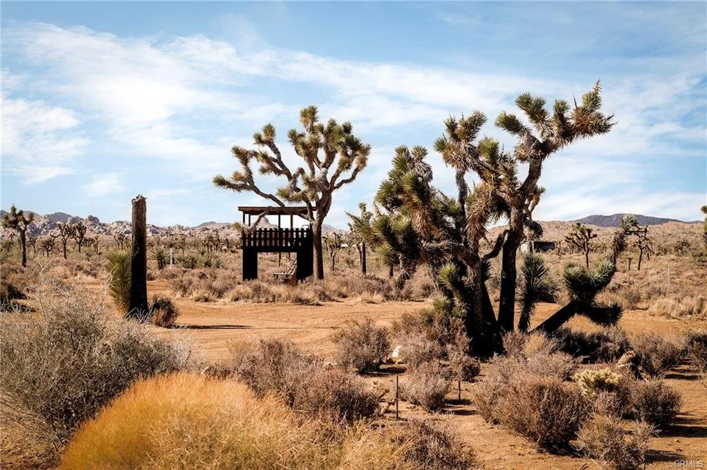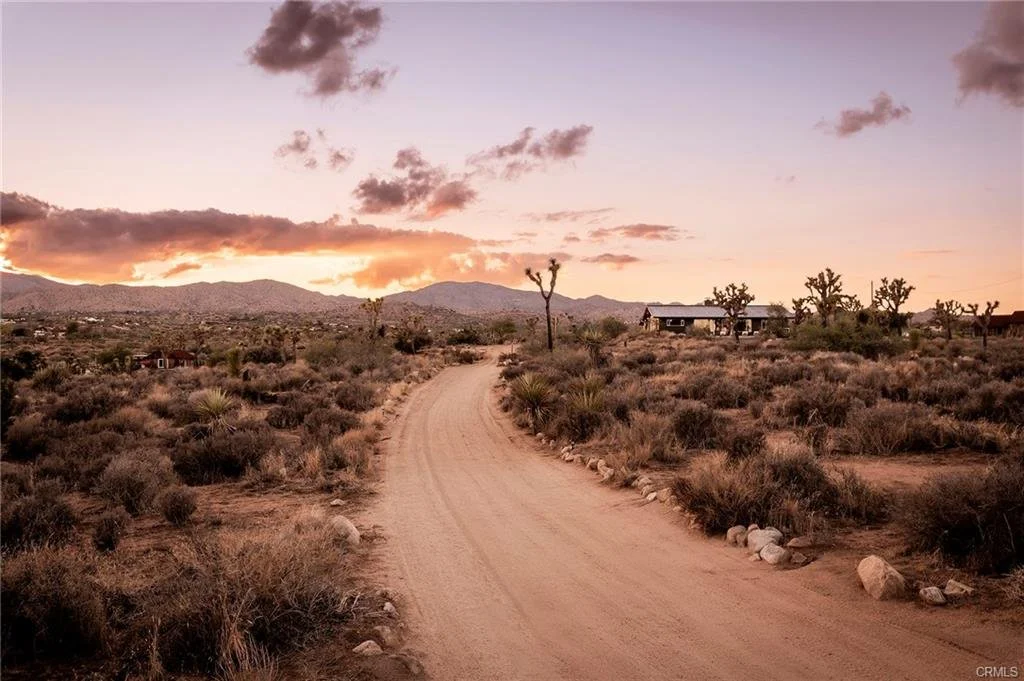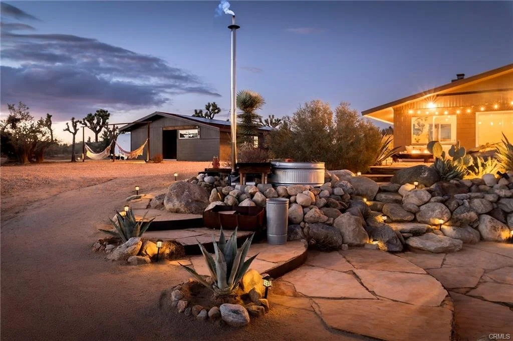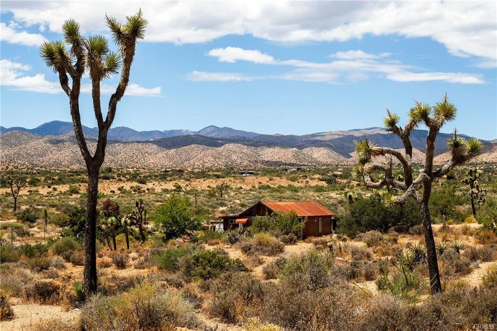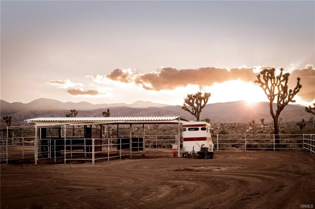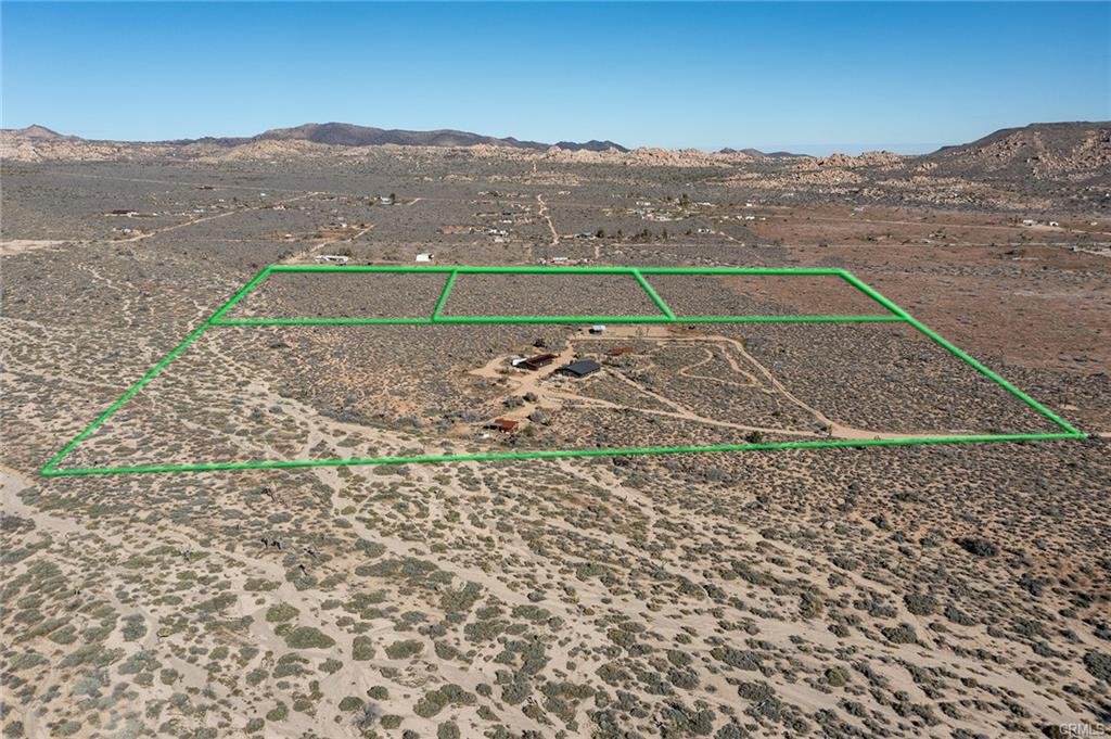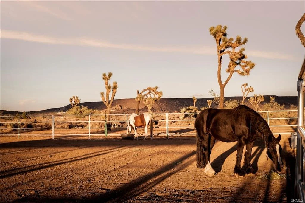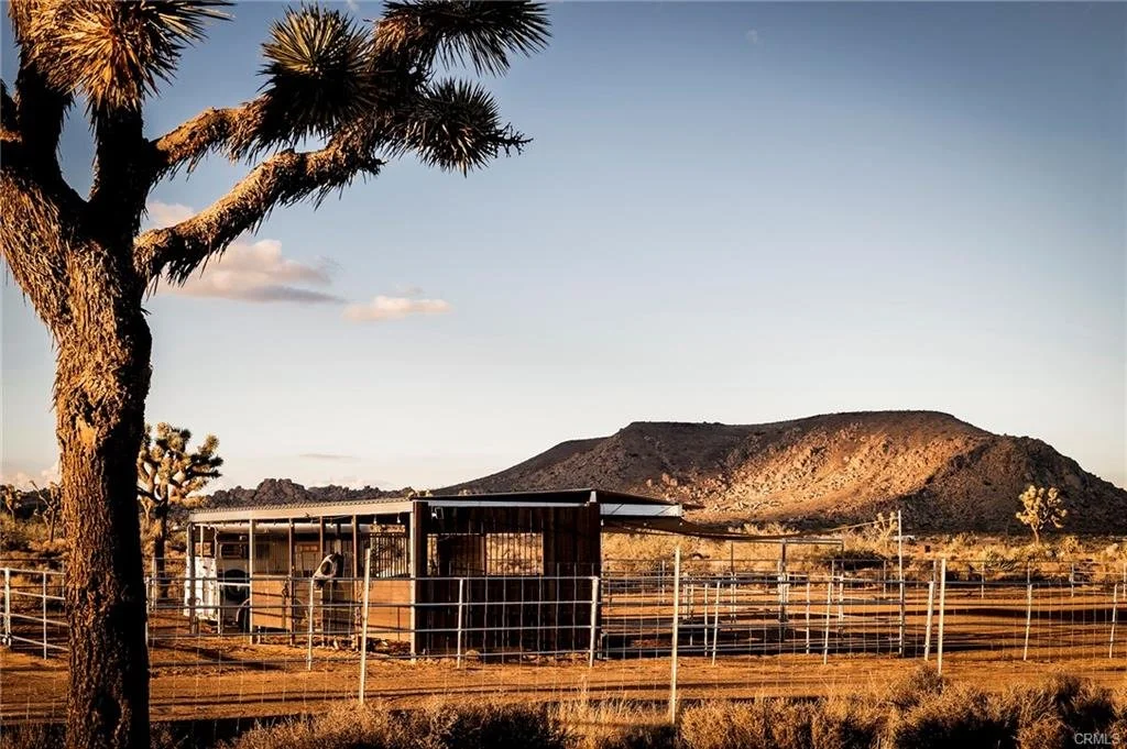 With breathtaking views spanning from the lava buttes of the Sand to Snow National Monument to ancient boulders and the distant peaks of Big Bear and Mount San Jacinto, this extraordinary 40-acre ranch offers a rare combination of natural beauty, privacy, and outdoor adventure. With direct access to miles of trails perfect for off-roading and horseback riding, the property is just minutes from Pappy & Harriet’s, Joshua Tree National Park, and the heart of Pioneertown. Every room captures a unique desert or mountain view, creating an inspiring indoor-outdoor connection throughout. Currently one year into the subdivision process, the parcel is being divided into four legal opportunities: a 20-acre main compound featuring the primary residence, detached 2.5-car garage with office, original 1932 homestead cabin, and stables; plus one 6-acre parcel and two 7-acre parcels. Easements are in place, and nearby electric poles allow for future utility access, making this both a lifestyle ranch and a long-term investment. The 1,527 sq ft main residence offers 2 bedrooms, 1 bathroom, and a bonus office. Venetian plaster walls, a newly remodeled bath with Italian and Moroccan finishes, and a chef’s kitchen with butcher block island and KitchenAid appliances blend rustic character with modern comfort. Additional features include a wood-burning fireplace with NuTone blowers and a paid-for solar system while remaining on-grid. The original 1932 homestead cabin (313 sq ft) is a fully equipped 1-bedroom, 1-bath retreat with a kitchen, soaking tub, and dipping pool—ideal for guests or additional income. Outdoor amenities include a cowboy hot tub, airplane-engine pool, horse corral, chicken coop with laying hens, playhouse, bike track, and garden room. A rare opportunity to own a working ranch, private retreat, and subdividable investment in one of Pioneertown’s most iconic settings.