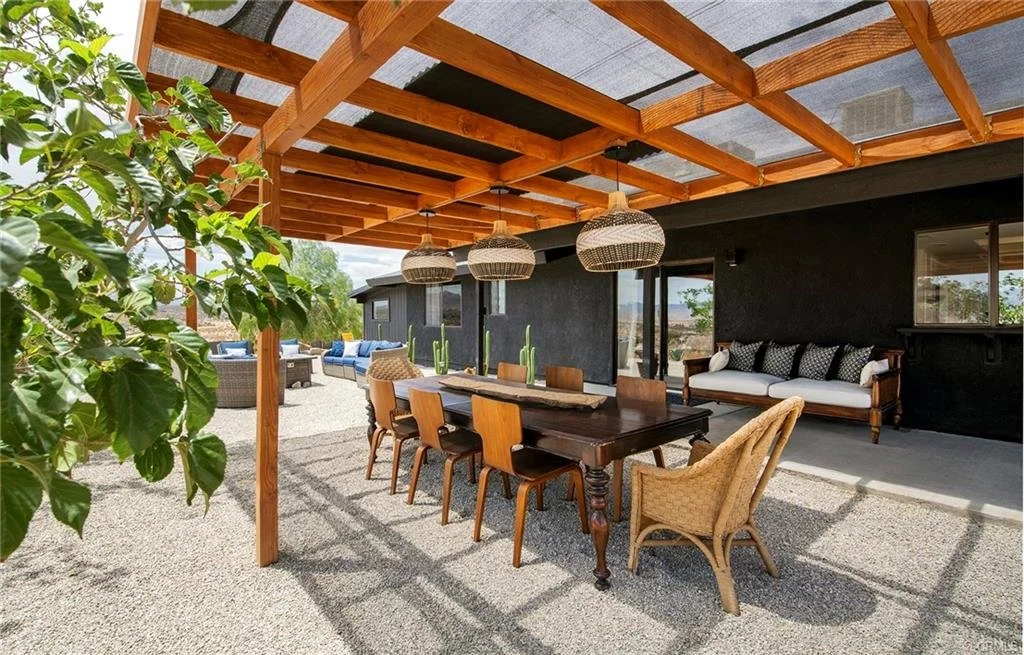 Welcome to the Hilltop Joshua Tree Designer Home of Dreams! Perched majestically atop a high vantage point, this estate offers an unrivaled panorama that stretches across the undulating hills of Joshua Tree National Park. Breathtaking vistas unfold before you, in an uninterrupted symphony of natural beauty. Indulge in the epitome of refined living where every facet of this property has been meticulously curated to embrace the awe-inspiring views. Seamlessly blending indoor luxury with outdoor comfort, this residence was designed for lavish entertaining with a masterful fusion of vintage charm and contemporary allure. The open floor plan unveils multiple living rooms and sitting areas that invite intimate reflections and grand gatherings alike. A formal dining room sets the stage for exquisite meals, while the chef's kitchen stands ready to cater to culinary aspirations. For moments of relaxation, the sleeping quarters provide a haven of tranquility. Large bedrooms exude luxury, while the expansive main bedroom suite redefines comfort & style. The bathrooms, completely remodeled, evoke spa-like grandeur with walk-in showers and modern fixtures. Art connoisseurs will revel in the curated vintage designer decor that graces the interiors. Unique pieces by luminaries such as Russell Woodward, Vintage McGuire, Brown Jordan, and more, infuse each space with an artistic narrative from a golden era reimagined! The desert landscape comes alive from your multiple shaded lounges and dining areas that seamlessly meld with the natural surroundings. As the sun paints the sky with its palette of colors, revel in the enchantment of the hills, The National Park, and the twinkling city lights of Joshua Tree Village below. By day, bask in the serenity of your private pool; by night, get lost in the stars from the warmth of your hot tub. A bathhouse, reminiscent of high-end resorts, offers convenience and luxury with its floor to ceiling tiled walk-in shower and bathroom, for true indoor/outdoor enjoyment! Bonus metal hangar/garage perfect for outdoor saloon, a game haven, or an extension of living space—let your imagination run wild (potential uses subject to SB County regulations). Large 2.5 acre lot tastefully adorned with desert flora and imposing granite and sandstone boulders. Remote feeling, yet still only 10 minutes to downtown Joshua Tree with its boutiques, evening markets, restaurants and cafes. Your piece of hi-desert magic awaits your arrival!