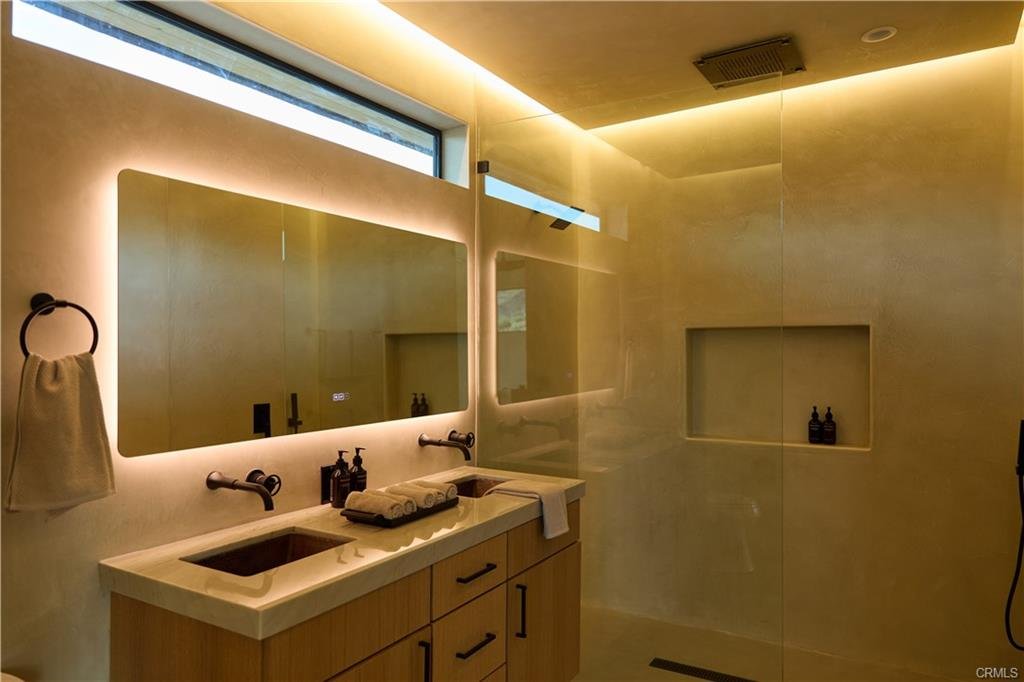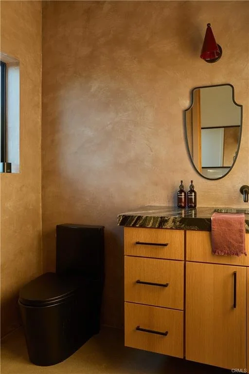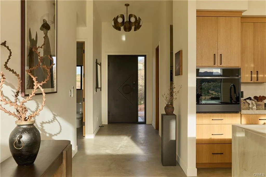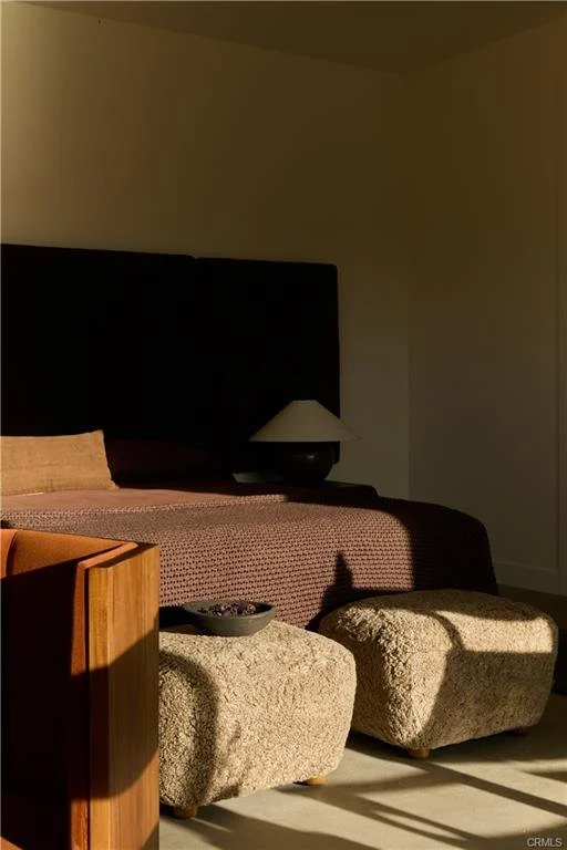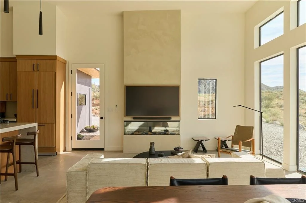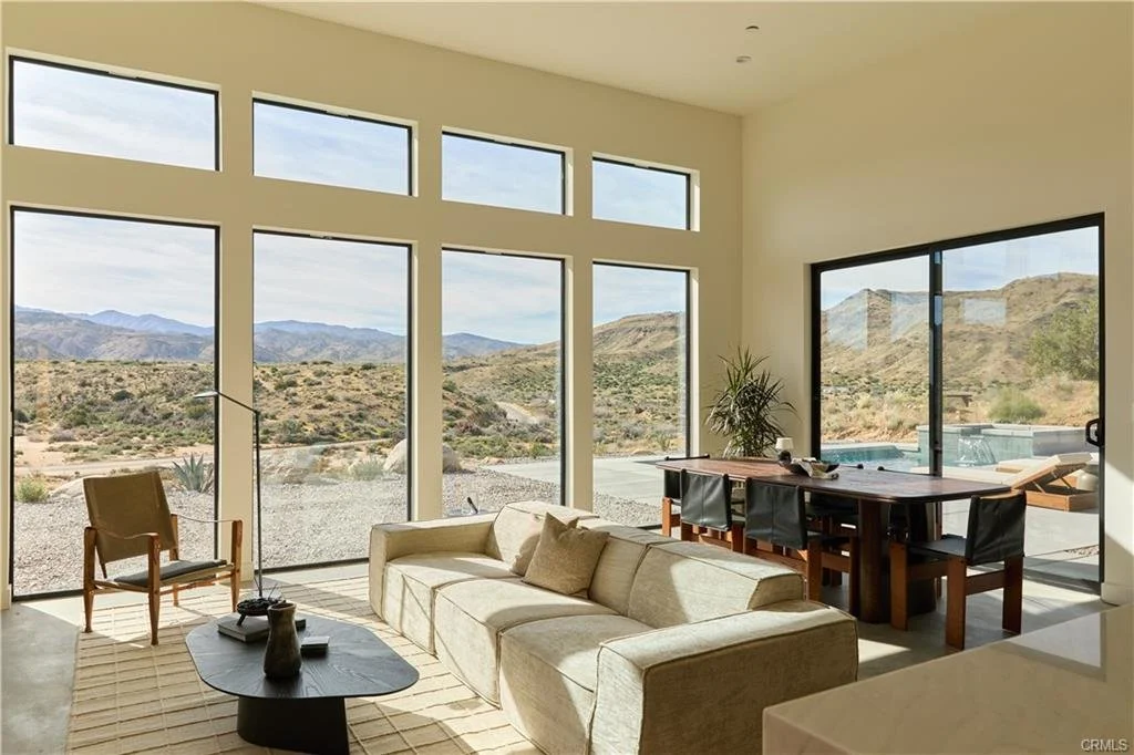 Welcome to Sorrel House, a custom-built architectural estate, set atop a protected bluff bordering protected Wildlands Conservancy and Pioneertown Mountains Preserve acreage that could remain untouched for generations. The views from this property are some of the finest in the hi-desert. Designed with a contemporary modern, minimalist/brutalist aesthetic, the home draws inspiration from Frank Lloyd Wright’s philosophy—“of the hill, not on the hill”—seamlessly integrating structure and landscape into Organic Modern design. The Santa Barbara smooth-finish stucco wrapping the home mirrors the tone of the surrounding buttes, creating a striking yet harmonious presence. Inside, custom earthen plaster walls, concrete floors, and hand-crafted white oak cabinetry deliver a refined, tactile desert-luxe experience. Oversized white oak doors and expansive sliders in every bedroom open effortlessly to the pool terrace, dissolving the boundary between indoor and outdoor living. The resort-caliber exterior features a large in-ground pool with waterfall spa, and a shaded dining pavilion just off the kitchen—perfectly oriented for sunrise coffees, golden hour dinners, and stargazing nights. The primary suite is a true sanctuary, with floor-to-ceiling tadelakt plaster, dual showers, and a dramatic wall-sunken overhead rain shower. Additional highlights include 3 bedrooms, 2.5 baths, a dedicated laundry room, and a large garage currently laid out as a yoga / fitness studio. Thoughtfully landscaped with native desert flora for beauty and low maintenance. Offered fully turnkey furnished. Bonus parcel with flat graded space, ideal for a future barn, studio, ADU, pickleball court or whatever your vision may inspire (buyer to check). Hike into The Preserve or walk over to Pappy & Harriet's for dinner & a show. Whether as a private retreat or a high-performing luxury rental, Sorrel House stands as a singular offering in one of the hi-desert’s most coveted settings.