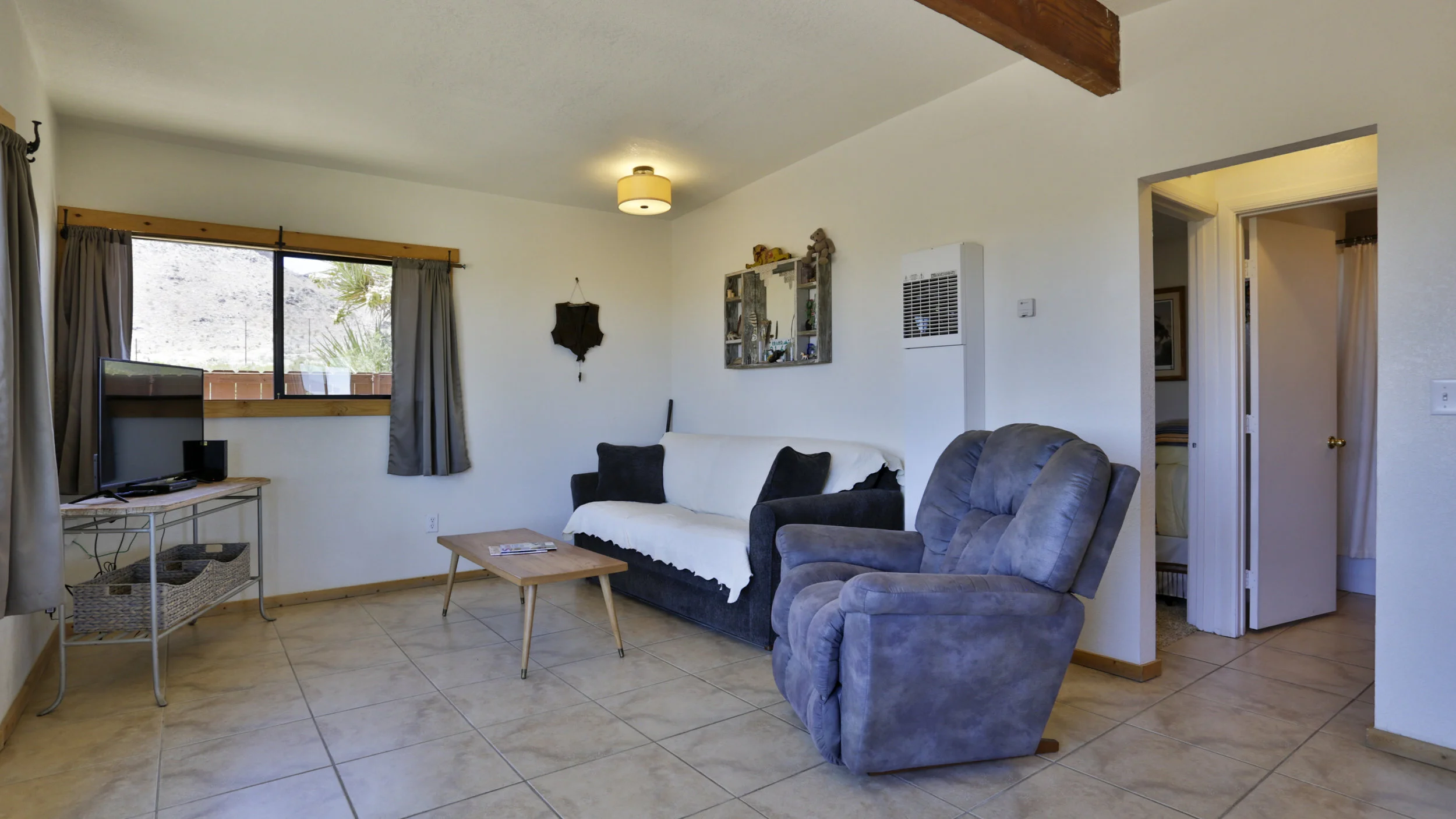 Majestic views across Flamingo Heights and the Mesa from the living room windows. Rare offering located on the west side of Hwy 247, nestled near the foothills. Large 5 acre compound with perimeter fencing and entry gate, plus a secondary wood fence surrounding main house providing private courtyard atmosphere. In addition to enclosed parking, garage features a guest studio and bathroom which is used as an Airbnb. Only minutes from Giant Rock Coffee House, La Copine and the Landers Brew Company and only a short distance further to The Integratron, Pioneertown and the National Park. Very clean and well-maintained property exudes pride of ownership. Tax records show a 1 bed, 1 bath home, but an additional room next to the main bedroom can double as a private office or a second bedroom. In addition, the studio apartment in the garage provides more sleeping space and privacy. Ideal purchase for either an artist looking for a workspace and garage in addition to the house, or for someone looking for an additional rental to help offset housing expenses. Plenty of room to roam beyond the confines of the property out into the open desert or down Pipes Canyon, or stay within your own Rancheria and let your dogs or children free to run without fear of passing traffic. Property is a must see for those searching for that special place in the Flamingo Heights or Landers area. Come join the burgeoning and active community that many are choosing along with Joshua Tree.