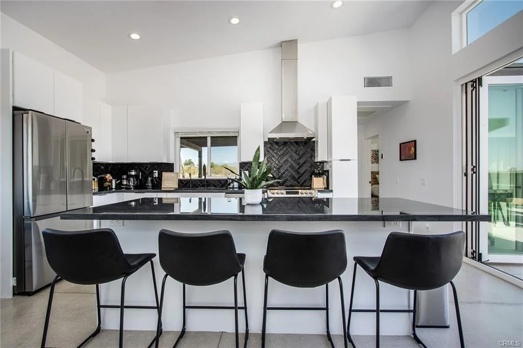 MODERN DESERT RETREAT: Recently built home featuring a private courtyard with a total of 15-windows – including sliding glass and folding doors – for authentic indoor/outdoor living. Surrounded by open space, with no immediate neighbors beside or behind the house where the courtyard faces, provides a serene sense of privacy. Property includes a firepit, bocce ball court, horseshoes, outdoor shower, electric car charger and even a putting green! The main and secondary bedrooms both have glass doors opening to the courtyard. Smartly designed split-floorplan with the primary en-suite bedroom on one side of the home for privacy and both guest rooms on the opposite side. Each wing also has zoned heating/cooling. Exquisite great room with open space for socializing and a large kitchen island that doubles as a breakfast bar or hang spot. Kitchen is finished with extra high-quality quartzite counters, sleek cabinetry and herringbone pattern black tile backsplash. No expense spared floor-to-ceiling tile work in both bathrooms. Spacious 3-bed, 2-bath design. FULLY-FURNISHED/TURNKEY. Currently an active Airbnb. Located in the heart of North Joshua Tree on a large 2+ acre parcel. Convenient to town for shopping and dining and only a short drive to the National Park. Stunning views of the nearby Bartlett Mountains to the south, within hiking distance of the front door.