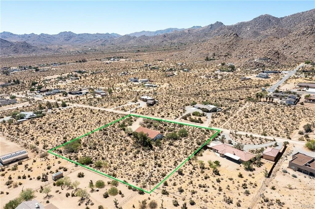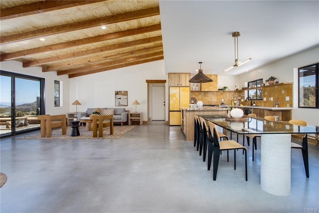PRIVATE RESERVE: Exquisitely redesigned hillside home near the National Park with views of rocky peaks to the south and the basin’s ancient dry lakebed in the distance below. An intimate garden of native plants with carefully curated walking paths, complete with original art compliment the serene surroundings, providing additional privacy. Relax out back on the newly built wood deck with an integrated cedar spa and custom built-in gas gabion-style fire-pit. Step inside to the great room and adjacent kitchen/dining area, featuring a stunning marble island countertop, carefully crafted handmade Mexican clay Zia tile backsplash and integrated glass dining table designed and constructed by Studio Collab. Socialize in the living area with pine wood ceiling treatments, lime-wash plaster painted fireplace accents with an intricately tiled mantel and hearth. Polished concrete floors with ash wood baseboards tie the organic ceiling to the floor, further softened by additional ash storage cabinet doors throughout. The primary ensuite bedroom features floor-to-ceiling penny tiles, a custom floating vanity and shelf with handmade concrete mustard color vessel sinks by Concretti Designs. The guest bathroom utilizes handmade glazed brick tiles by Fireclay Tile, amid the custom built-in tiled tub surround, finished with Portola’s Roman Clay plaster wall & ceiling treatment to dazzling effect. Subtle and understated, this carefully planned and executed home sets a new standard for the emerging designs for which Joshua Tree is fast becoming renown. Truly no expense spared to achieve these results, which, set in its private, natural setting for true indoor/outdoor living delivers the very best Joshua Tree has to offer for the discerning buyer.