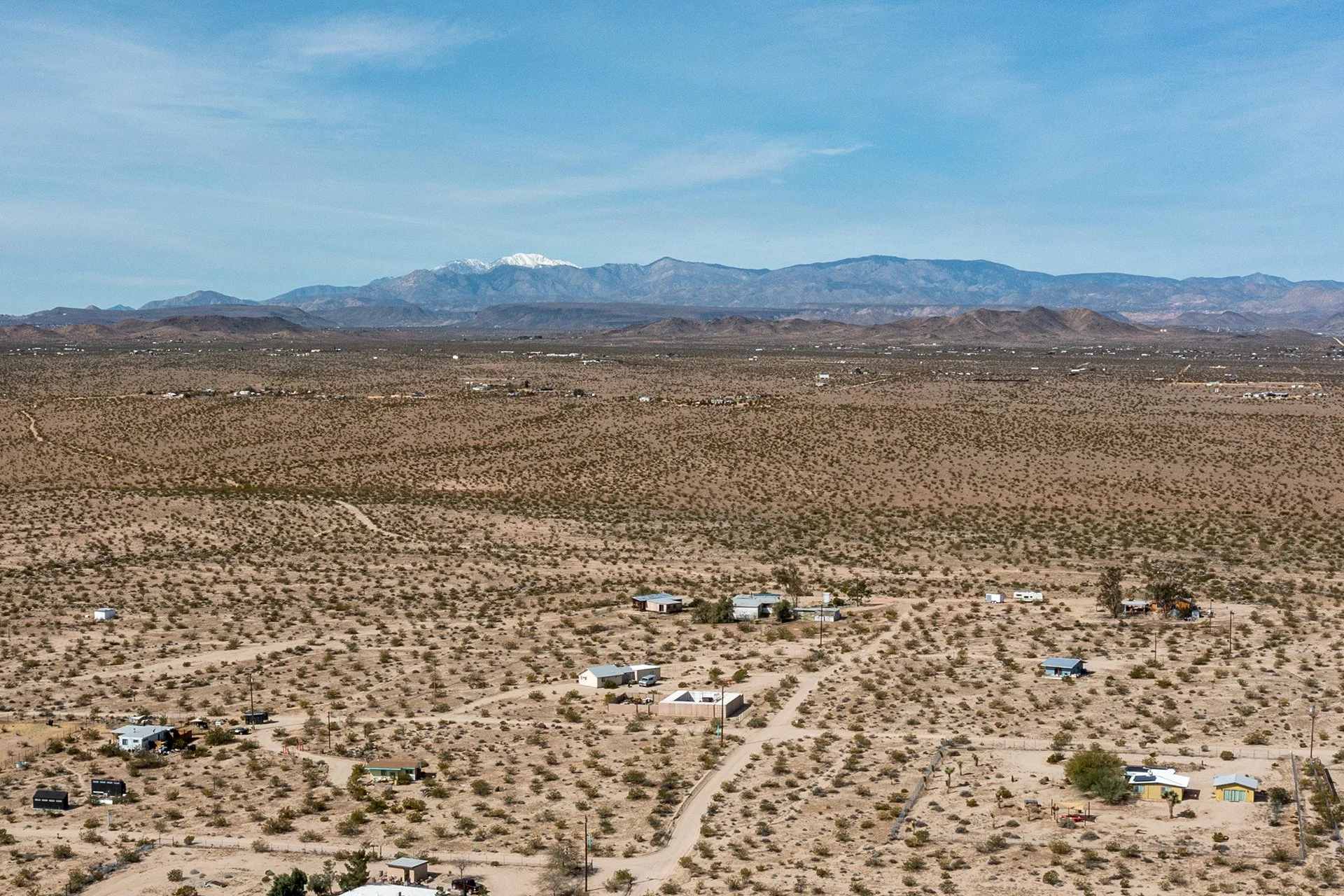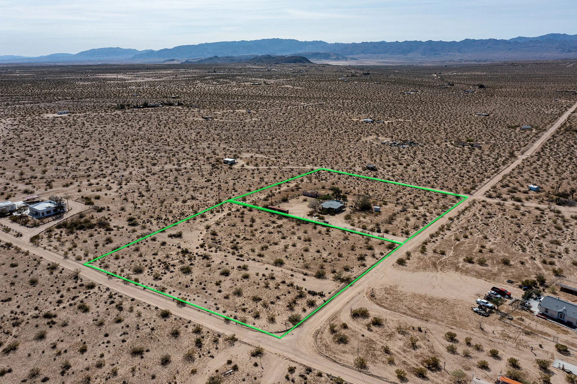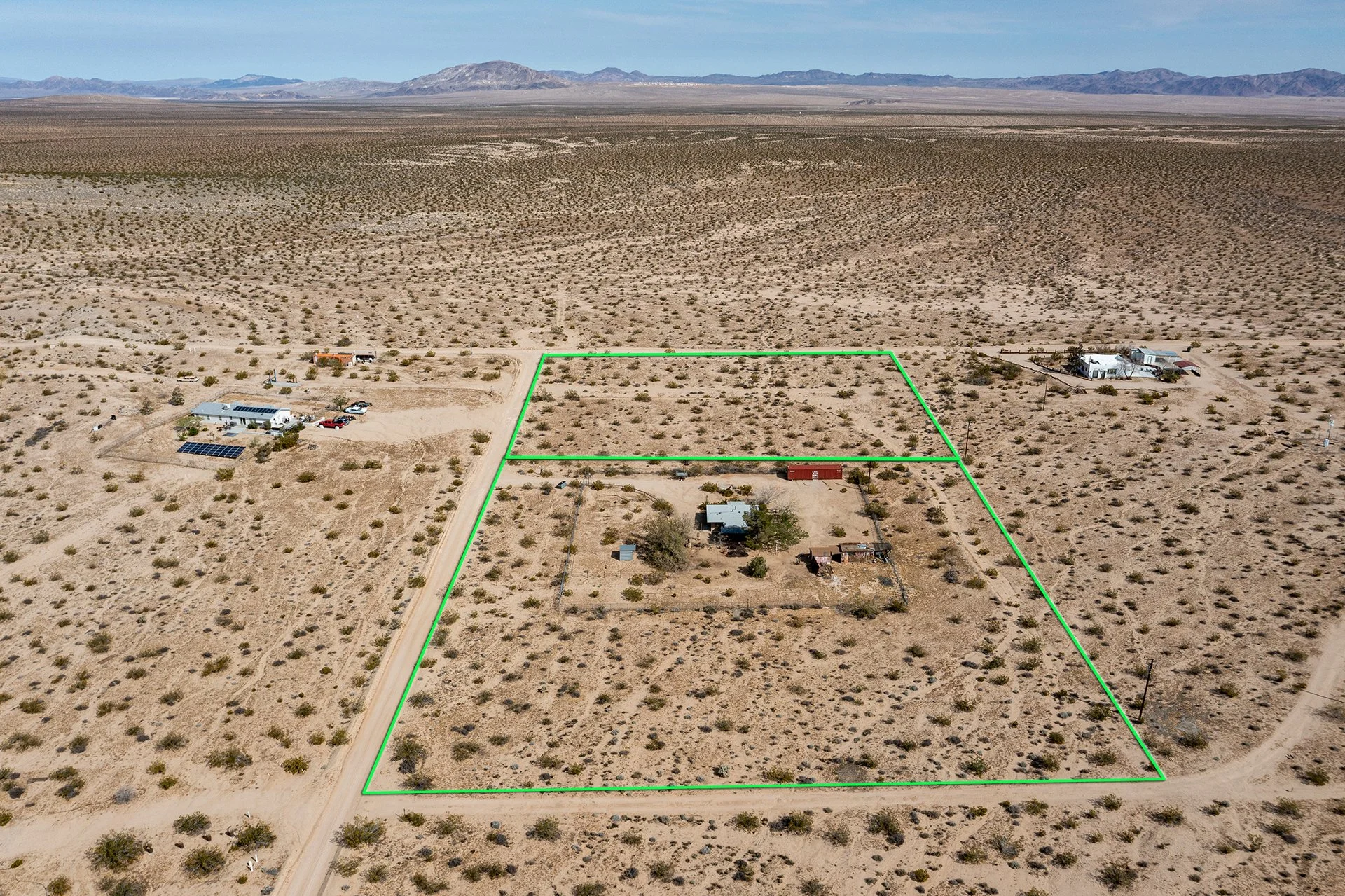 BEST LOCATION/PRICE presently in Joshua Tree: Near End-of-Road atop a hill, overlooking Copper Mountain Mesa and National Park ridgelines to the south. Views of SoCal’s two highest mountains - San Jacinto & snowcapped San Gorgonio. Arguably one of the finest locations in Joshua Tree for those seeking remote solitude for well under $300k. Nearly 5-ACRES of supreme beauty, spread over 2-parcels, providing future investment possibilities. Two parcels allow for 2 Primary Homes (SFRs) and 2 Guesthouses (ADUs) – as a result, Buyer could build three additional structures a total of 4 permitted structures to live in (buyer to investigate w County). Current home includes new dual-pane windows, new water heater, new refrigerator, new ceiling fans and a new insulation/dry-wall in ceiling of main room for heating/cooling efficiency. Mature landscaping and shade trees. Ductless mini-split AC/Heating. Container included for extra storage space. For those looking for their desert dream getaway, look no further. Note, Green lines demarcating parcel borders are approximate and not the result of a survey. Directions – DO NOT USE GPS or Google maps – instead, follow these directions: Go north on Border Ave, right (east) on Winters Rd, the left (north) on Mt Nebo Rd. Home located at top of hill on the right. Or find via APN: 0632-322-24
