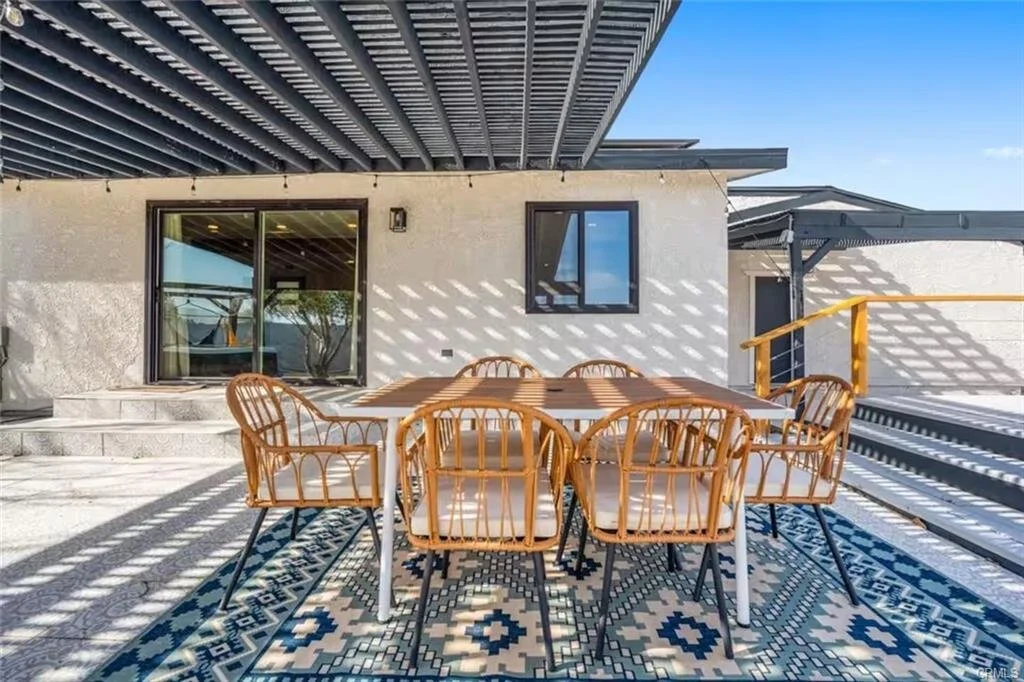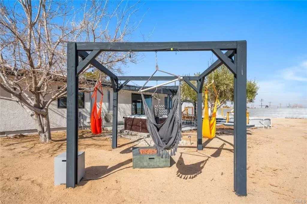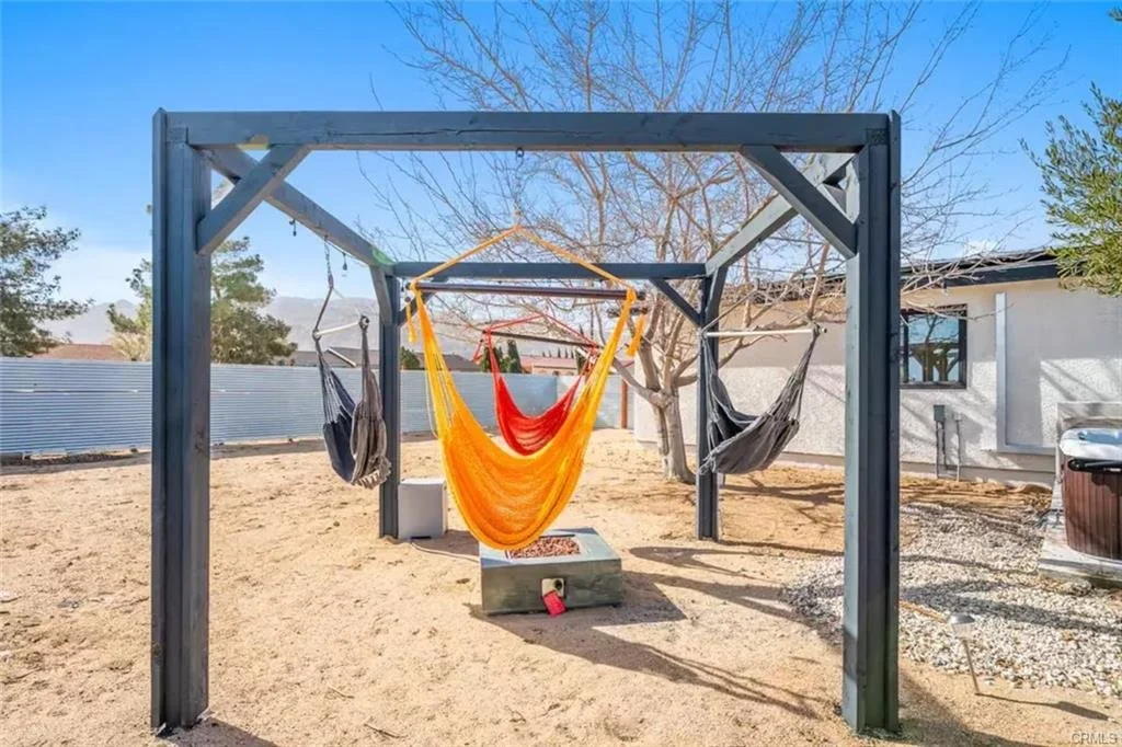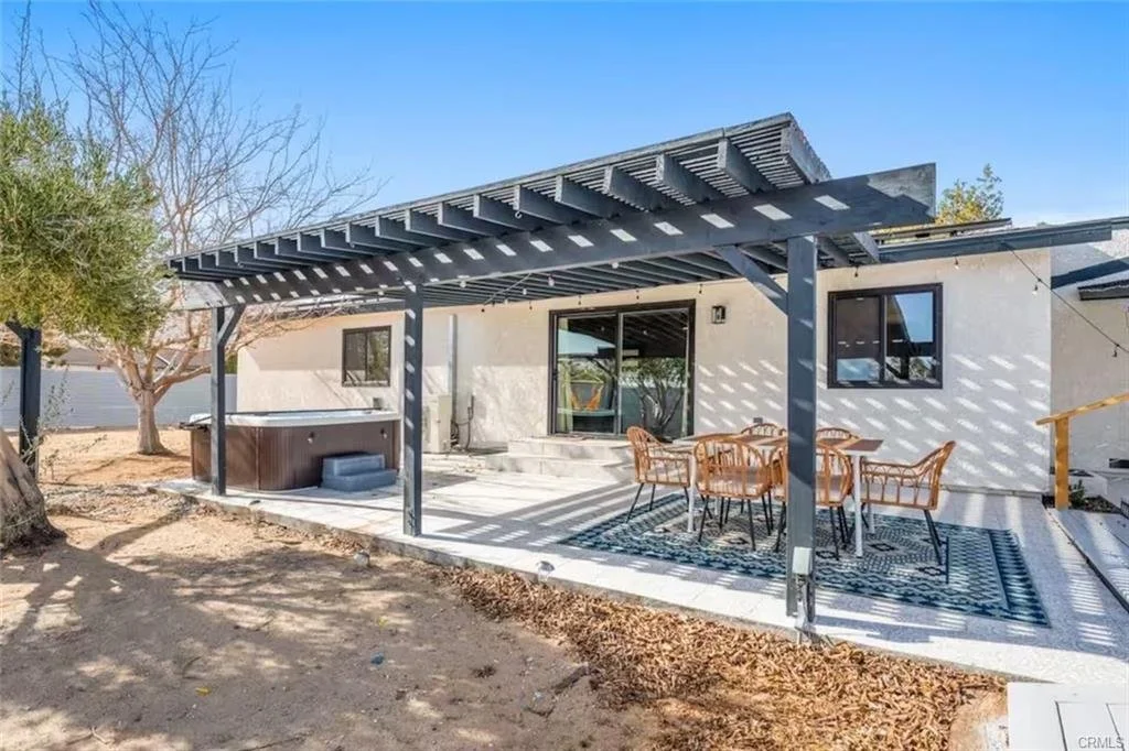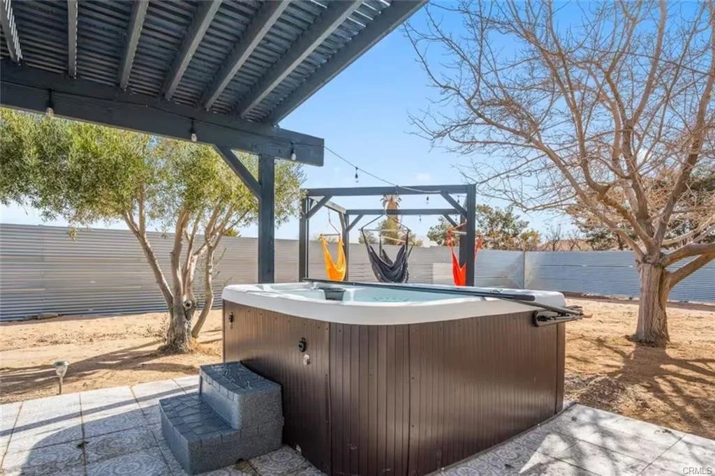 OASIS HOUSE: Meticulously Remodeled & Updated home, including new kitchen cabinetry, quartz countertops, counter-to-ceiling tile backsplash and ALL new appliances. Engineered flooring throughout. Exposed beam in living area, provides the perfect organic aesthetic touch. Both bathrooms are also fully upgrades, with new vanities and floor-to-ceiling custom tile work in the luxurious walk-in showers. The beautifully finished bedrooms feature sublime design details. The garage has been transformed into the ultimate lounge. Entire house is updated with zoned ductless mini-split AC/Heating units for efficiency. Utility room features new washer and dryer. The fully-fenced, private backyard is perfect for children, pets, family and friends and features a cowboy pool, hot tub, fire pit + pergola w/ hanging hammock chairs for socializing and stargazing. Picturing yourself relaxing underneath the palm trees. The legendary 29 Palms Inn is only a short distance away for fine dining and only a short drive to the main entrance of Joshua Tree National Park for hiking and outdoor activities.