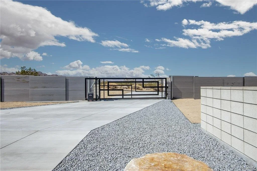 BEST OF BEST: Custom New Construction Modern Home in sought after South Joshua Tree for LESS THAN $500 per square foot! Desirable Panoramic Heights neighborhood. Walking distance to National Park. Home features incredible 14’ ceilings at highest point, polished concrete floors throughout for ease of maintenance and ductless mini-split zoned cooling & heating for energy savings, along with on-demand water heater for additional efficiency. Solar panels are fully paid. Kitchen features extra-large 48- inch convection/induction chef’s range with 5 burners and center island with waterfall quartz counters. Walk-in shower with pebble flooring. Free standing detached, finished and insulated garage, also complete with ductless mini-split AC/Heating to use as extra bedroom, office, studio or easy conversion to a permitted guesthouse (ADU). Tastefully landscaped property with drought resistant plants and carefully demarcated gravel and boulders. Waist-high block wall along huge front patio creating warm social space to sit and gaze out at San Gorgonio – the tallest mountain in SoCal. Additional private patio out back as well, which includes a permitted SPA/HOT TUB installed on custom pad and ready to use! Perimeter lighting around base of house exterior. Custom made metal entry gate from street with solar-controlled electric motor. Entryway to private backyard also features a custom fabricated metal gate. ENTIRE LARGE 1-ACRE lot is fully-fence with stressed high-quality corrugated steel, sparing no expense on this custom build.