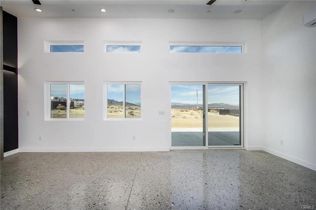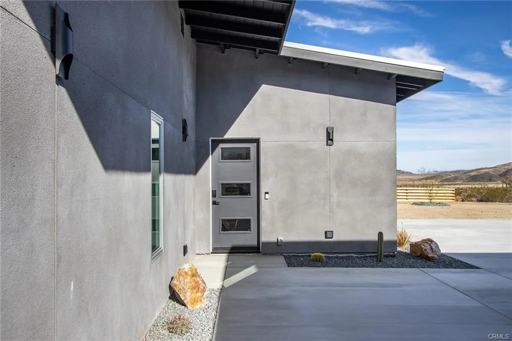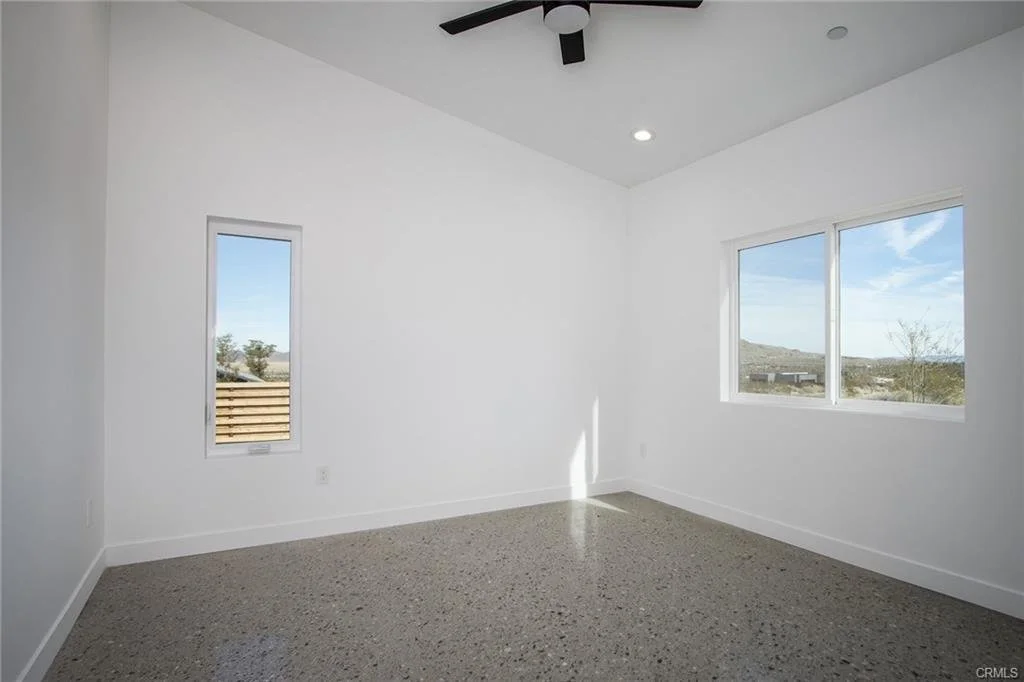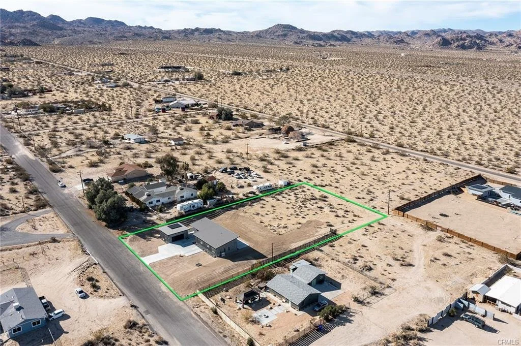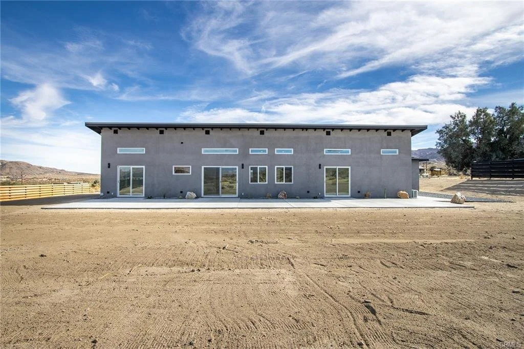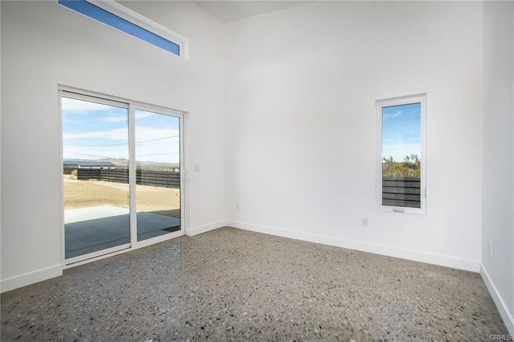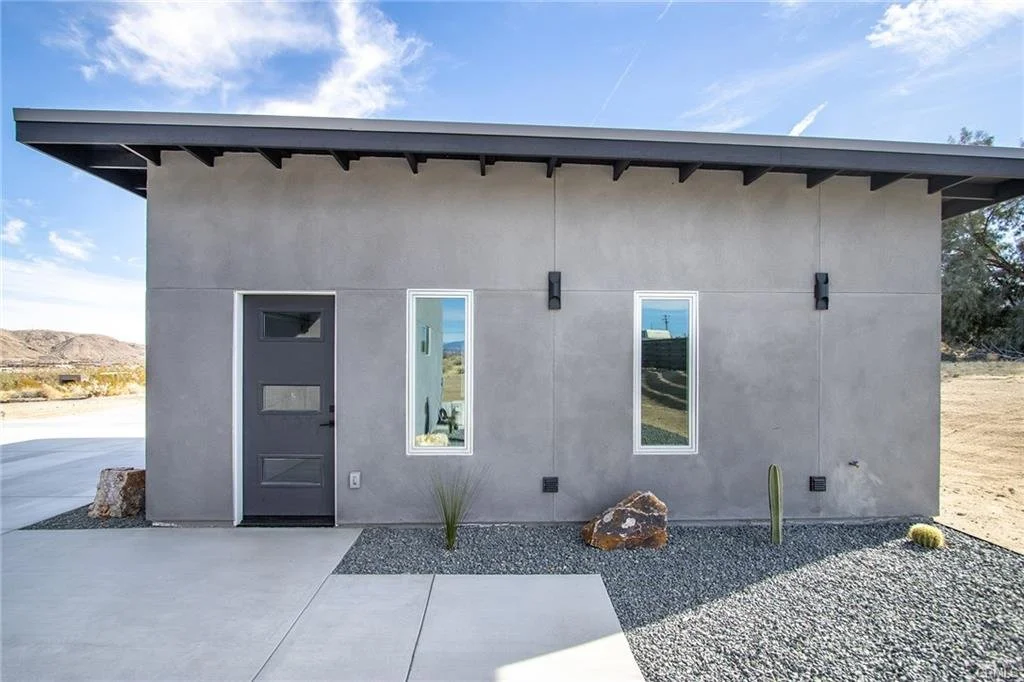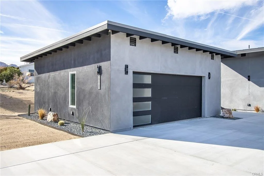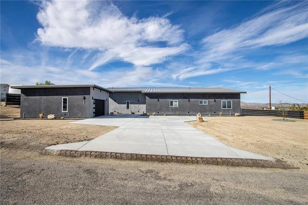 New Construction Modern Home in sought after South Joshua Tree. Walking distance to National Park. Home features incredible 14’ ceilings at highest point, polished concrete floors throughout for ease of maintenance and ductless mini-split zoned cooling & heating for energy savings, along with on-demand water heater for additional efficiency. Solar panels are fully paid. Kitchen features extra-large 48-inch convection/induction chef’s range with 5 burners and center island with waterfall quartz counters. Walk-in shower with pebble flooring. Free standing detached, finished and insulated garage, also complete with ductless mini-split AC/Heating to use as extra bedroom, office, studio or conversion to a permitted guesthouse (ADU). Tastefully landscaped property with drought resistant plants on a LARGE 1+ ACRE LOT. Snowcapped San Gorgonio – SoCal’s tallest mountain – visible from the living room, and bedrooms. Large private porch in the backyard. Best priced new construction in South Joshua Tree.