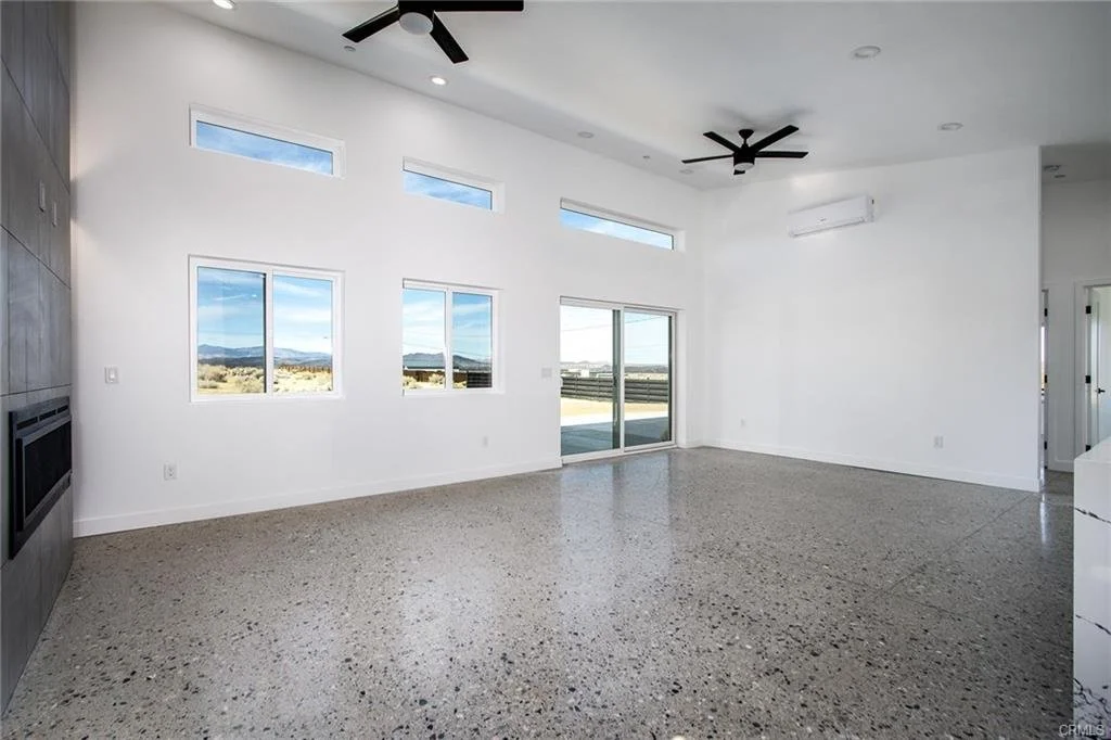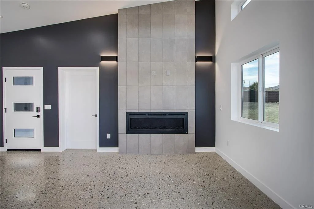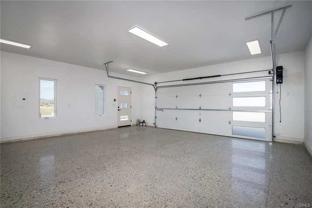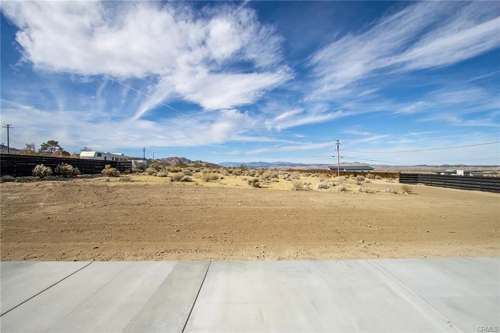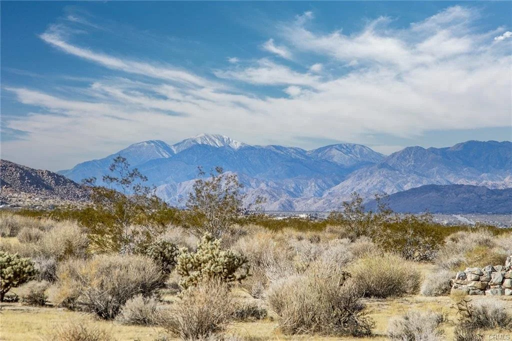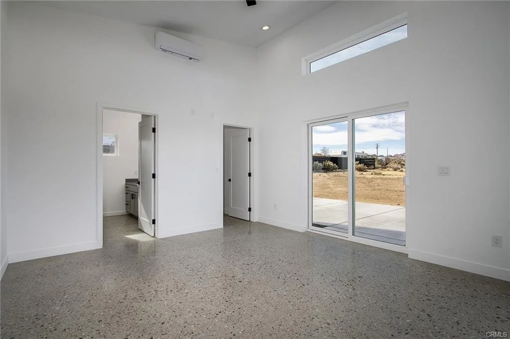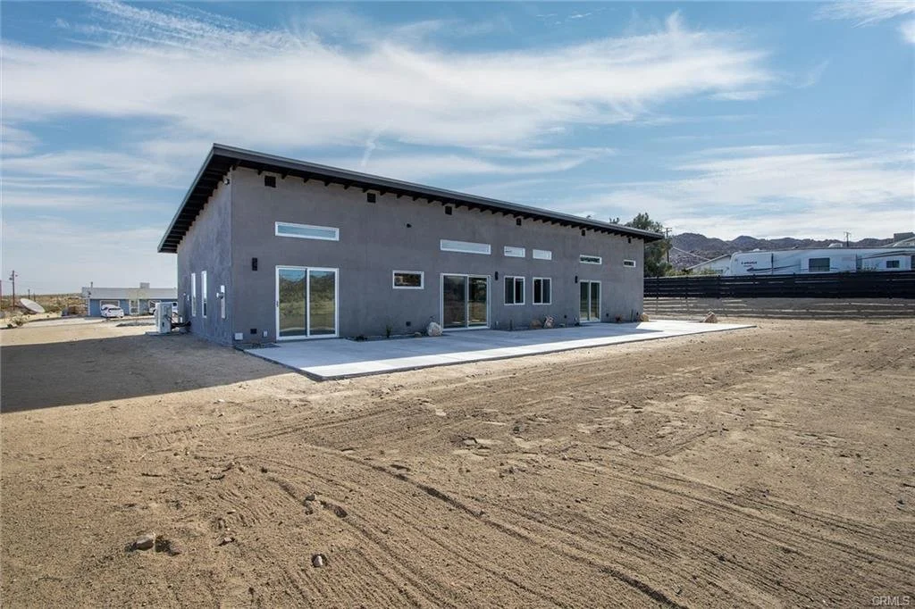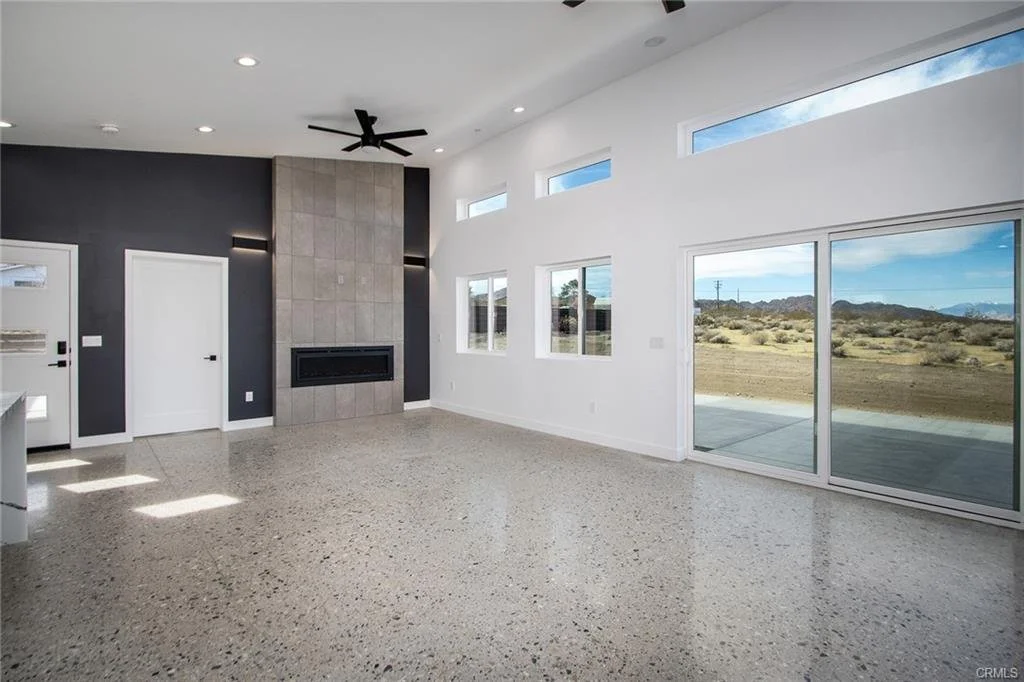 New Construction Modern Home in sought after South Joshua Tree. Walking distance to National Park. Home features incredible 14’ ceilings at highest point, polished concrete floors throughout for ease of maintenance and ductless mini-split zoned cooling & heating for energy savings, along with on-demand water heater for additional efficiency. Solar panels are fully paid. Kitchen features extra-large 48-inch convection/induction chef’s range with 5 burners and center island with waterfall quartz counters. Walk-in shower with pebble flooring. Free standing detached, finished and insulated garage, also complete with ductless mini-split AC/Heating to use as extra bedroom, office, studio or conversion to a permitted guesthouse (ADU). Tastefully landscaped property with drought resistant plants on a LARGE 1+ ACRE LOT. Snowcapped San Gorgonio – SoCal’s tallest mountain – visible from the living room, and bedrooms. Large private porch in the backyard. Best priced new construction in South Joshua Tree.