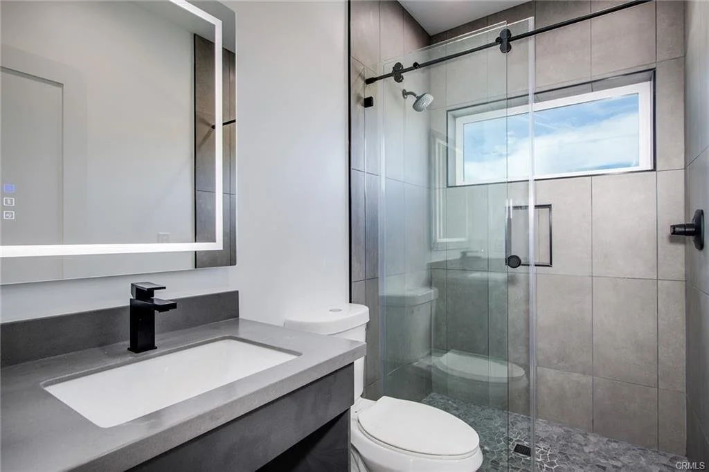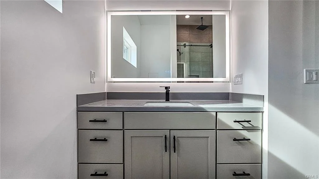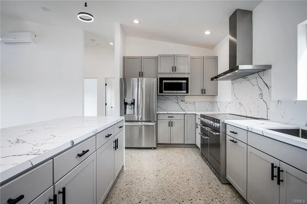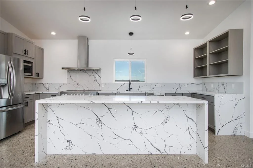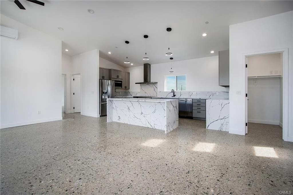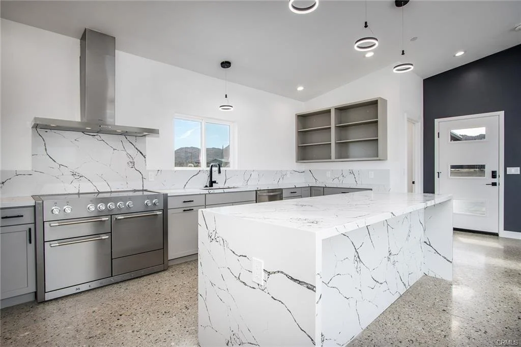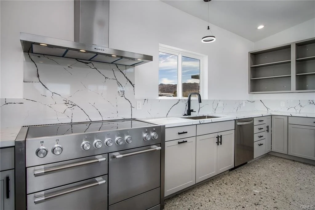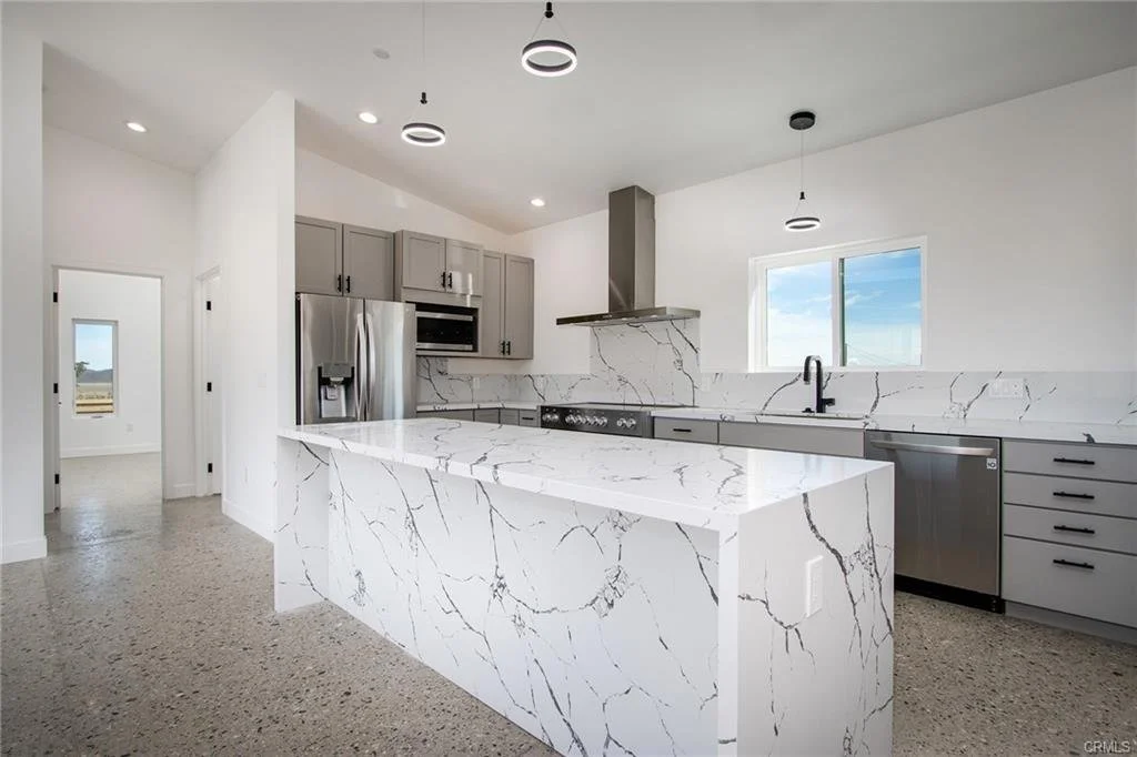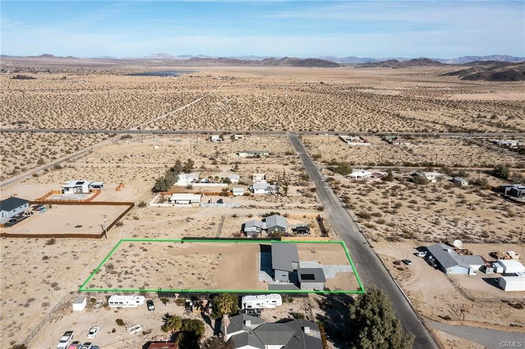 New Construction Modern Home in sought after South Joshua Tree. Walking distance to National Park. Home features incredible 14’ ceilings at highest point, polished concrete floors throughout for ease of maintenance and ductless mini-split zoned cooling & heating for energy savings, along with on-demand water heater for additional efficiency. Solar panels are fully paid. Kitchen features extra-large 48-inch convection/induction chef’s range with 5 burners and center island with waterfall quartz counters. Walk-in shower with pebble flooring. Free standing detached, finished and insulated garage, also complete with ductless mini-split AC/Heating to use as extra bedroom, office, studio or conversion to a permitted guesthouse (ADU). Tastefully landscaped property with drought resistant plants on a LARGE 1+ ACRE LOT. Snowcapped San Gorgonio – SoCal’s tallest mountain – visible from the living room, and bedrooms. Large private porch in the backyard. Best priced new construction in South Joshua Tree.
