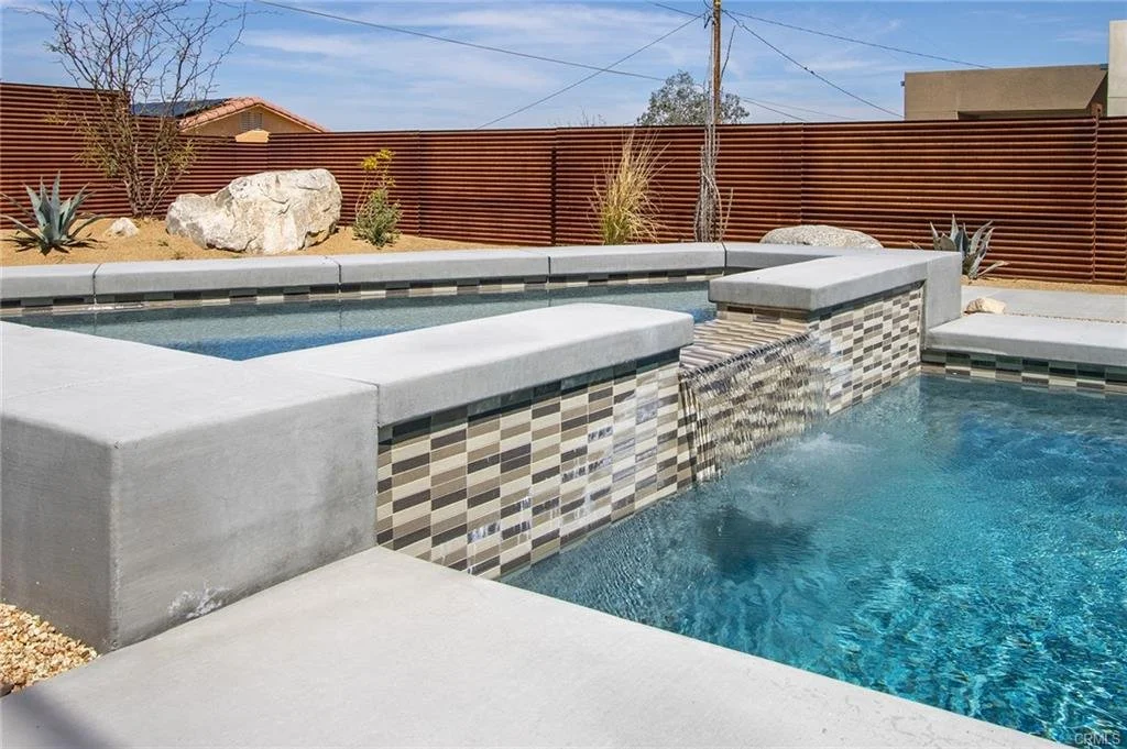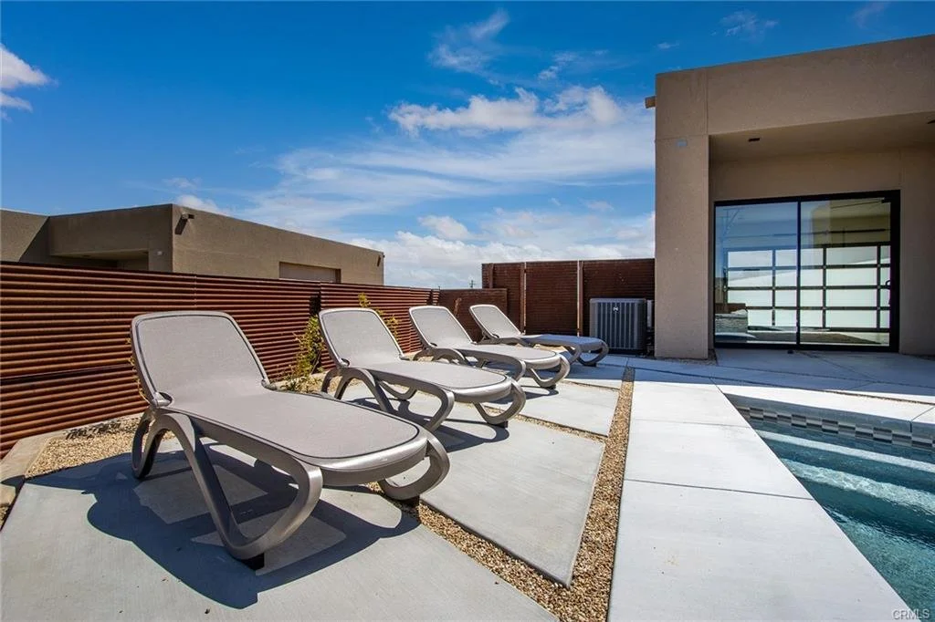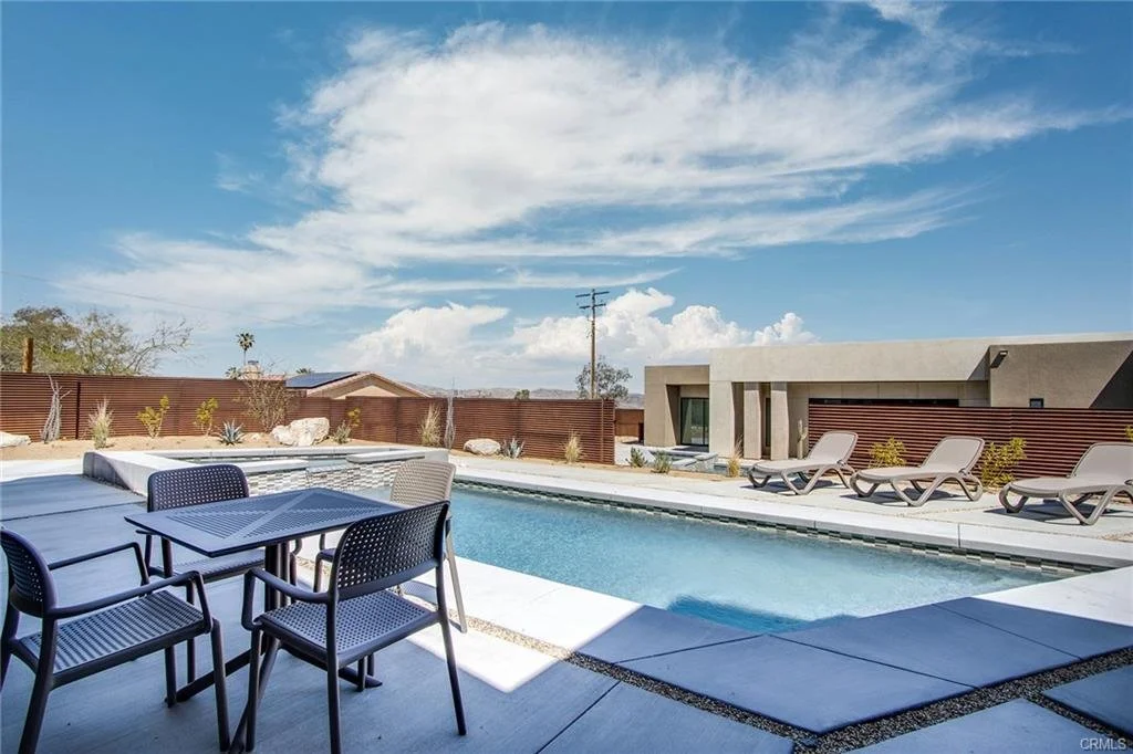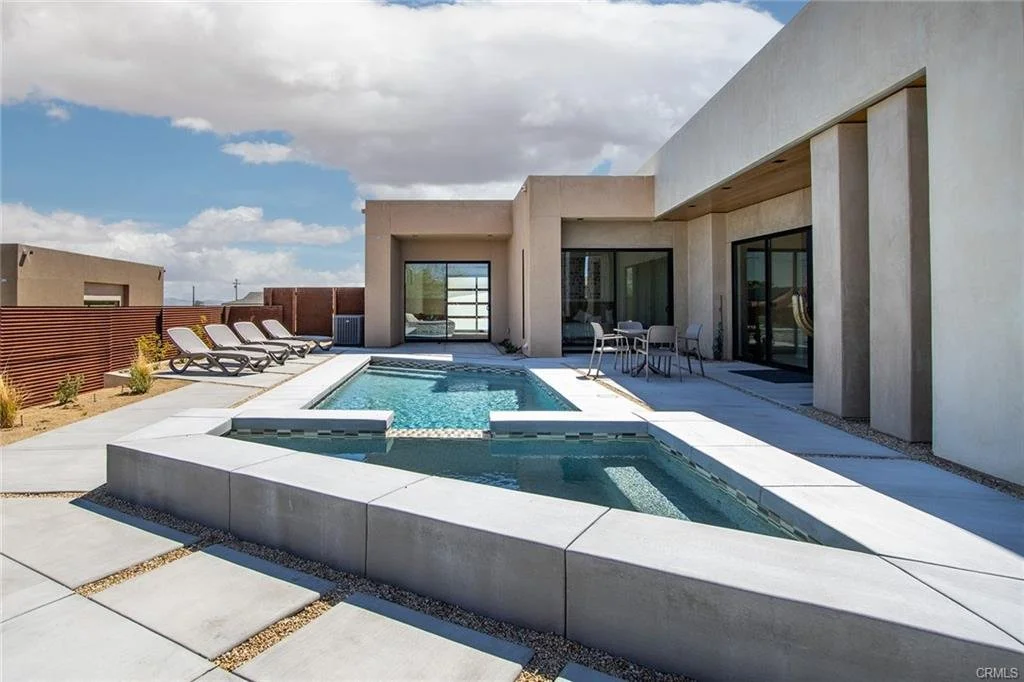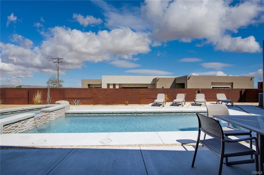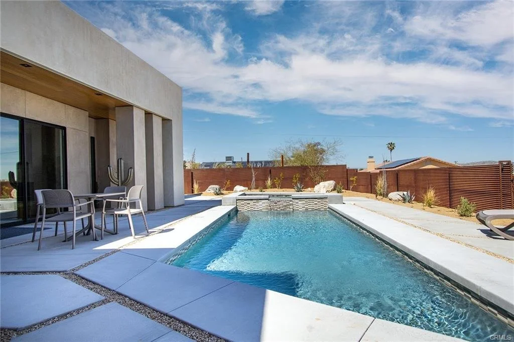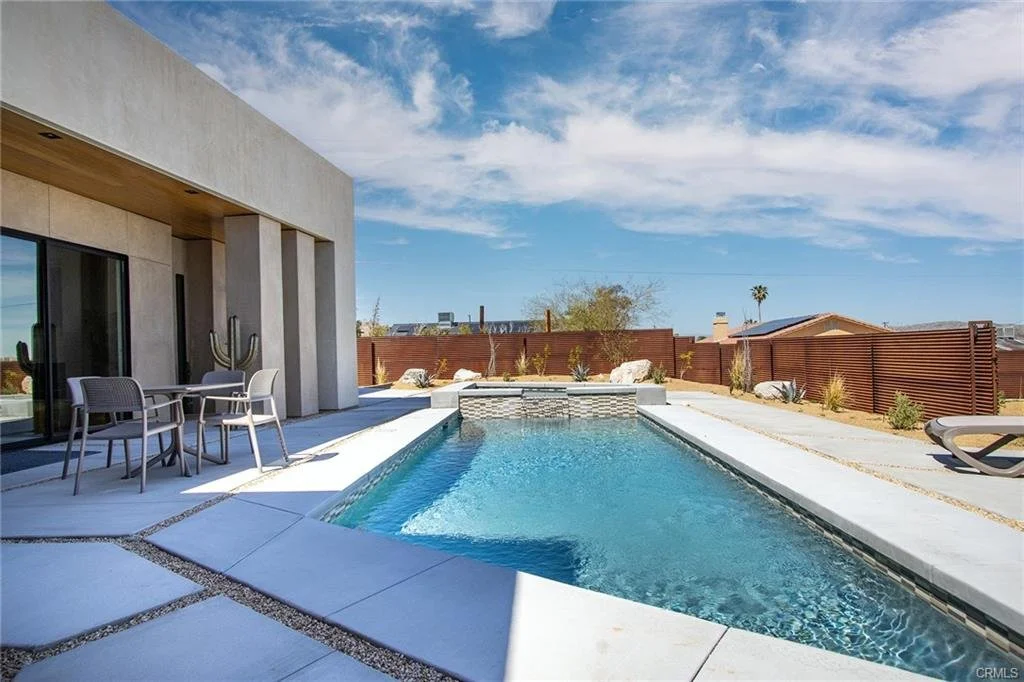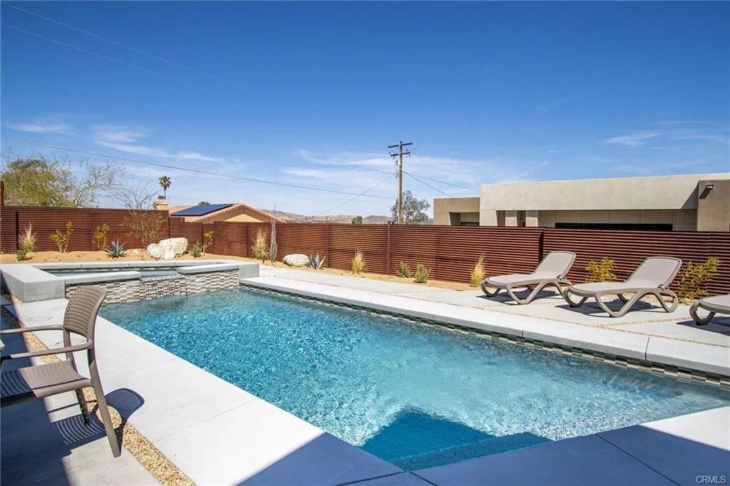 INCREDIBLE VALUE: High Quality New Construction w Custom Pool/Spa. Evoque Modern’s stunning contemporary designs have raised the bar for new construction and set a new standard for contemporary modern living in Joshua Tree. The newest builds are located just over the border in 29 Palms near the gateway to the Joshua Tree National Park’s Indian Cove entrance. Fully landscaped with drought resistant plants. Turnkey, Fully-Furnished, down to every detail, with high-quality interior design and furnishings reflecting the exceptional quality and attention to detail both inside and out, right down to poolside furniture. All new appliances, including washer & dryer. Features include large-format tile flooring, high-quality tongue & groove ceilings, double waterfall quartz island in kitchen. Floor-to-ceiling venetian plaster (micro cement) in walk-in showers. Fully finished garage with AC/heating and sealed epoxy floors to use as a game room, studio, work-from-home office or even as additional living space. Perfect primary residence for buyer looking to move in without shopping for furniture, bedding or even towels as all are included! Or purchase as a vacation getaway that doubles as an Airbnb. Two new homes, built side-by-side but with different interior designs provides a great investment opportunity for friends, family or business partners to purchase both homes together or separately and share management duties, and then meet up to spend time together in the desert, but in your own separate homes. A section of fencing between the pools has been custom built on steel rollers to slide open and closed so that both private backyards can interact if desired (or simply lock the gate for complete privacy). Simply put, there are no other new construction homes in the Joshua Tree Area (Morongo Basin) built to this level of excellence near this price. Even at far higher prices, few builders include a custom inground pool & spa and landscaping, not to mention furnishings, art and linens! Brand new, never lived in. For those who have consulted General Contractors and priced out construction fees, pool build-out costs, interior design prices and furniture expenses, it is clear that no one can match this price for such a complete turnkey new construction property.