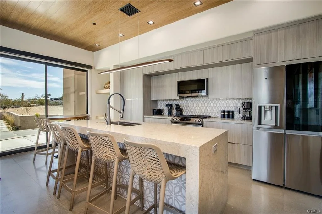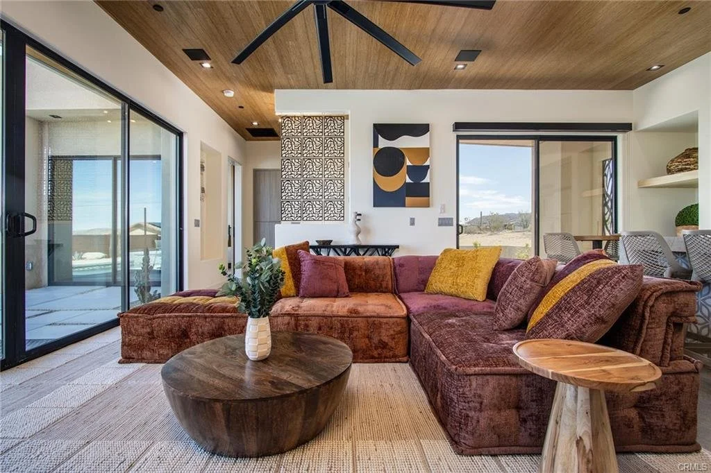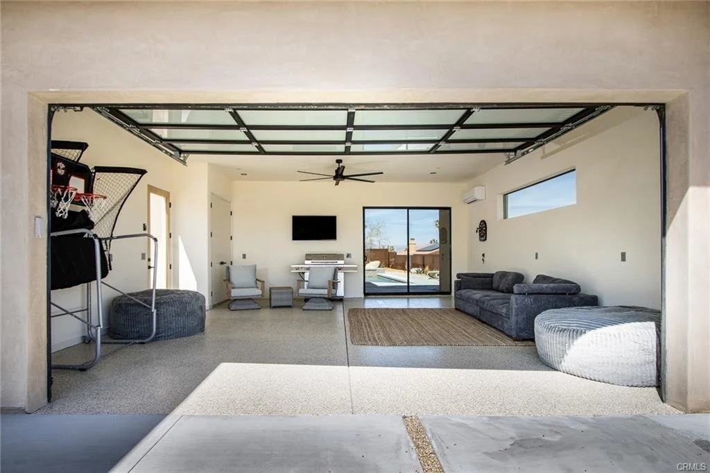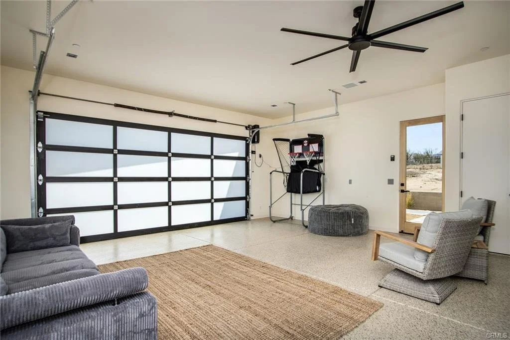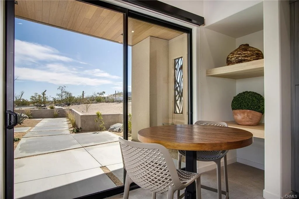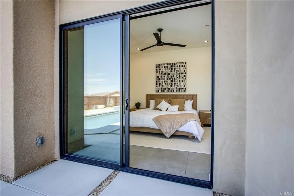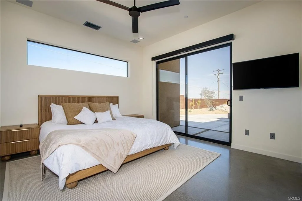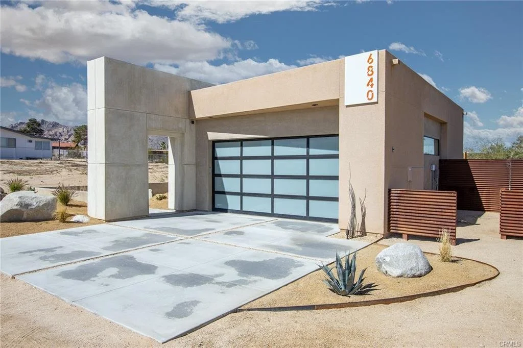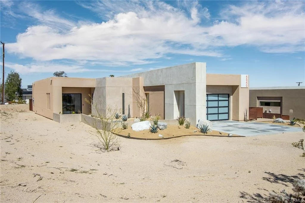 INCREDIBLE VALUE: High Quality New Construction w Custom Pool/Spa. Evoque Modern’s stunning contemporary designs have raised the bar for new construction and set a new standard for contemporary modern living in Joshua Tree. The newest builds are located just over the border in 29 Palms near the gateway to the Joshua Tree National Park’s Indian Cove entrance. Fully landscaped with drought resistant plants. Turnkey, Fully-Furnished, down to every detail, with high-quality interior design and furnishings reflecting the exceptional quality and attention to detail both inside and out, right down to poolside furniture. All new appliances, including washer & dryer. Features include large-format tile flooring, high-quality tongue & groove ceilings, double waterfall quartz island in kitchen. Floor-to-ceiling venetian plaster (micro cement) in walk-in showers. Fully finished garage with AC/heating and sealed epoxy floors to use as a game room, studio, work-from-home office or even as additional living space. Perfect primary residence for buyer looking to move in without shopping for furniture, bedding or even towels as all are included! Or purchase as a vacation getaway that doubles as an Airbnb. Two new homes, built side-by-side but with different interior designs provides a great investment opportunity for friends, family or business partners to purchase both homes together or separately and share management duties, and then meet up to spend time together in the desert, but in your own separate homes. A section of fencing between the pools has been custom built on steel rollers to slide open and closed so that both private backyards can interact if desired (or simply lock the gate for complete privacy). Simply put, there are no other new construction homes in the Joshua Tree Area (Morongo Basin) built to this level of excellence near this price. Even at far higher prices, few builders include a custom inground pool & spa and landscaping, not to mention furnishings, art and linens! Brand new, never lived in. For those who have consulted General Contractors and priced out construction fees, pool build-out costs, interior design prices and furniture expenses, it is clear that no one can match this price for such a complete turnkey new construction property.
