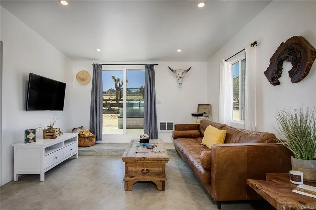 CALI AVE COMPOUND: South Joshua Tree hillside location perched above the basin and walking distance to ridgelines of boulder mountains. Divided between several living spaces, this unique compound features a fully remodeled downstairs living area, with custom built bathroom showcasing a bottled wall shower space that allows natural filtered light in to illuminate the handcrafted details; sit out front on the shade porch overlooking the Sunfair dry lakebed in the distance. Up a flight of steps over the enclosed garage stands a second large private living space whose windows face incredible boulder views. Below is the rabbit’s hole, a third modest, fully contained living space with a beautiful midcentury fireplace that oozes ambiance. A breezeway ties the compound together, providing yet more shade area against the summer sky. Wander through the many mature joshua trees on site providing a National Park feel. The terraced property also features an exterior social space above (once used for a large family wedding) featuring a pergola and an old west saloon structure – start the evening downtown at the nearby Joshua Tree Saloon and end the night at your own private saloon for safe, responsible partying! Hidden below the main structure sits an outdoor shower area. 4.6-Acres Total, split into 2 Legal Parcels (2.3 acres each), provides further value, permitting an additional home (SFR) and guesthouse (ADU). Rare, unusual southside offering for the adventurous entrepreneur.