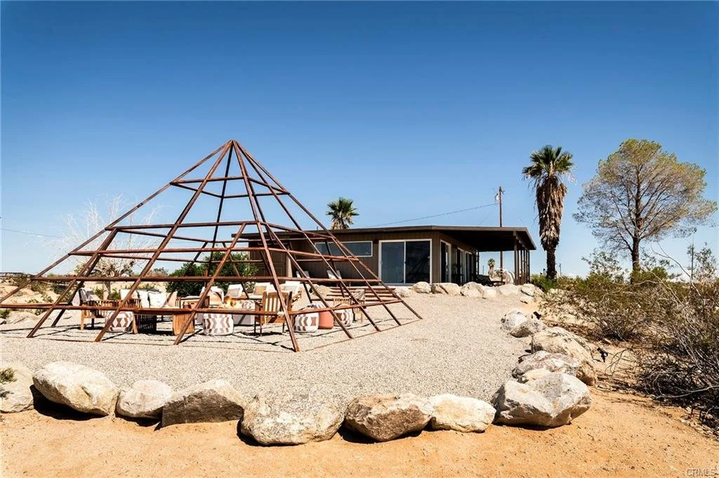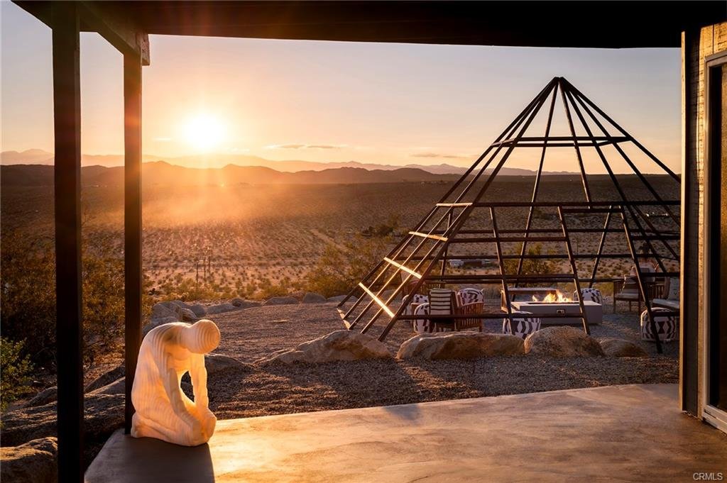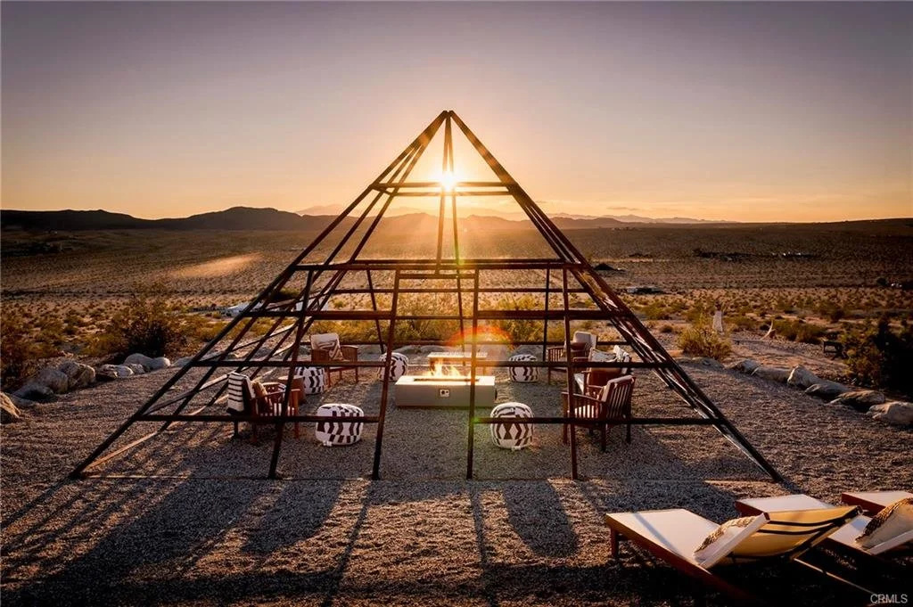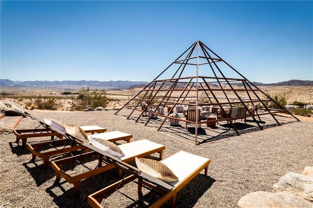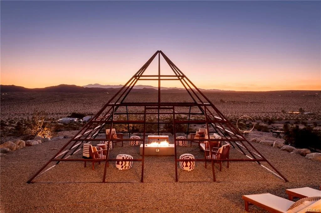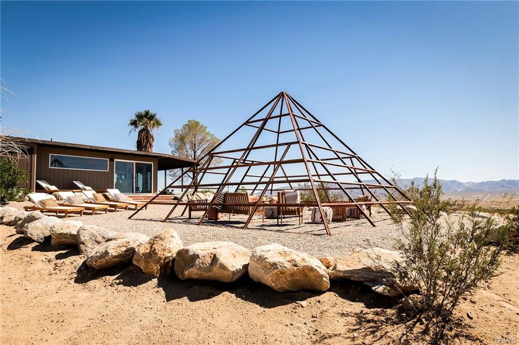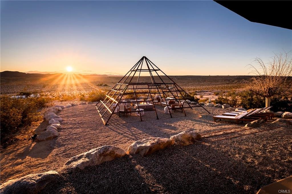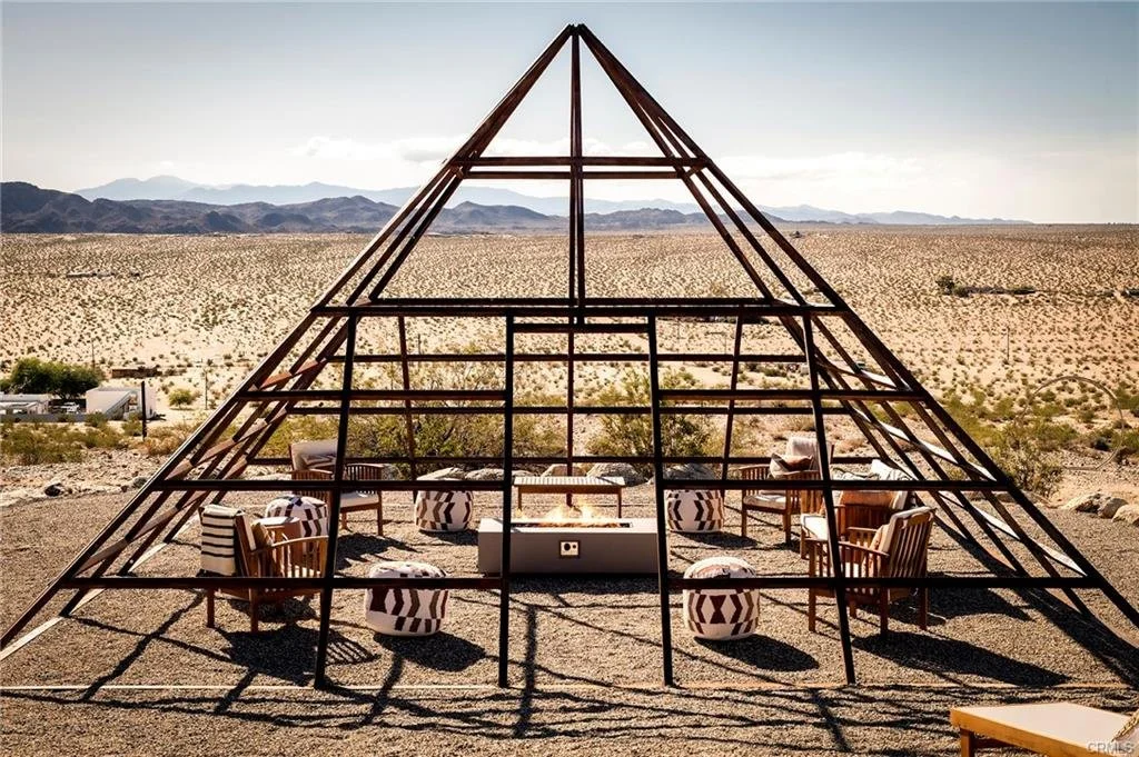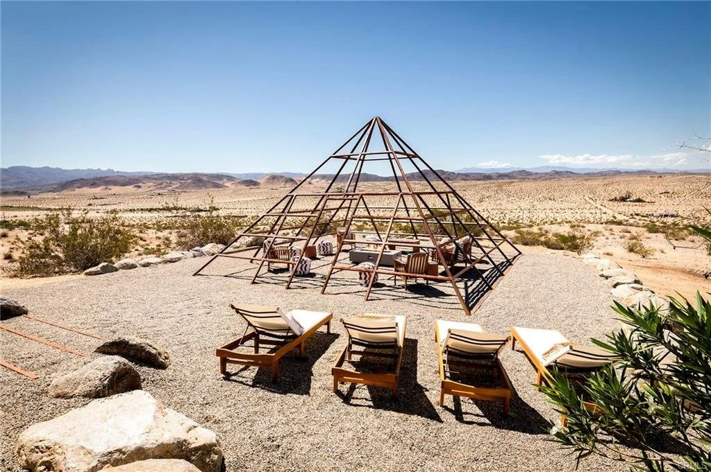 29 WEST PYRAMID HOUSE: Perched on the top of its own mountain, this striking 2-bedroom, 2-bathroom retreat delivers 360-degree views spanning Indian Cove in Joshua Tree National Park, Big Bear, and San Gregorio. Framed by dramatic imported boulders and pristine desert landscape, the property offers a rare blend of privacy, serenity, and natural beauty. At night, the dark skies transform into a stargazer’s dream, making this a true High Desert sanctuary. The centerpiece of the landscape is a bold steel-frame pyramid, measuring 24' x 24' x 14', positioned at the mountain’s edge. This dramatic outdoor structure creates a visual anchor and an unforgettable backdrop for both day and night desert living. Inside, the home is curated with Venetian plaster walls, lime wash finishes, and custom vertical plaster striping. The open floor plan is framed by expansive sliding glass doors and an 8-foot picture window, pulling the desert scenery directly into the living space. Spa-inspired bathrooms feature floating vanities, backlit mirrors, wood tile, and marble finishes, blending sophistication with soothing desert textures. A shaded porch extends from the living room, offering a peaceful vantage point for sunrise coffee or evenings under the stars. Custom channel lighting in the living room mirrors the sharp lines of the pyramid, emphasizing the interplay of geometry and desert landscape. The large kitchen showcases brand-new counters, custom cabinetry, and generous storage designed for both everyday use and stylish entertaining. Centrally located at the edge of 29 Palms and Joshua Tree, this property is just minutes from both villages, with easy access to shops, restaurants, and Joshua Tree National Park. Blending bold design, natural elements, and complete privacy, this mountain-top retreat embodies modern desert living at its finest, the kind of home you’d expect to see in the pages of Architectural Digest.