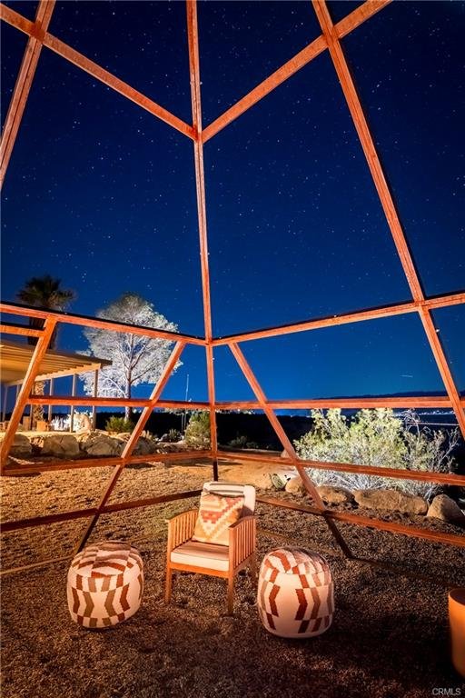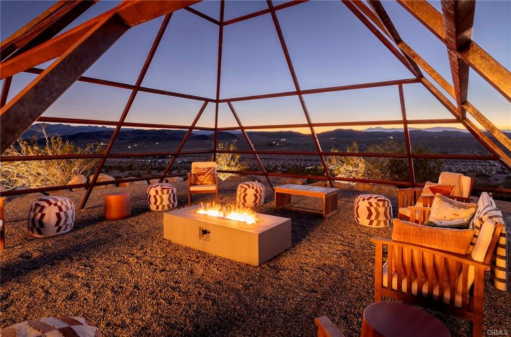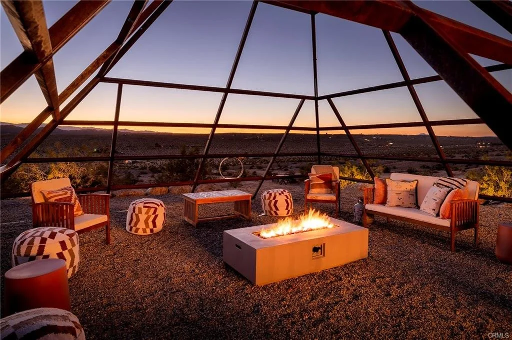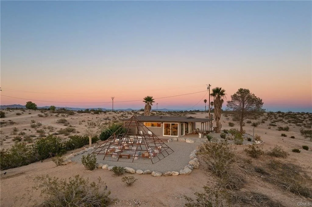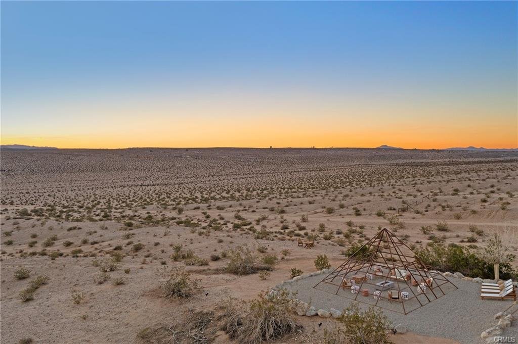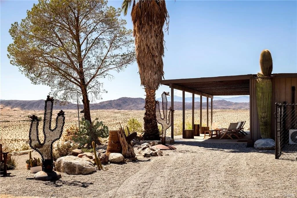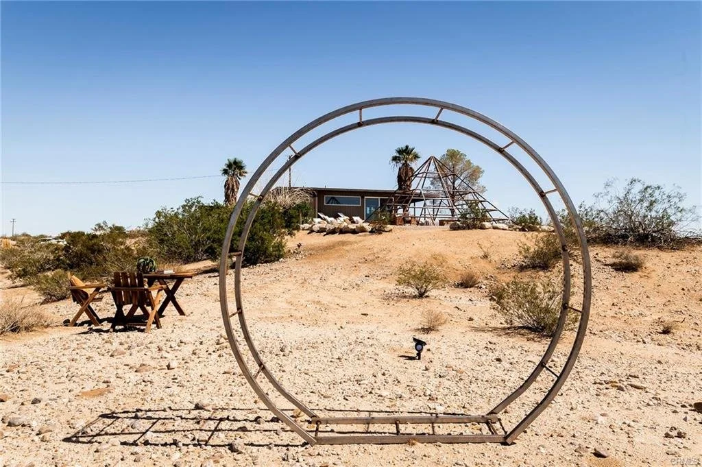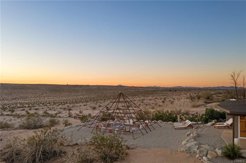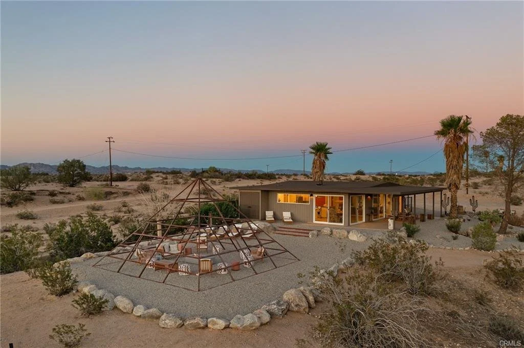 29 WEST PYRAMID HOUSE: Perched on the top of its own mountain, this striking 2-bedroom, 2-bathroom retreat delivers 360-degree views spanning Indian Cove in Joshua Tree National Park, Big Bear, and San Gregorio. Framed by dramatic imported boulders and pristine desert landscape, the property offers a rare blend of privacy, serenity, and natural beauty. At night, the dark skies transform into a stargazer’s dream, making this a true High Desert sanctuary. The centerpiece of the landscape is a bold steel-frame pyramid, measuring 24' x 24' x 14', positioned at the mountain’s edge. This dramatic outdoor structure creates a visual anchor and an unforgettable backdrop for both day and night desert living. Inside, the home is curated with Venetian plaster walls, lime wash finishes, and custom vertical plaster striping. The open floor plan is framed by expansive sliding glass doors and an 8-foot picture window, pulling the desert scenery directly into the living space. Spa-inspired bathrooms feature floating vanities, backlit mirrors, wood tile, and marble finishes, blending sophistication with soothing desert textures. A shaded porch extends from the living room, offering a peaceful vantage point for sunrise coffee or evenings under the stars. Custom channel lighting in the living room mirrors the sharp lines of the pyramid, emphasizing the interplay of geometry and desert landscape. The large kitchen showcases brand-new counters, custom cabinetry, and generous storage designed for both everyday use and stylish entertaining. Centrally located at the edge of 29 Palms and Joshua Tree, this property is just minutes from both villages, with easy access to shops, restaurants, and Joshua Tree National Park. Blending bold design, natural elements, and complete privacy, this mountain-top retreat embodies modern desert living at its finest, the kind of home you’d expect to see in the pages of Architectural Digest.