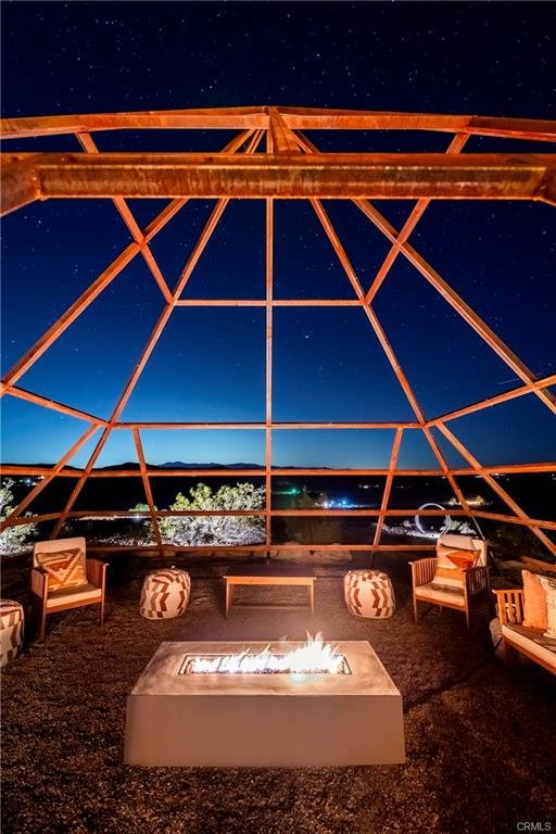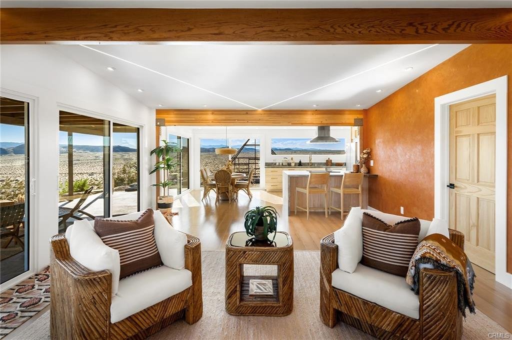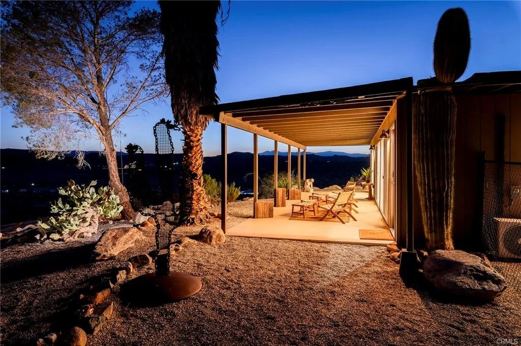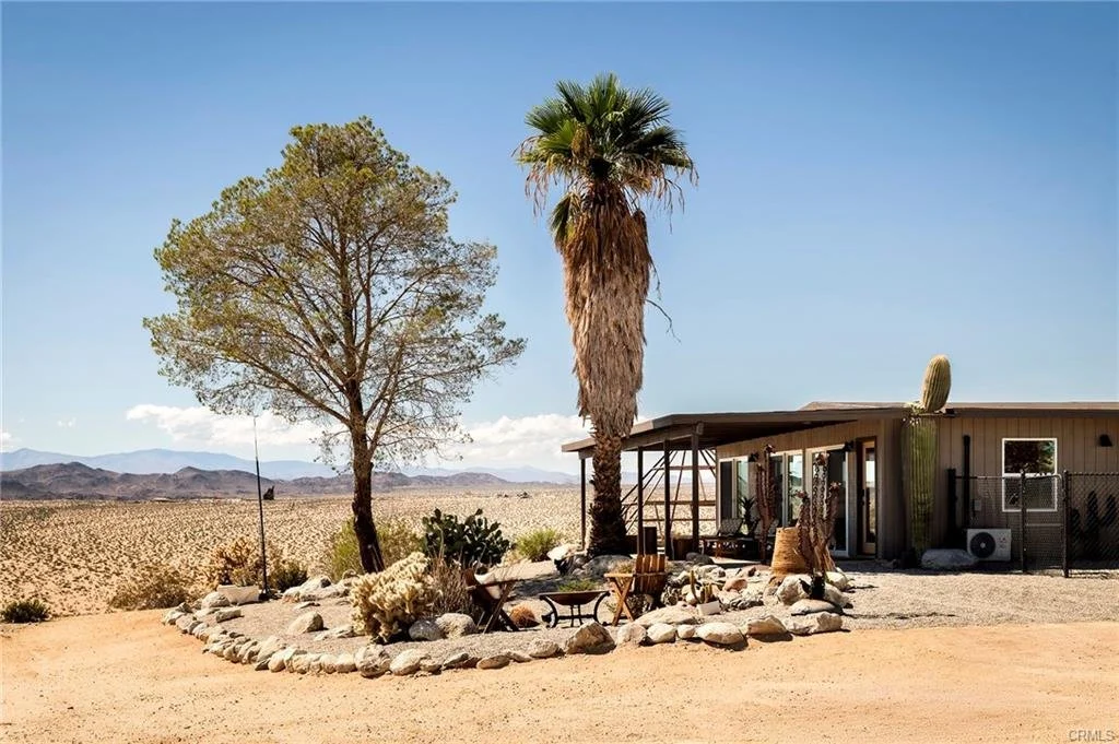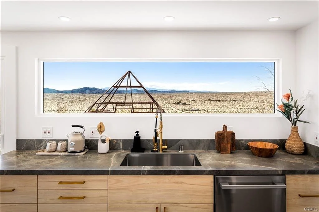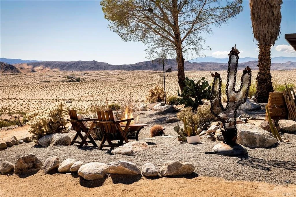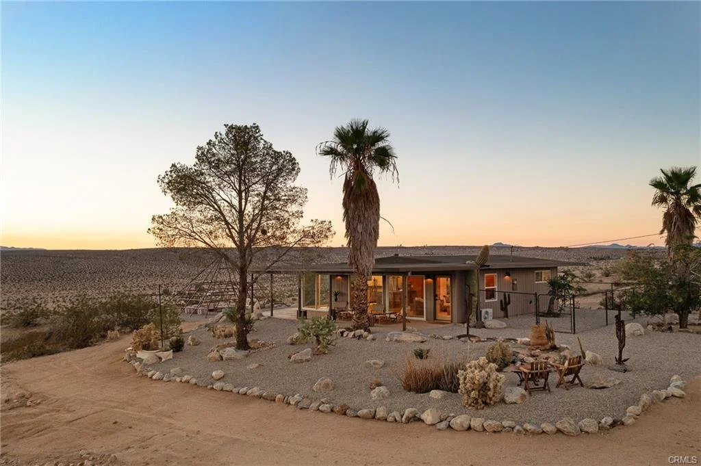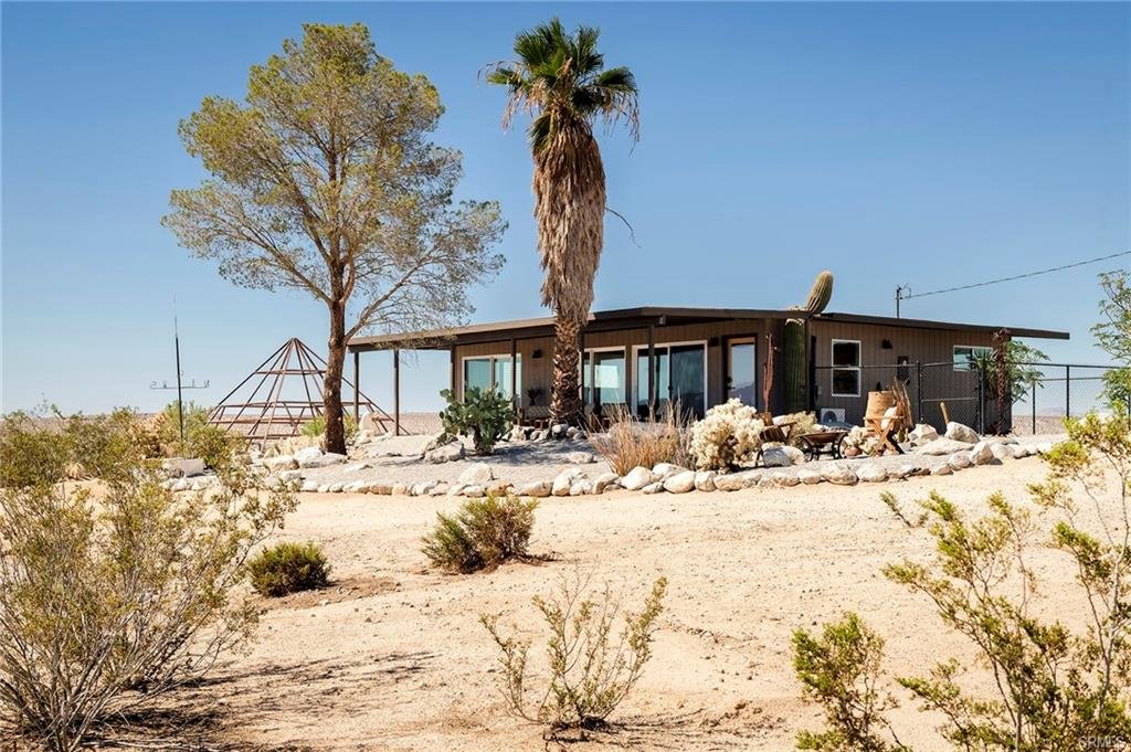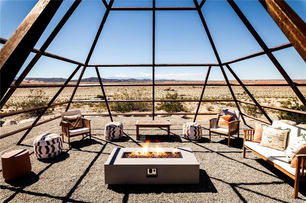 29 WEST PYRAMID HOUSE: Perched on the top of its own mountain, this striking 2-bedroom, 2-bathroom retreat delivers 360-degree views spanning Indian Cove in Joshua Tree National Park, Big Bear, and San Gregorio. Framed by dramatic imported boulders and pristine desert landscape, the property offers a rare blend of privacy, serenity, and natural beauty. At night, the dark skies transform into a stargazer’s dream, making this a true High Desert sanctuary. The centerpiece of the landscape is a bold steel-frame pyramid, measuring 24' x 24' x 14', positioned at the mountain’s edge. This dramatic outdoor structure creates a visual anchor and an unforgettable backdrop for both day and night desert living. Inside, the home is curated with Venetian plaster walls, lime wash finishes, and custom vertical plaster striping. The open floor plan is framed by expansive sliding glass doors and an 8-foot picture window, pulling the desert scenery directly into the living space. Spa-inspired bathrooms feature floating vanities, backlit mirrors, wood tile, and marble finishes, blending sophistication with soothing desert textures. A shaded porch extends from the living room, offering a peaceful vantage point for sunrise coffee or evenings under the stars. Custom channel lighting in the living room mirrors the sharp lines of the pyramid, emphasizing the interplay of geometry and desert landscape. The large kitchen showcases brand-new counters, custom cabinetry, and generous storage designed for both everyday use and stylish entertaining. Centrally located at the edge of 29 Palms and Joshua Tree, this property is just minutes from both villages, with easy access to shops, restaurants, and Joshua Tree National Park. Blending bold design, natural elements, and complete privacy, this mountain-top retreat embodies modern desert living at its finest, the kind of home you’d expect to see in the pages of Architectural Digest.