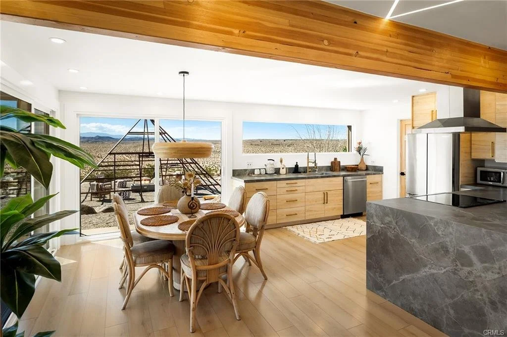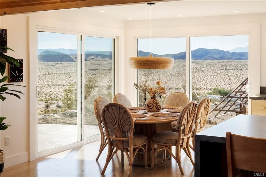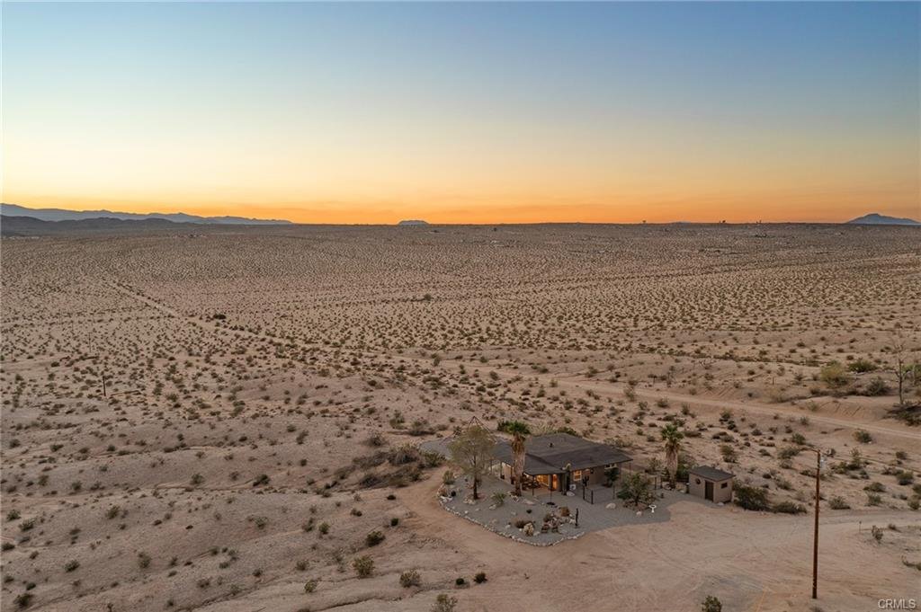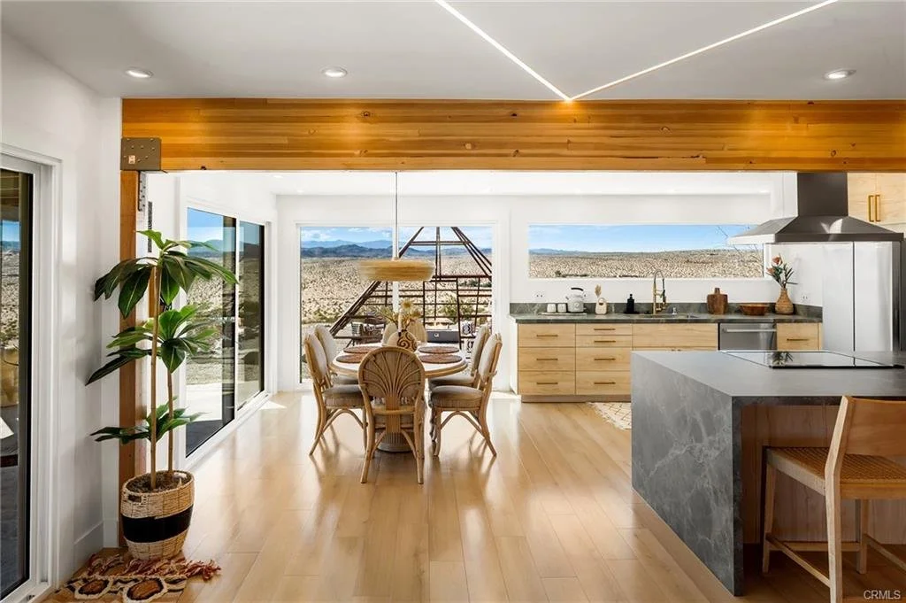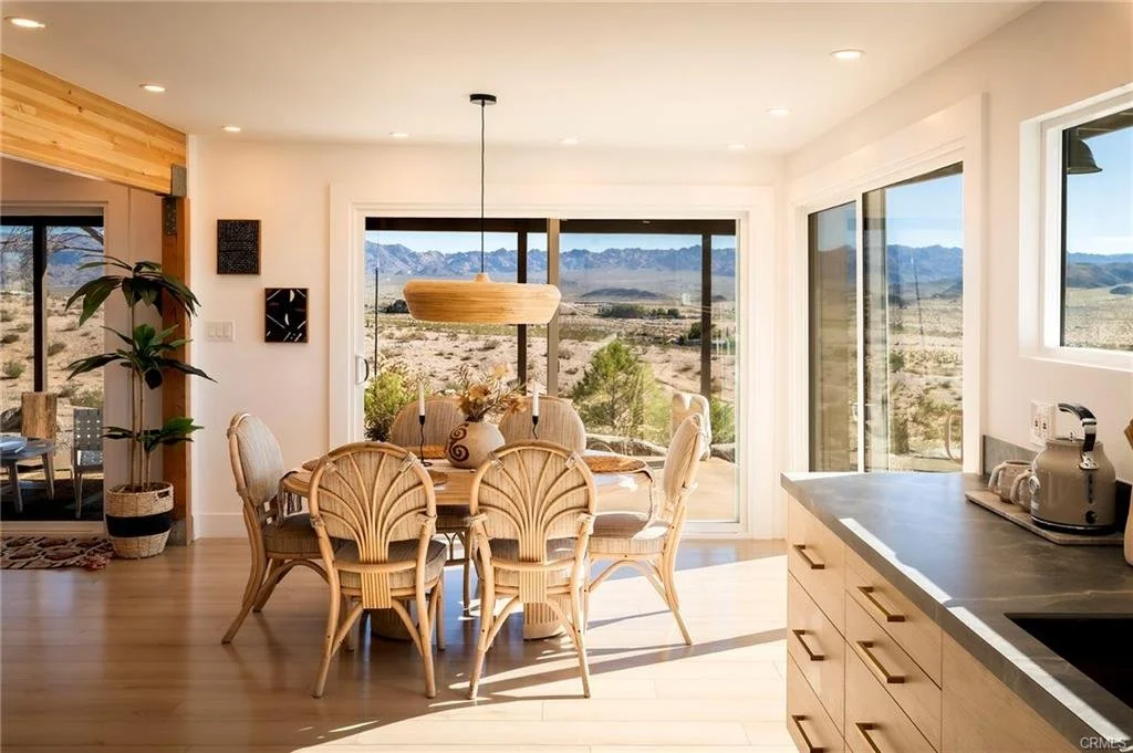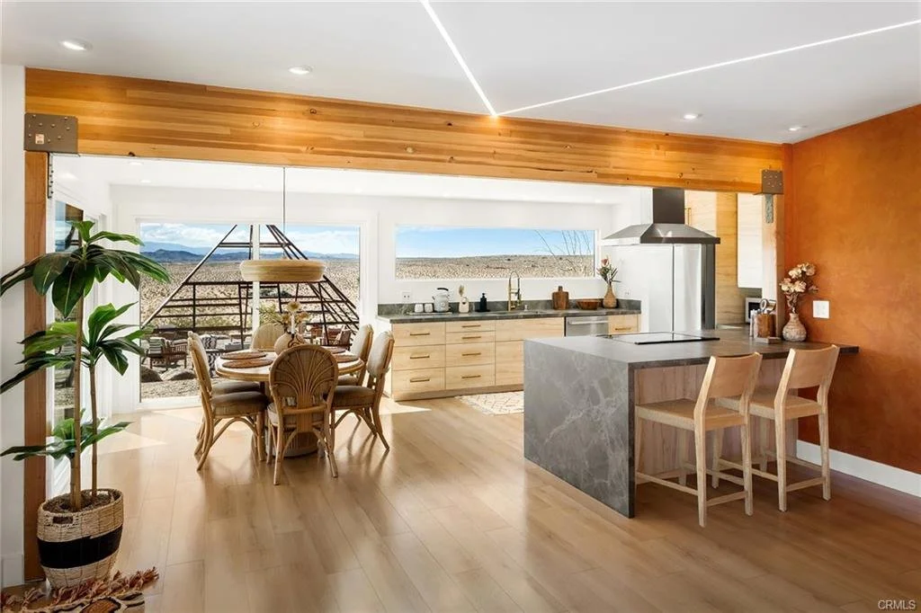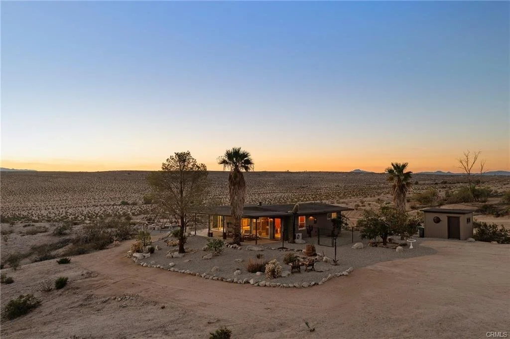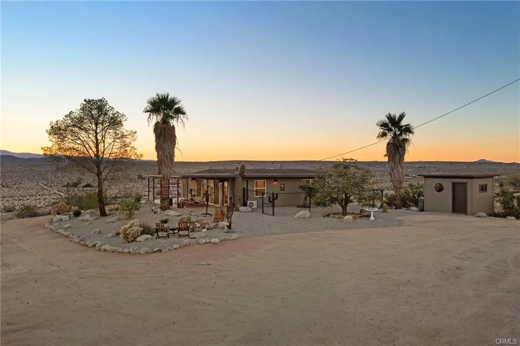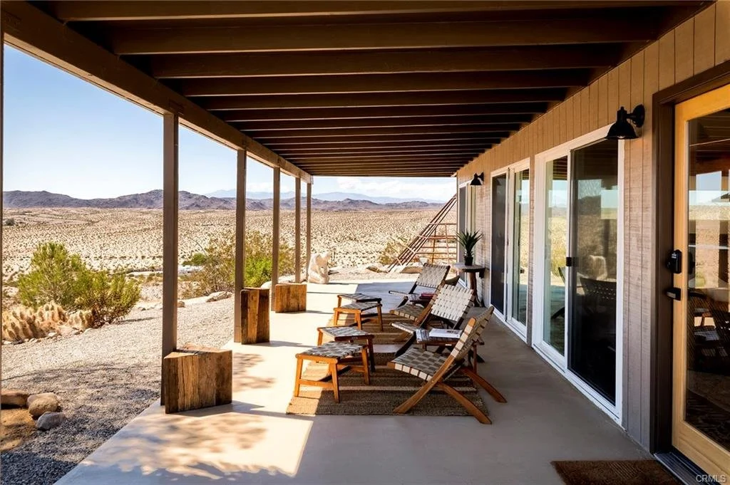 29 WEST PYRAMID HOUSE: Perched on the top of its own mountain, this striking 2-bedroom, 2-bathroom retreat delivers 360-degree views spanning Indian Cove in Joshua Tree National Park, Big Bear, and San Gregorio. Framed by dramatic imported boulders and pristine desert landscape, the property offers a rare blend of privacy, serenity, and natural beauty. At night, the dark skies transform into a stargazer’s dream, making this a true High Desert sanctuary. The centerpiece of the landscape is a bold steel-frame pyramid, measuring 24' x 24' x 14', positioned at the mountain’s edge. This dramatic outdoor structure creates a visual anchor and an unforgettable backdrop for both day and night desert living. Inside, the home is curated with Venetian plaster walls, lime wash finishes, and custom vertical plaster striping. The open floor plan is framed by expansive sliding glass doors and an 8-foot picture window, pulling the desert scenery directly into the living space. Spa-inspired bathrooms feature floating vanities, backlit mirrors, wood tile, and marble finishes, blending sophistication with soothing desert textures. A shaded porch extends from the living room, offering a peaceful vantage point for sunrise coffee or evenings under the stars. Custom channel lighting in the living room mirrors the sharp lines of the pyramid, emphasizing the interplay of geometry and desert landscape. The large kitchen showcases brand-new counters, custom cabinetry, and generous storage designed for both everyday use and stylish entertaining. Centrally located at the edge of 29 Palms and Joshua Tree, this property is just minutes from both villages, with easy access to shops, restaurants, and Joshua Tree National Park. Blending bold design, natural elements, and complete privacy, this mountain-top retreat embodies modern desert living at its finest, the kind of home you’d expect to see in the pages of Architectural Digest.