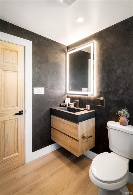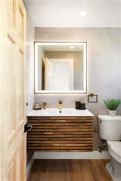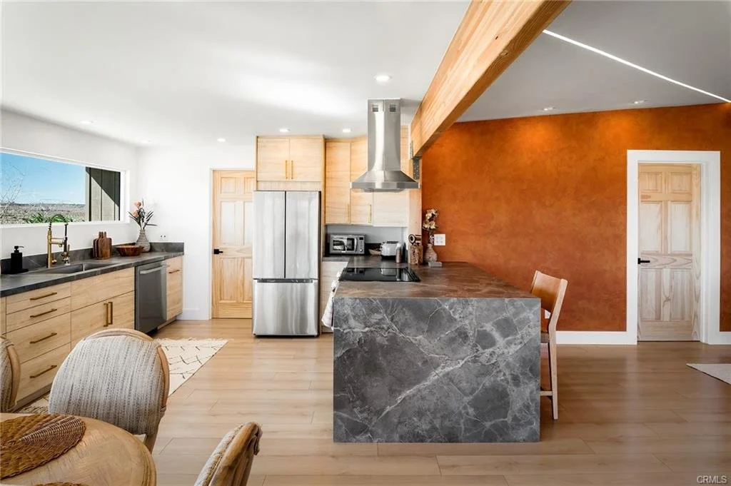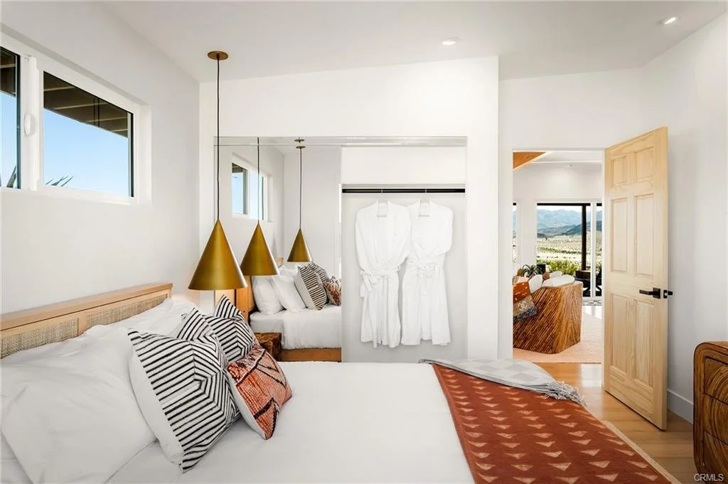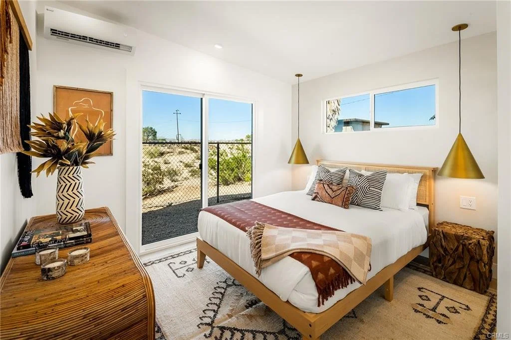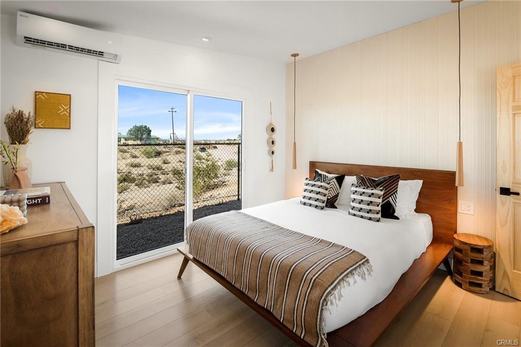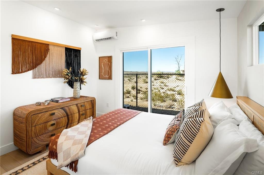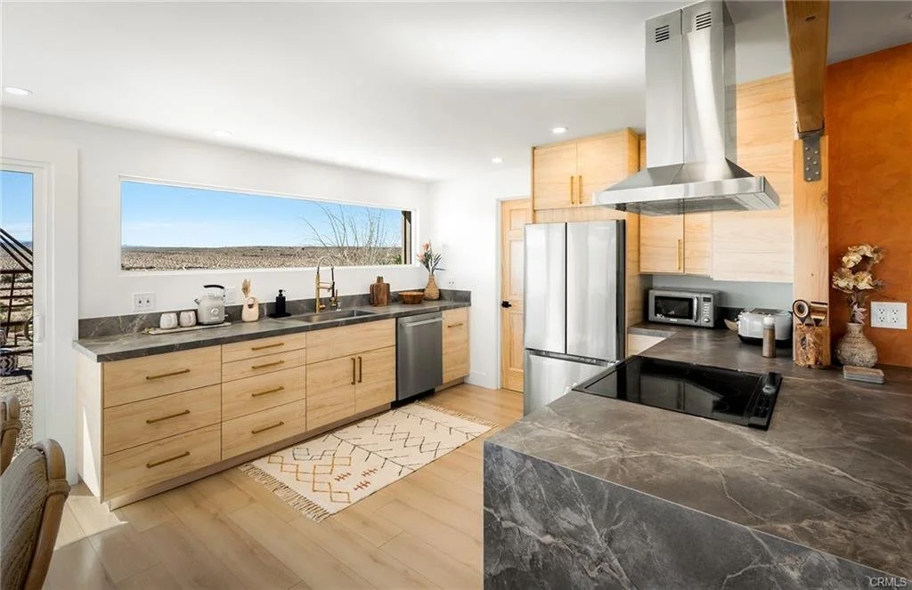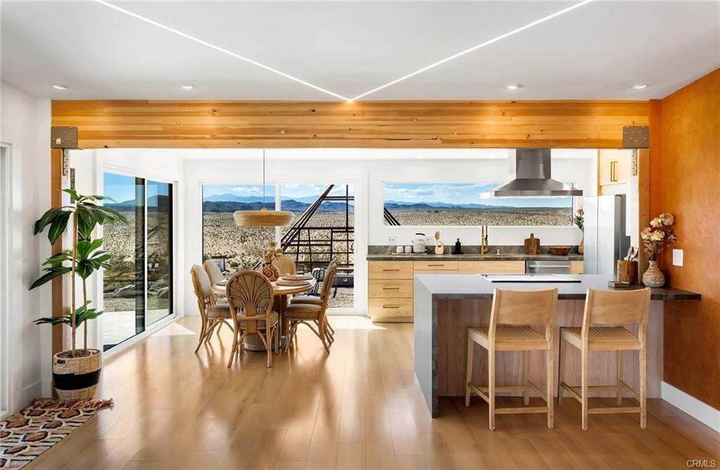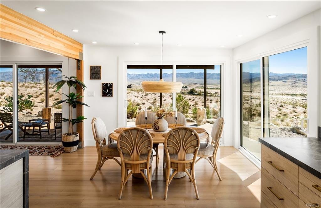 29 WEST PYRAMID HOUSE: Perched on the top of its own mountain, this striking 2-bedroom, 2-bathroom retreat delivers 360-degree views spanning Indian Cove in Joshua Tree National Park, Big Bear, and San Gregorio. Framed by dramatic imported boulders and pristine desert landscape, the property offers a rare blend of privacy, serenity, and natural beauty. At night, the dark skies transform into a stargazer’s dream, making this a true High Desert sanctuary. The centerpiece of the landscape is a bold steel-frame pyramid, measuring 24' x 24' x 14', positioned at the mountain’s edge. This dramatic outdoor structure creates a visual anchor and an unforgettable backdrop for both day and night desert living. Inside, the home is curated with Venetian plaster walls, lime wash finishes, and custom vertical plaster striping. The open floor plan is framed by expansive sliding glass doors and an 8-foot picture window, pulling the desert scenery directly into the living space. Spa-inspired bathrooms feature floating vanities, backlit mirrors, wood tile, and marble finishes, blending sophistication with soothing desert textures. A shaded porch extends from the living room, offering a peaceful vantage point for sunrise coffee or evenings under the stars. Custom channel lighting in the living room mirrors the sharp lines of the pyramid, emphasizing the interplay of geometry and desert landscape. The large kitchen showcases brand-new counters, custom cabinetry, and generous storage designed for both everyday use and stylish entertaining. Centrally located at the edge of 29 Palms and Joshua Tree, this property is just minutes from both villages, with easy access to shops, restaurants, and Joshua Tree National Park. Blending bold design, natural elements, and complete privacy, this mountain-top retreat embodies modern desert living at its finest, the kind of home you’d expect to see in the pages of Architectural Digest.