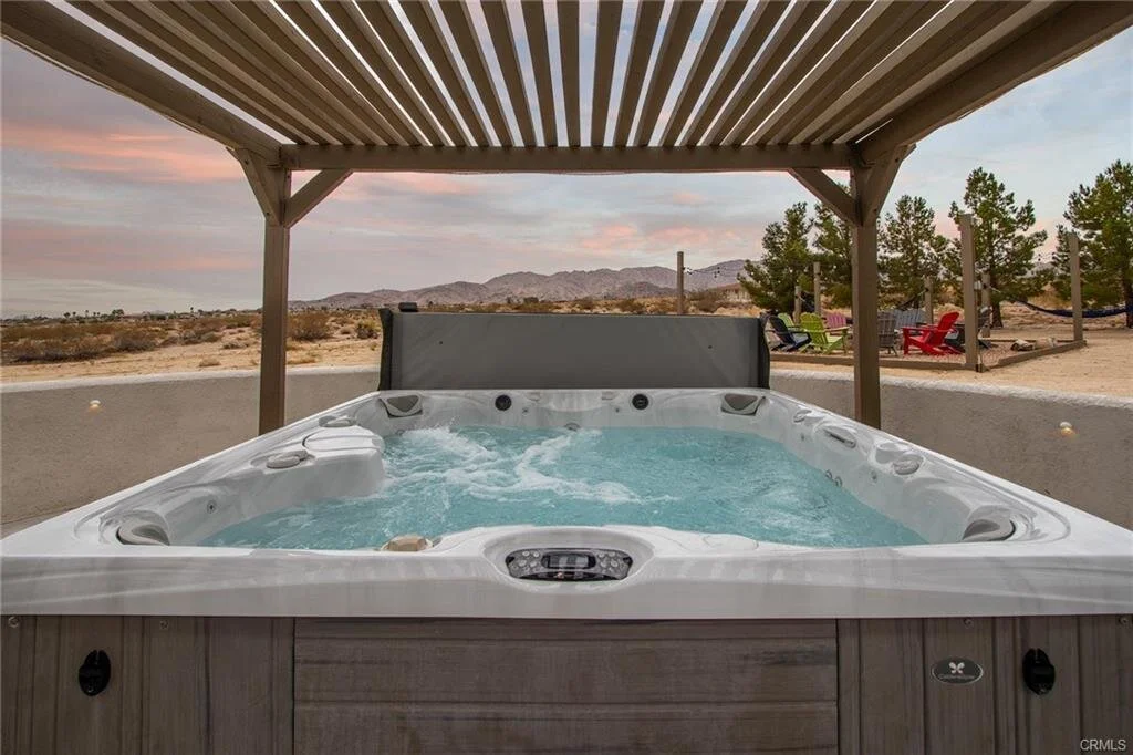 SECLUDED STARGAZER’S RETREAT: Complete fully-furnished, turnkey resort-home, right down to every meticulous detail. South of highway and minutes from Indian Cove entrance of Joshua Tree National Park. Long term securely established vacation rental with current City of 29 Palms permit, earning upwards of $100k gross and rated as one of the top earners in 29 per AIRDNA.CO. Owner invested approx. $250k in upgrades in the home and over $100k in high-quality furnishings and many, many extras. The list of amenities is startling, encompassing one of the most complete vacation rentals ever. Swimming pool and hot tub are only the start of this amazing 2,100sf home that sleeps up to 8. Rural location on south side spread over 4+ ACRES, which are split into 2 parcels for privacy or to build additional housing in future. Only two other parcels separate you from the National Park. Almost touching heaven. Amenities include high-end luxurious, all-natural fiber mattresses, cozy cotton bedding and blackout curtains to ensure the best night’s sleep you will ever get. Spacious kitchen forms heart of home; French doors open to an elevated porch, with covered pergola, lights and mister system, overlooking pool, spa, circle of Adirondack chairs, hammocks, outdoor bar & bbq area and panoramic views in the distance. Koi pond with wooden bridge for meditating. Bust into a game of foosball on the back porch, then step into the game room for shuffleboard, poker, ping-pong and pool table or chill on the couch and relax to a 65” screen; if that’s not enough, wander into the living room for additional living space and sink into the sectional sofa surrounding a large coffee table to watch the 75” screen of your favorites. Rare opportunity to walk straight into a fully-functioning, well-oiled, well-liked, frequently booked vacation rental that even includes an additional storage unit with two extra washers and dryers for onsite cleaning. Beautiful location and carefully researched and executed Airbnb wonderland in coveted Indian Cove.