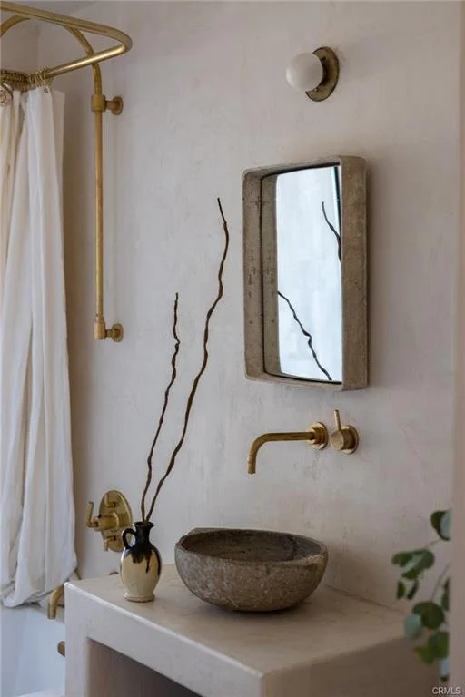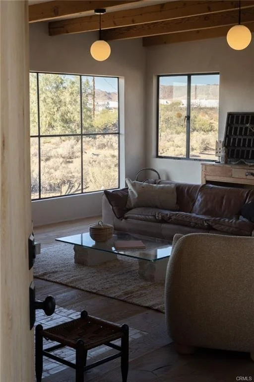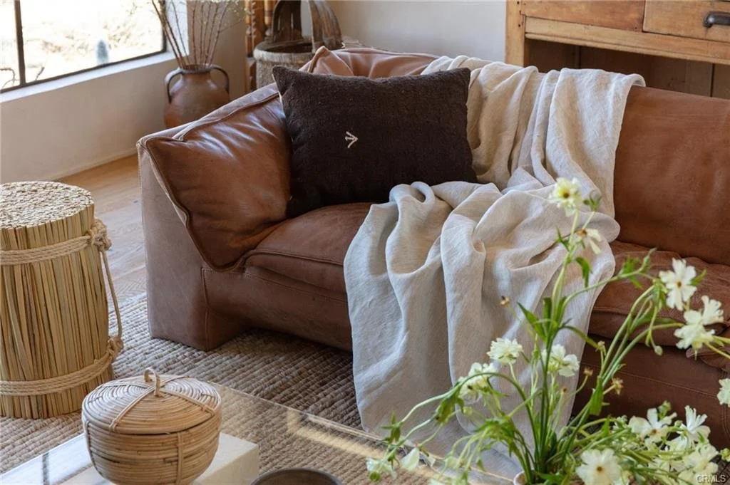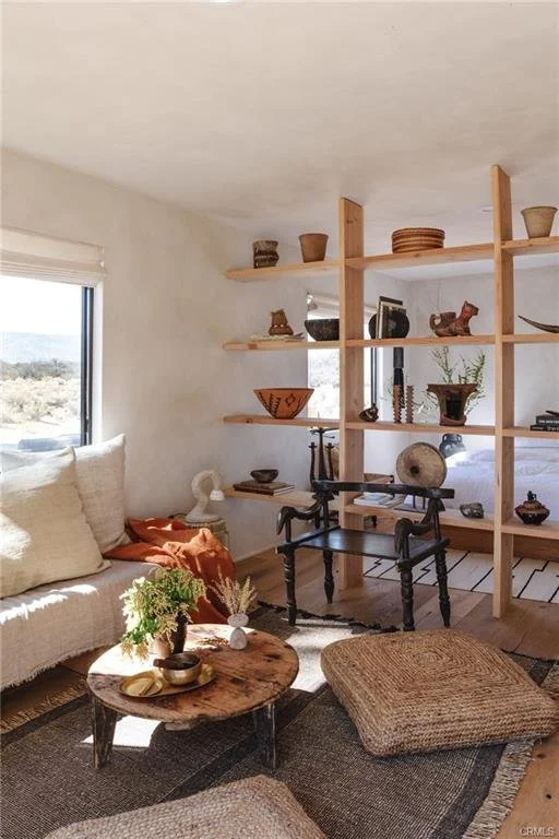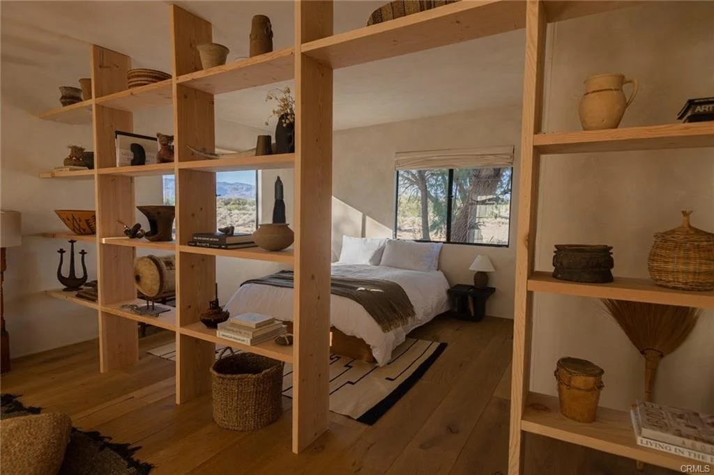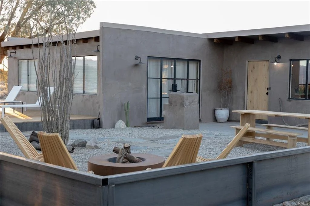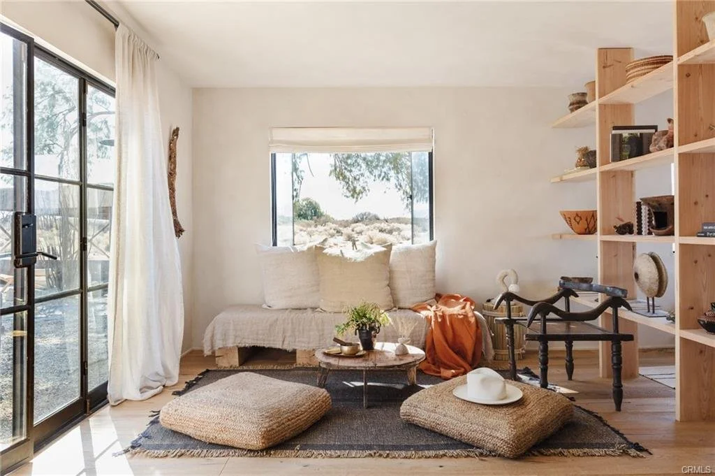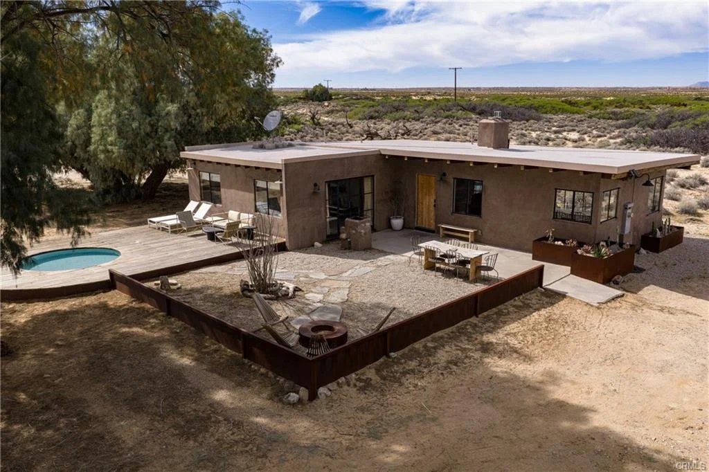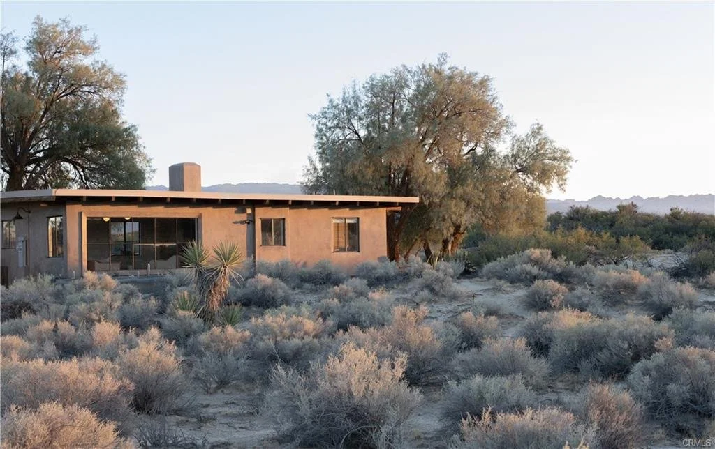 Arro Dunes, created by Studio Marrant Interiors, is a renovated 1957 homestead set on 10 acres in Desert Heights with lush mesquite dunes and trees surrounding the property, operating as an active, successful short-term rental that generated $75,000 gross income in 2025 (buyer to verify). The 2-bedroom, 1-bath home blends organic materials, wabi-sabi influence, and minimalist style with carefully curated antiques, custom-built finishes, and modern comforts. Dual bi-fold French doors open to the desert landscape and sweeping 360-degree mountain views. Featured in Condé Nast Traveler, Coveteur and The Makers book by Bed Threads, the home offers a distinctive desert experience with thoughtful design and a strong visual identity. The spacious bedroom includes a sitting area/tea room, while the original brick fireplace with steel hood remains a standout architectural feature in the living room. Outdoor amenities include a wood-burning hot tub, cowboy pool, fire pit, outdoor dining area, bocce ball court, and horseshoe pit. Additional features include A/C and heat in every room, WiFi, projector entertainment system, and a thoughtfully outfitted kitchen with premium appliances. Turn key with designer furnishings excluding some personal items. Conveniently located near the eastern entrance of Joshua Tree National Park and just minutes from downtown Twentynine Palms, with local dining, shopping, and the Sunday farmers market nearby. Ideal as a second home, short-term rental investment, or full-time primary residence.