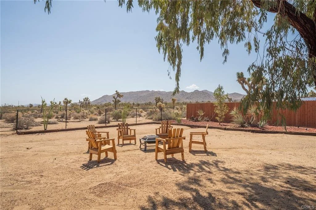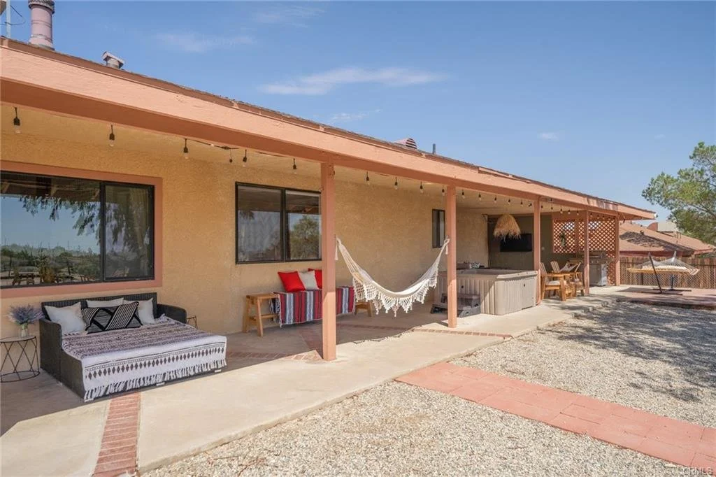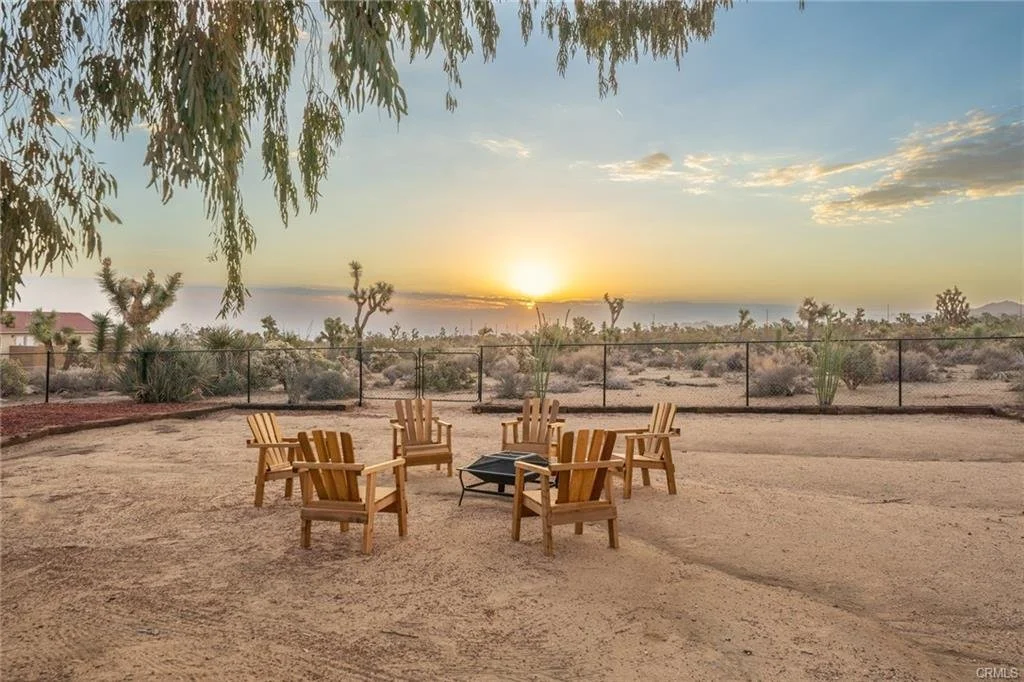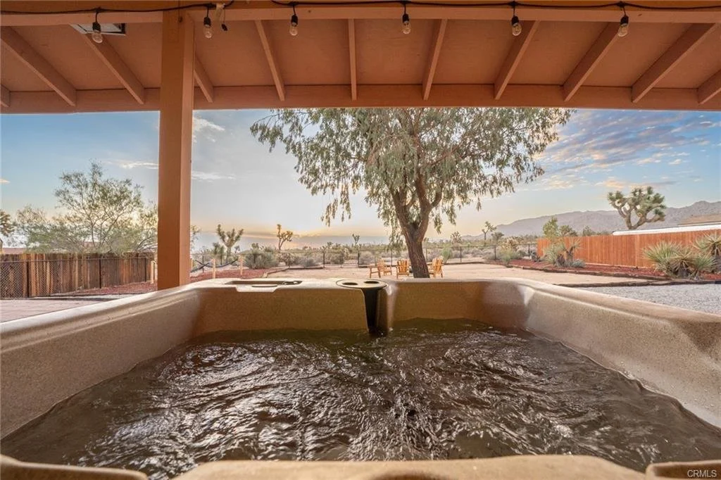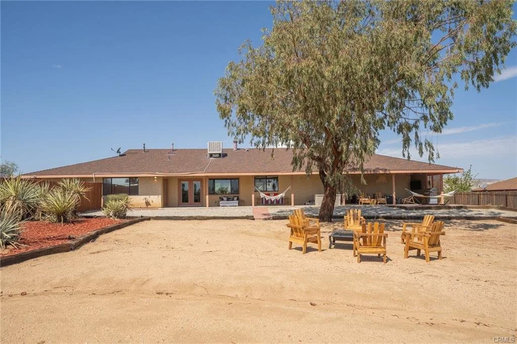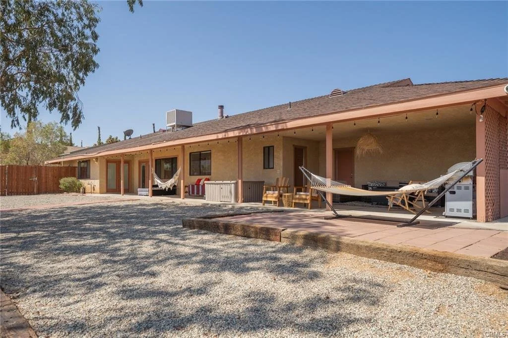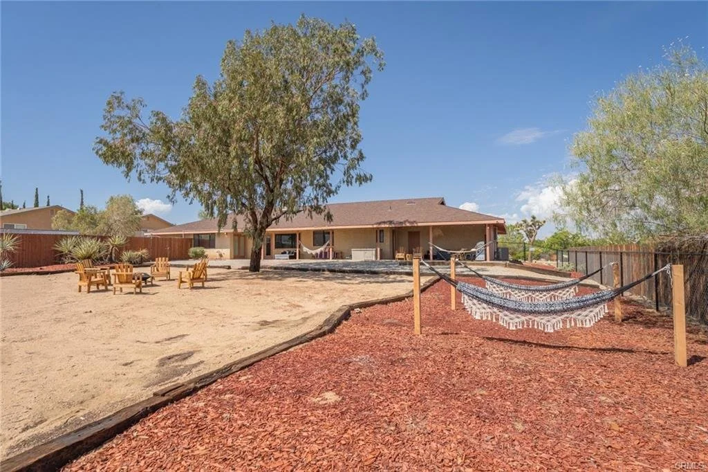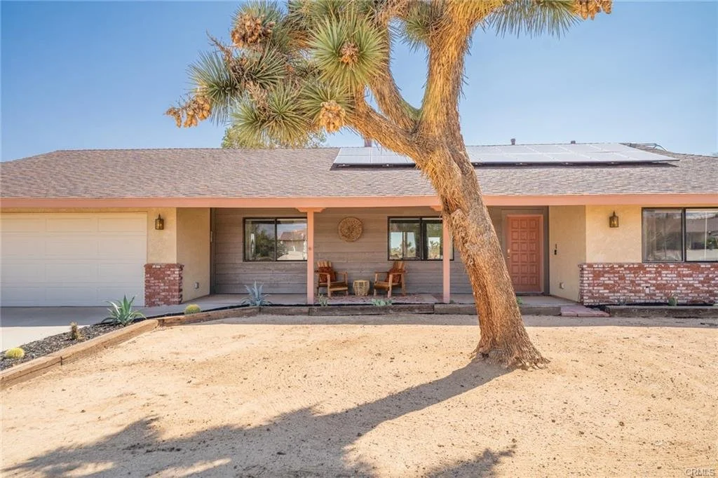 Coveted Western Hills Ranchos home - panoramic views of Joshua Tree National Park and vast wilderness from the backyard. Watch the sunrise from the back porch overlooking a forest of Joshua trees. Location is convenient to town and shopping yet has a rural feel on the eastern edge of town. Large home with nearly 1,900 square feet of living space, including three large bedrooms and three bathrooms. Living room is spacious with brick accents, a wood burning stove, and exposed wood-beamed ceiling. Rare formal dining room with built-in cabinets and a wide hallway with more built-in cabinets, in addition to a 3-car garage approximately 800 square feet; plenty of interior living space for entertaining or work-at-home areas and vast storage space throughout. PAID SOLAR for energy efficiency and reduced power bills. Natural gas meter (so no propane bills). Central AC/Heating. Mature landscaping with irrigation. Underground utilities, so no unsightly power cable running from a pole on the street. Fenced backyard for pets or children. Indoor/outdoor living at its best, with a sublime back porch with hot-tub, special areas for seating, including a dome for stargazing at night. Few homes on the market have so many upgraded interior and exterior living spaces – a must-see perfect forever home. Property TURN-KEY, FULLY-FURNISHED (to be inventoried outside of escrow). Seller purchased all furnishings exclusively for this home.