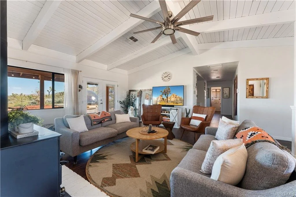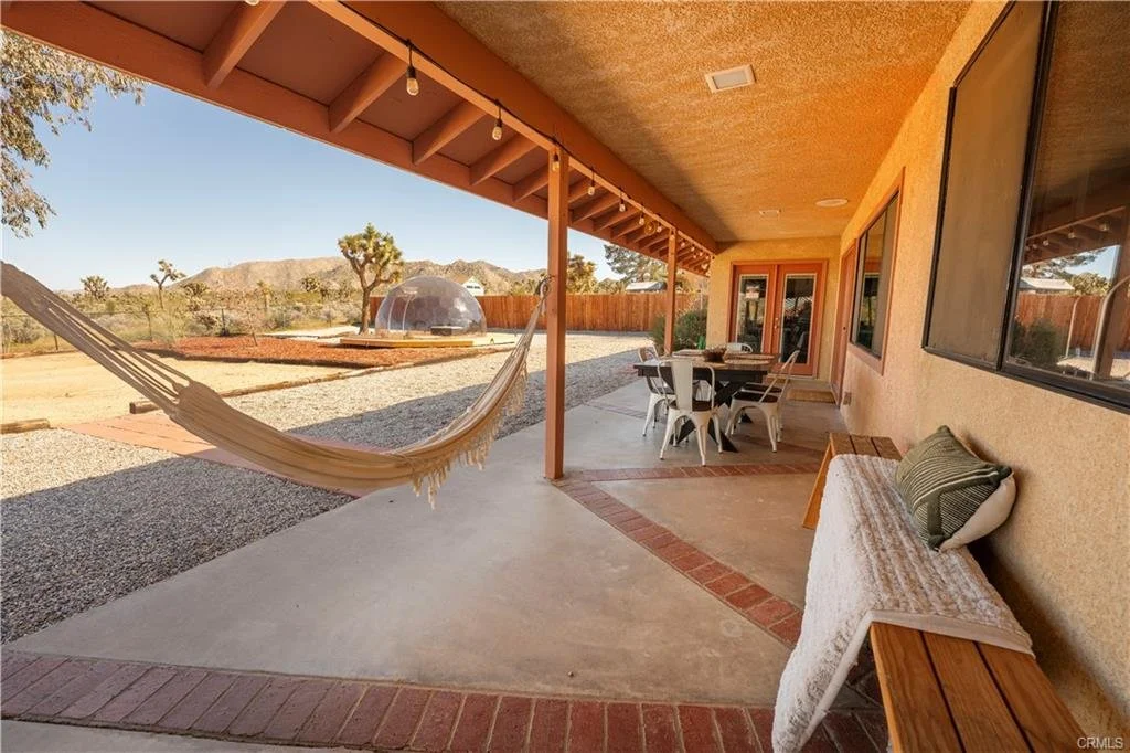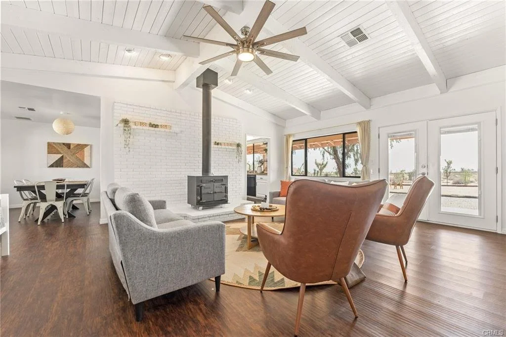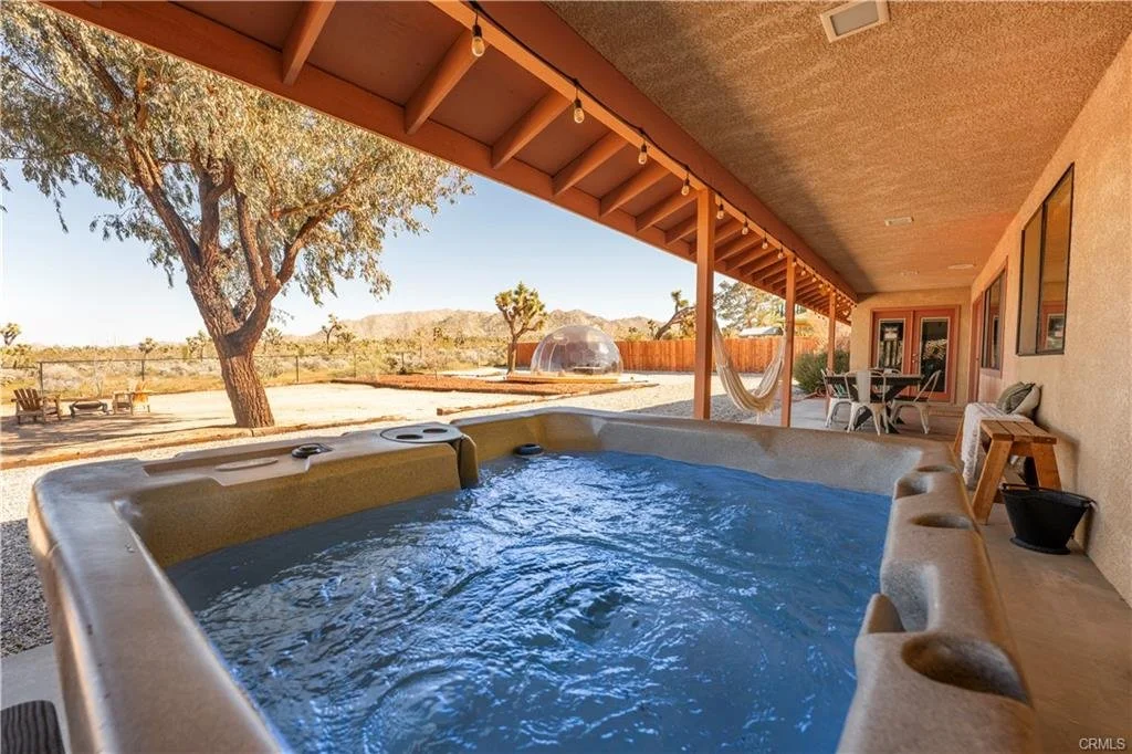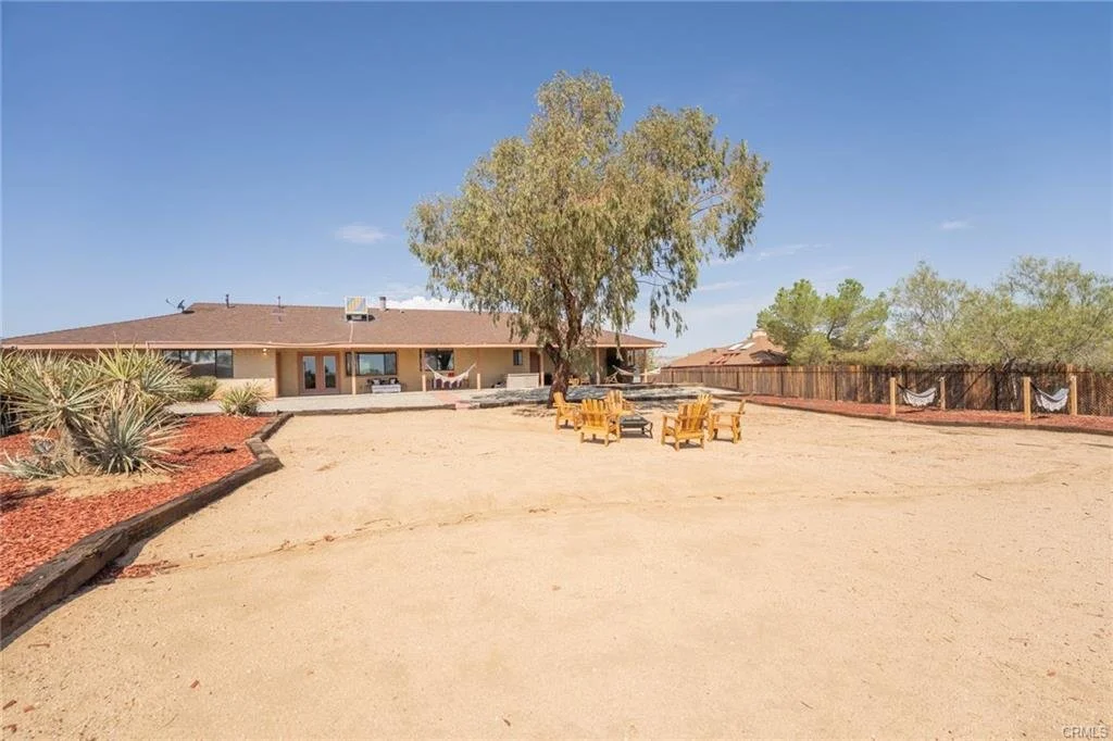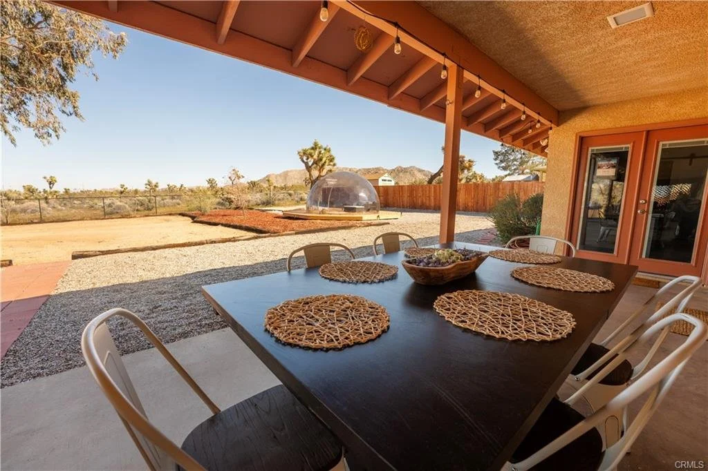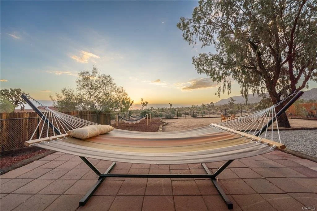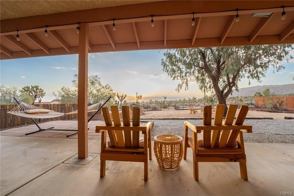 Coveted Western Hills Ranchos home - panoramic views of Joshua Tree National Park and vast wilderness from the backyard. Watch the sunrise from the back porch overlooking a forest of Joshua trees. Location is convenient to town and shopping yet has a rural feel on the eastern edge of town. Large home with nearly 1,900 square feet of living space, including three large bedrooms and three bathrooms. Living room is spacious with brick accents, a wood burning stove, and exposed wood-beamed ceiling. Rare formal dining room with built-in cabinets and a wide hallway with more built-in cabinets, in addition to a 3-car garage approximately 800 square feet; plenty of interior living space for entertaining or work-at-home areas and vast storage space throughout. PAID SOLAR for energy efficiency and reduced power bills. Natural gas meter (so no propane bills). Central AC/Heating. Mature landscaping with irrigation. Underground utilities, so no unsightly power cable running from a pole on the street. Fenced backyard for pets or children. Indoor/outdoor living at its best, with a sublime back porch with hot-tub, special areas for seating, including a dome for stargazing at night. Few homes on the market have so many upgraded interior and exterior living spaces – a must-see perfect forever home. Property TURN-KEY, FULLY-FURNISHED (to be inventoried outside of escrow). Seller purchased all furnishings exclusively for this home.