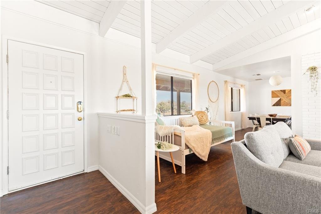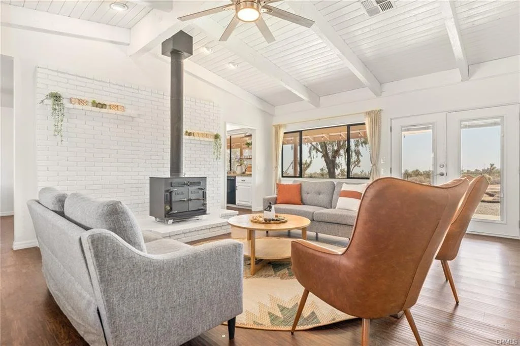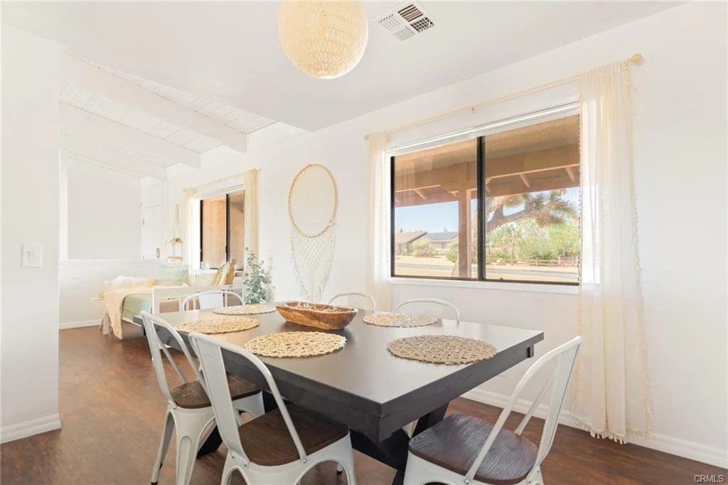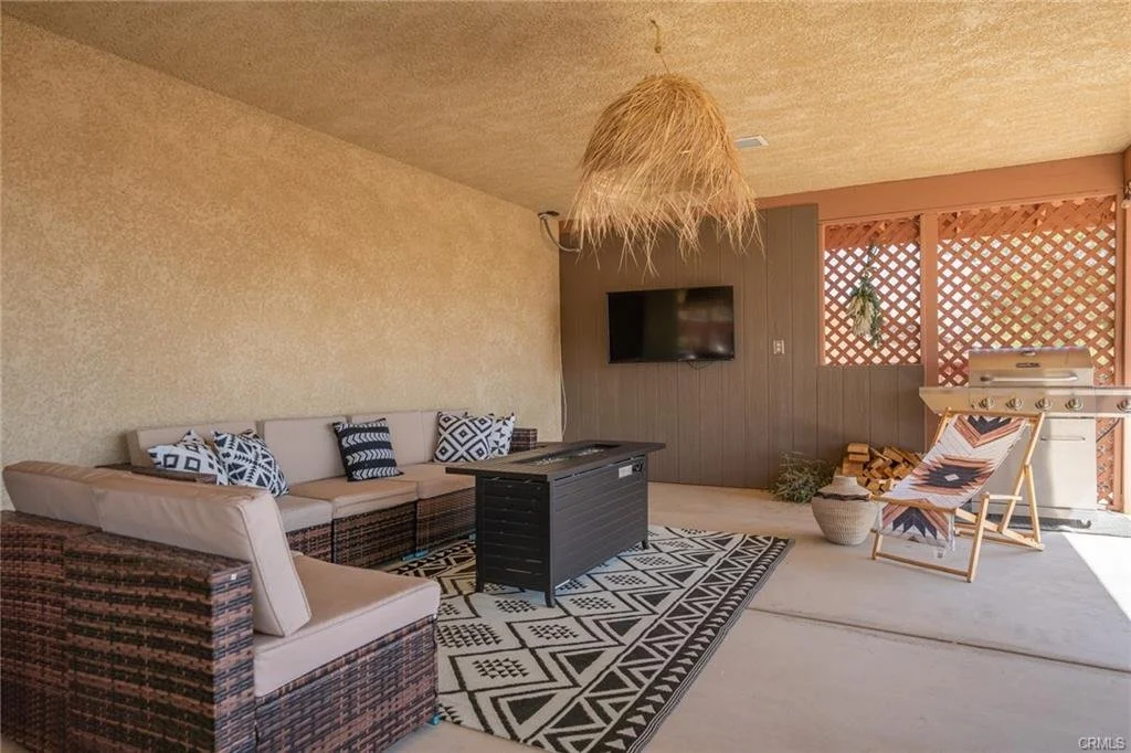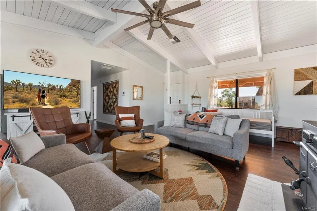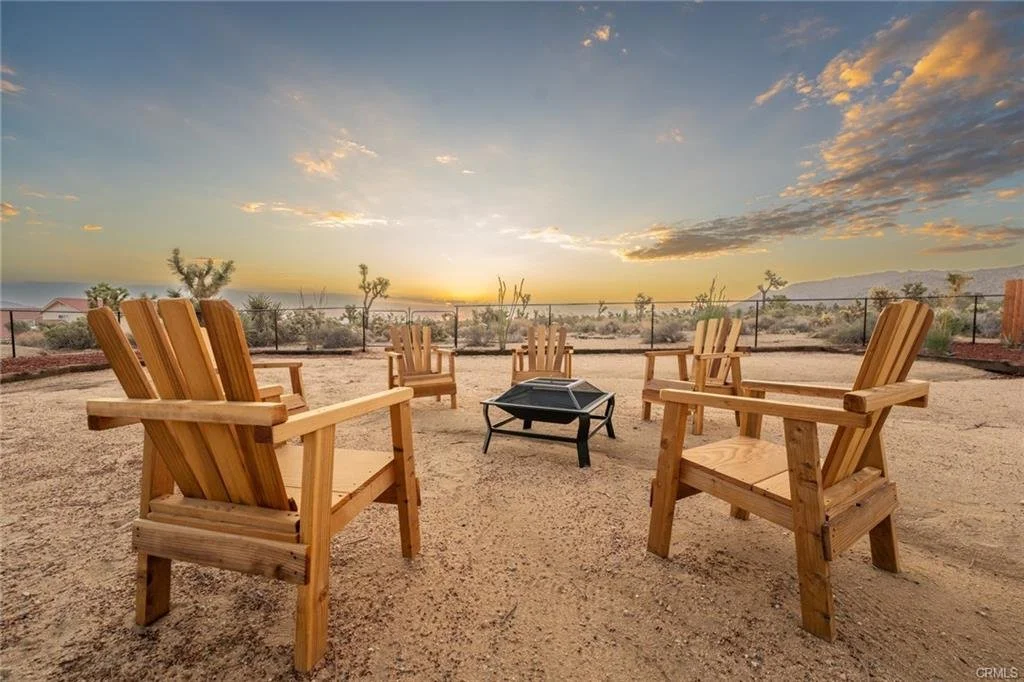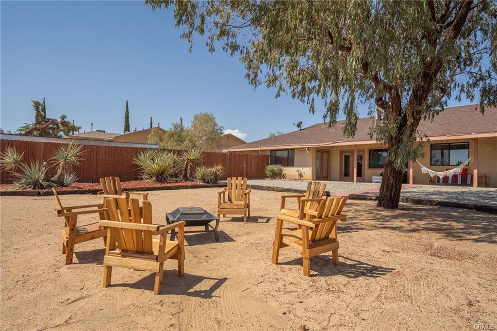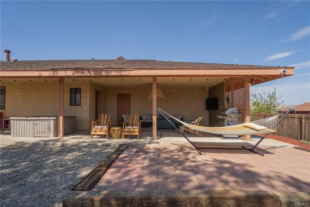 Coveted Western Hills Ranchos home - panoramic views of Joshua Tree National Park and vast wilderness from the backyard. Watch the sunrise from the back porch overlooking a forest of Joshua trees. Location is convenient to town and shopping yet has a rural feel on the eastern edge of town. Large home with nearly 1,900 square feet of living space, including three large bedrooms and three bathrooms. Living room is spacious with brick accents, a wood burning stove, and exposed wood-beamed ceiling. Rare formal dining room with built-in cabinets and a wide hallway with more built-in cabinets, in addition to a 3-car garage approximately 800 square feet; plenty of interior living space for entertaining or work-at-home areas and vast storage space throughout. PAID SOLAR for energy efficiency and reduced power bills. Natural gas meter (so no propane bills). Central AC/Heating. Mature landscaping with irrigation. Underground utilities, so no unsightly power cable running from a pole on the street. Fenced backyard for pets or children. Indoor/outdoor living at its best, with a sublime back porch with hot-tub, special areas for seating, including a dome for stargazing at night. Few homes on the market have so many upgraded interior and exterior living spaces – a must-see perfect forever home. Property TURN-KEY, FULLY-FURNISHED (to be inventoried outside of escrow). Seller purchased all furnishings exclusively for this home.