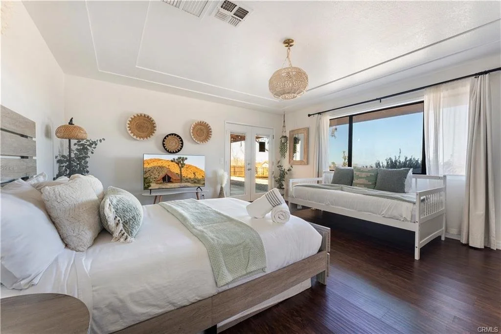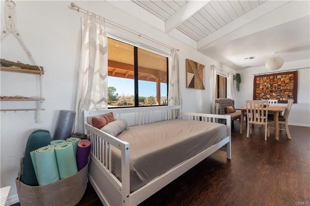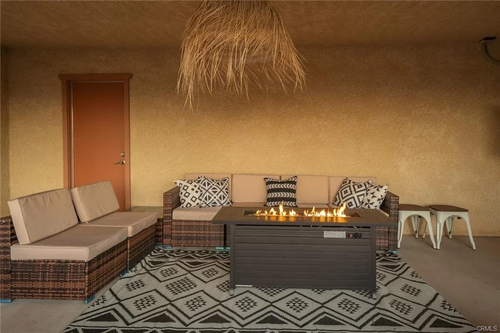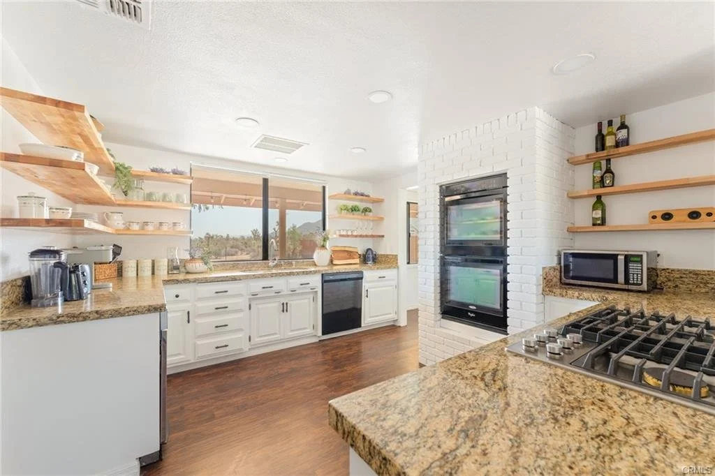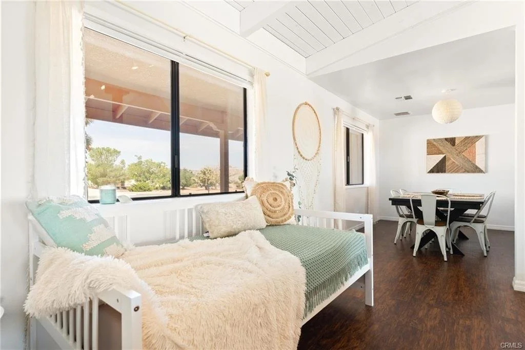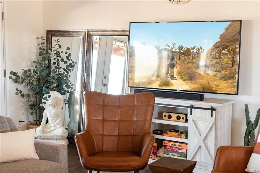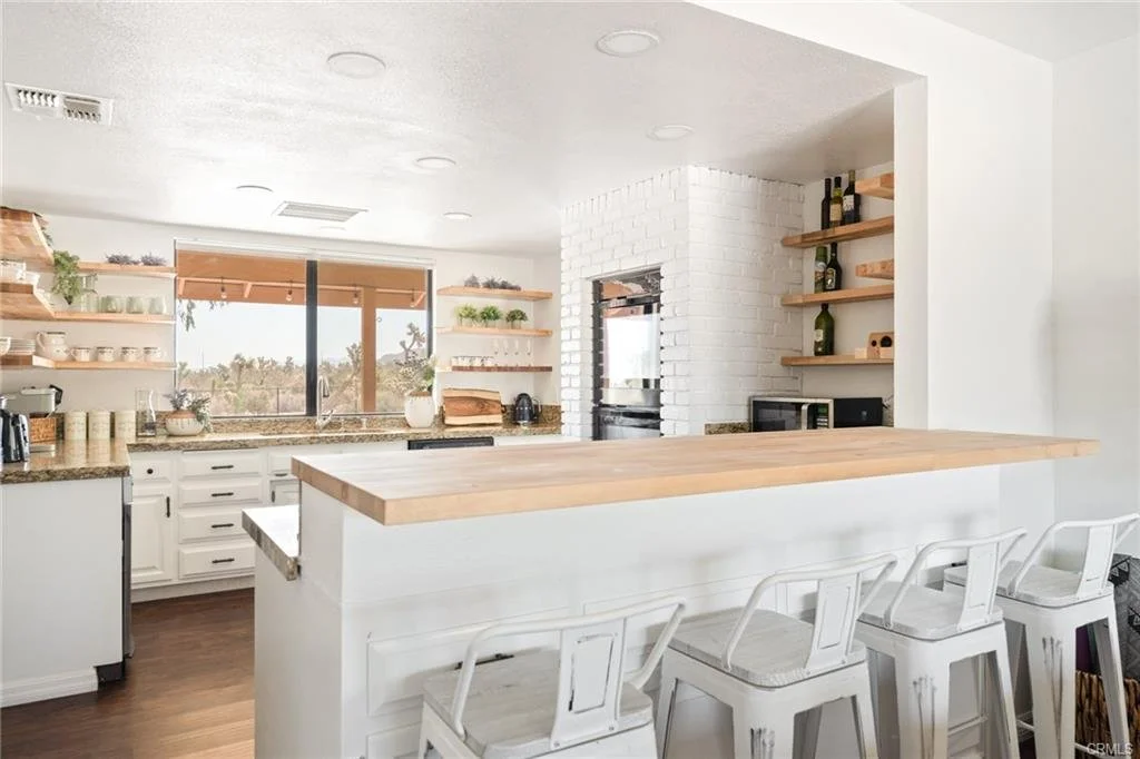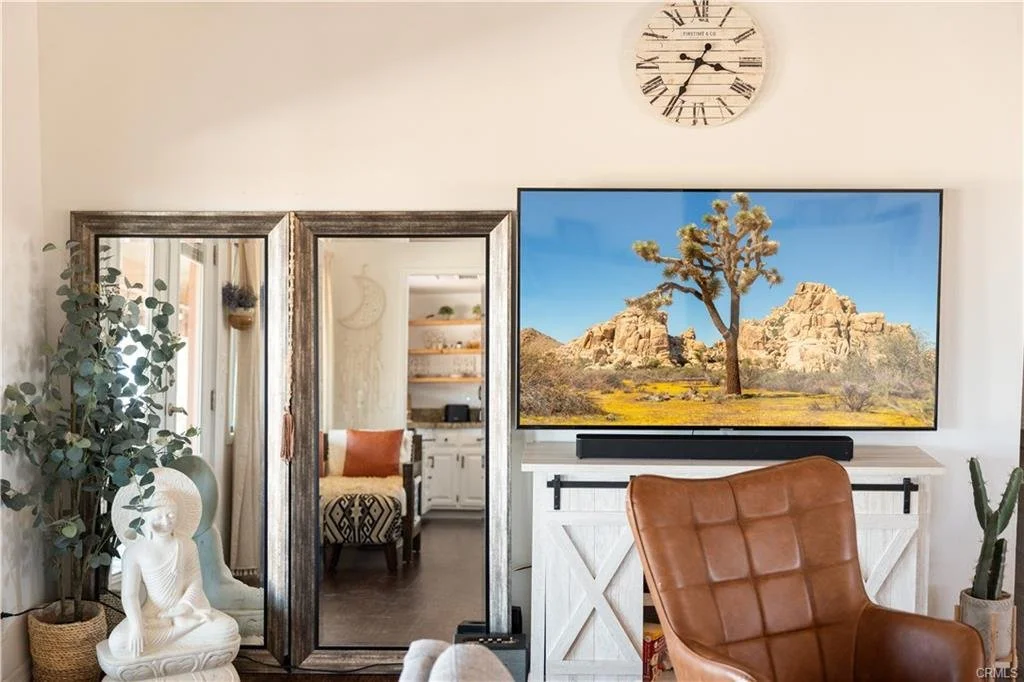 Coveted Western Hills Ranchos home - panoramic views of Joshua Tree National Park and vast wilderness from the backyard. Watch the sunrise from the back porch overlooking a forest of Joshua trees. Location is convenient to town and shopping yet has a rural feel on the eastern edge of town. Large home with nearly 1,900 square feet of living space, including three large bedrooms and three bathrooms. Living room is spacious with brick accents, a wood burning stove, and exposed wood-beamed ceiling. Rare formal dining room with built-in cabinets and a wide hallway with more built-in cabinets, in addition to a 3-car garage approximately 800 square feet; plenty of interior living space for entertaining or work-at-home areas and vast storage space throughout. PAID SOLAR for energy efficiency and reduced power bills. Natural gas meter (so no propane bills). Central AC/Heating. Mature landscaping with irrigation. Underground utilities, so no unsightly power cable running from a pole on the street. Fenced backyard for pets or children. Indoor/outdoor living at its best, with a sublime back porch with hot-tub, special areas for seating, including a dome for stargazing at night. Few homes on the market have so many upgraded interior and exterior living spaces – a must-see perfect forever home. Property TURN-KEY, FULLY-FURNISHED (to be inventoried outside of escrow). Seller purchased all furnishings exclusively for this home.