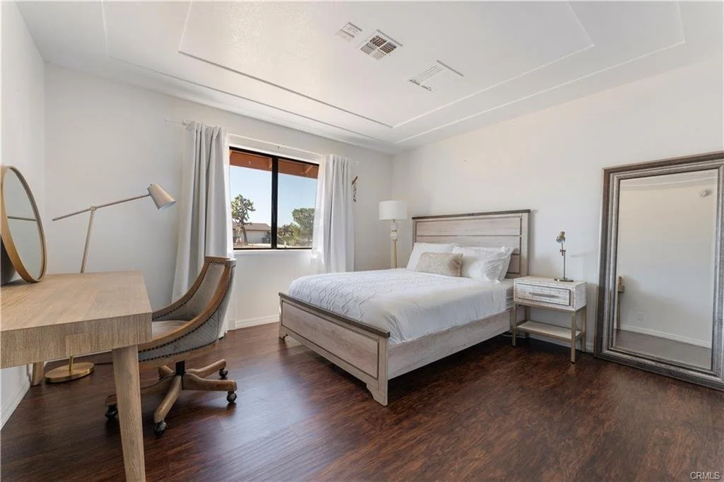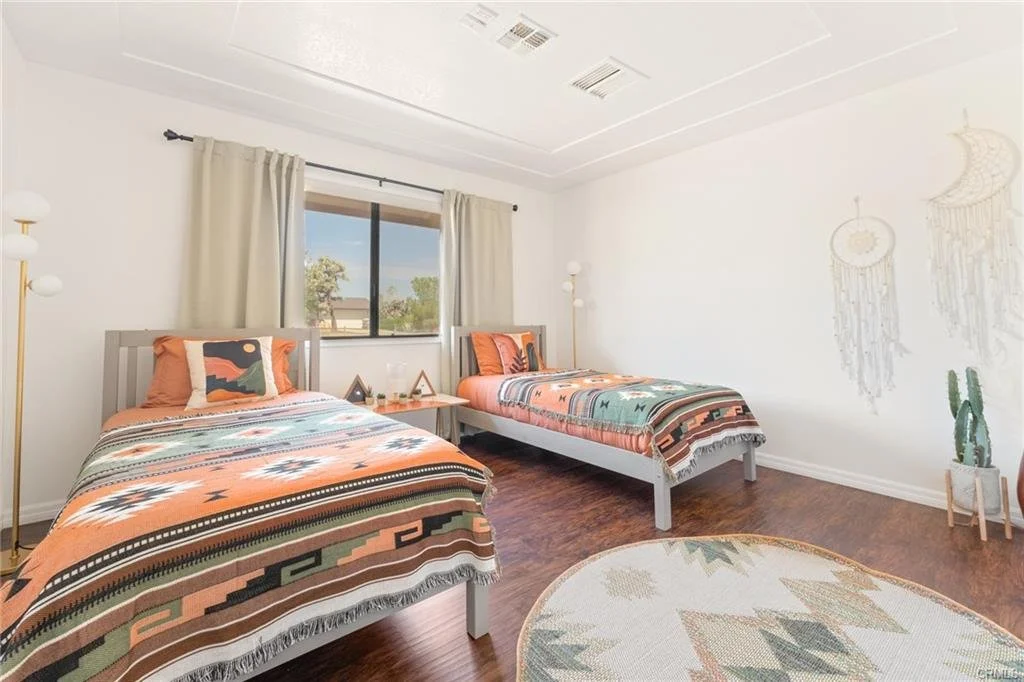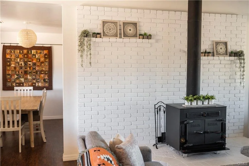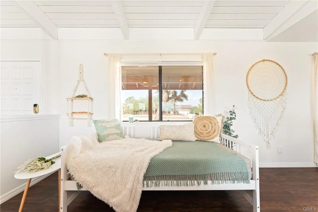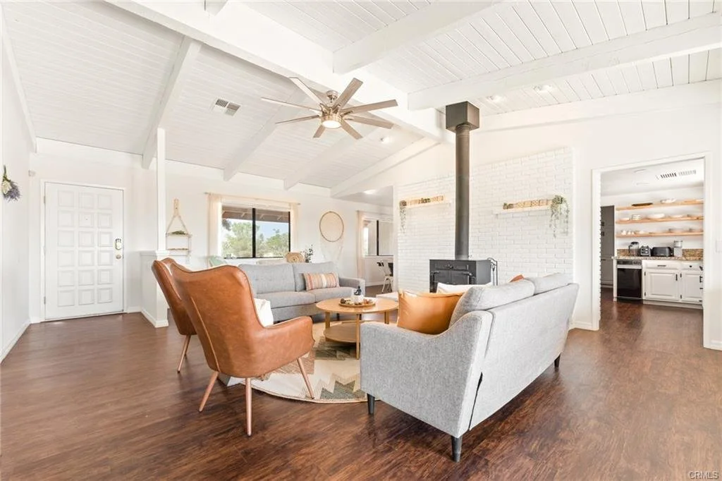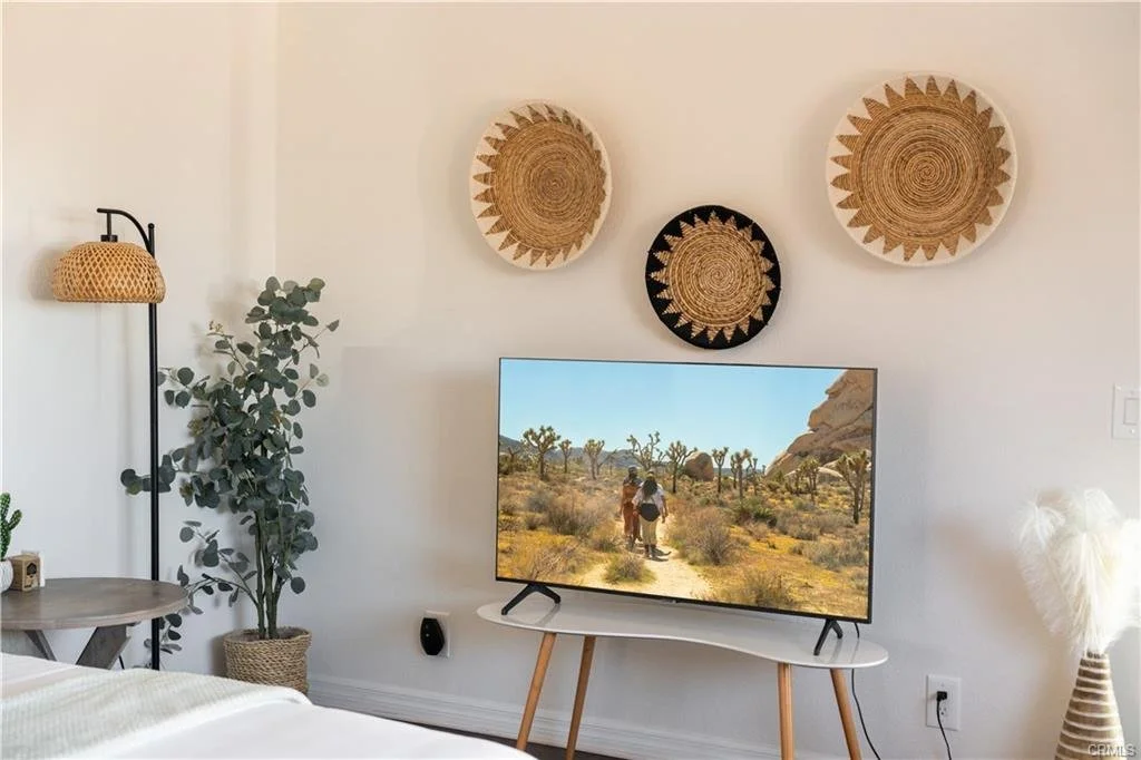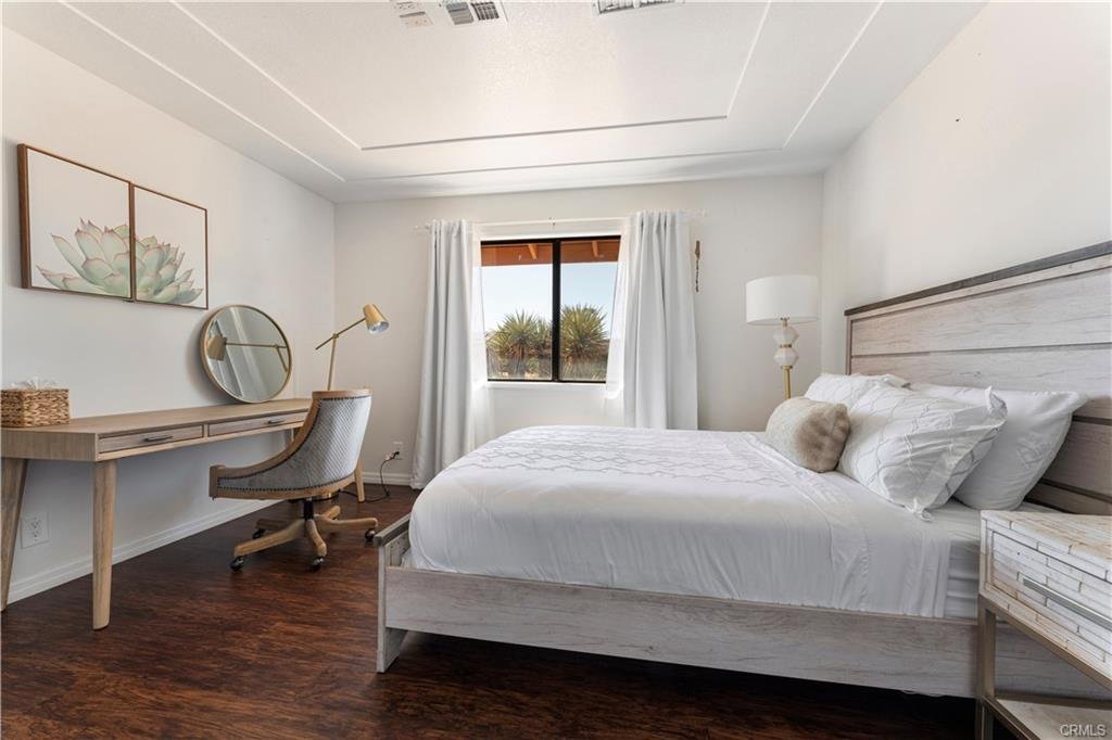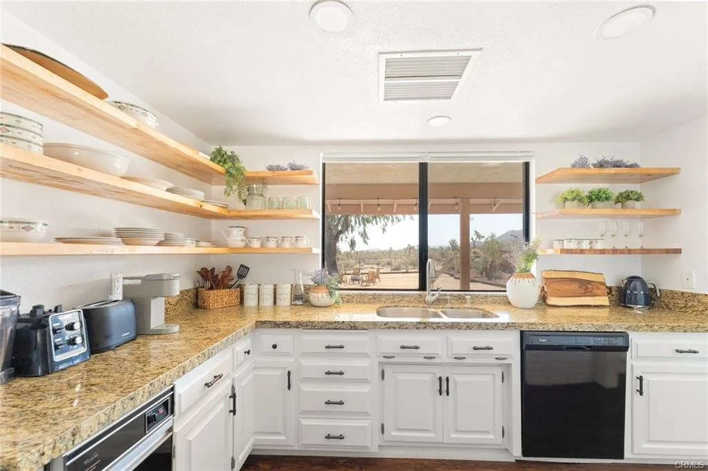 Coveted Western Hills Ranchos home - panoramic views of Joshua Tree National Park and vast wilderness from the backyard. Watch the sunrise from the back porch overlooking a forest of Joshua trees. Location is convenient to town and shopping yet has a rural feel on the eastern edge of town. Large home with nearly 1,900 square feet of living space, including three large bedrooms and three bathrooms. Living room is spacious with brick accents, a wood burning stove, and exposed wood-beamed ceiling. Rare formal dining room with built-in cabinets and a wide hallway with more built-in cabinets, in addition to a 3-car garage approximately 800 square feet; plenty of interior living space for entertaining or work-at-home areas and vast storage space throughout. PAID SOLAR for energy efficiency and reduced power bills. Natural gas meter (so no propane bills). Central AC/Heating. Mature landscaping with irrigation. Underground utilities, so no unsightly power cable running from a pole on the street. Fenced backyard for pets or children. Indoor/outdoor living at its best, with a sublime back porch with hot-tub, special areas for seating, including a dome for stargazing at night. Few homes on the market have so many upgraded interior and exterior living spaces – a must-see perfect forever home. Property TURN-KEY, FULLY-FURNISHED (to be inventoried outside of escrow). Seller purchased all furnishings exclusively for this home.