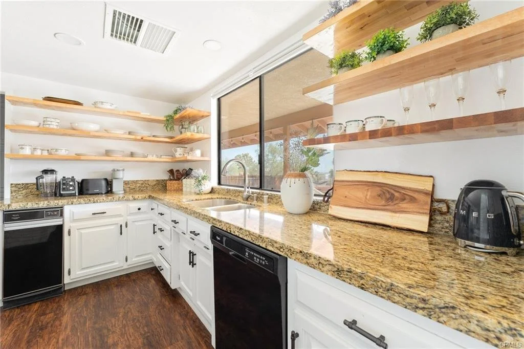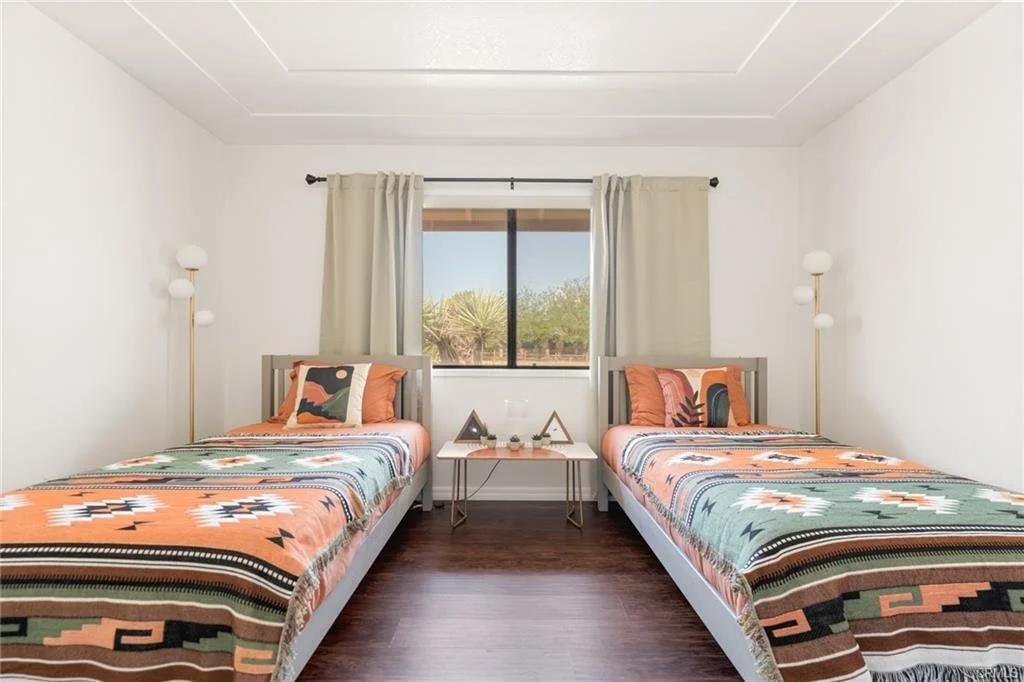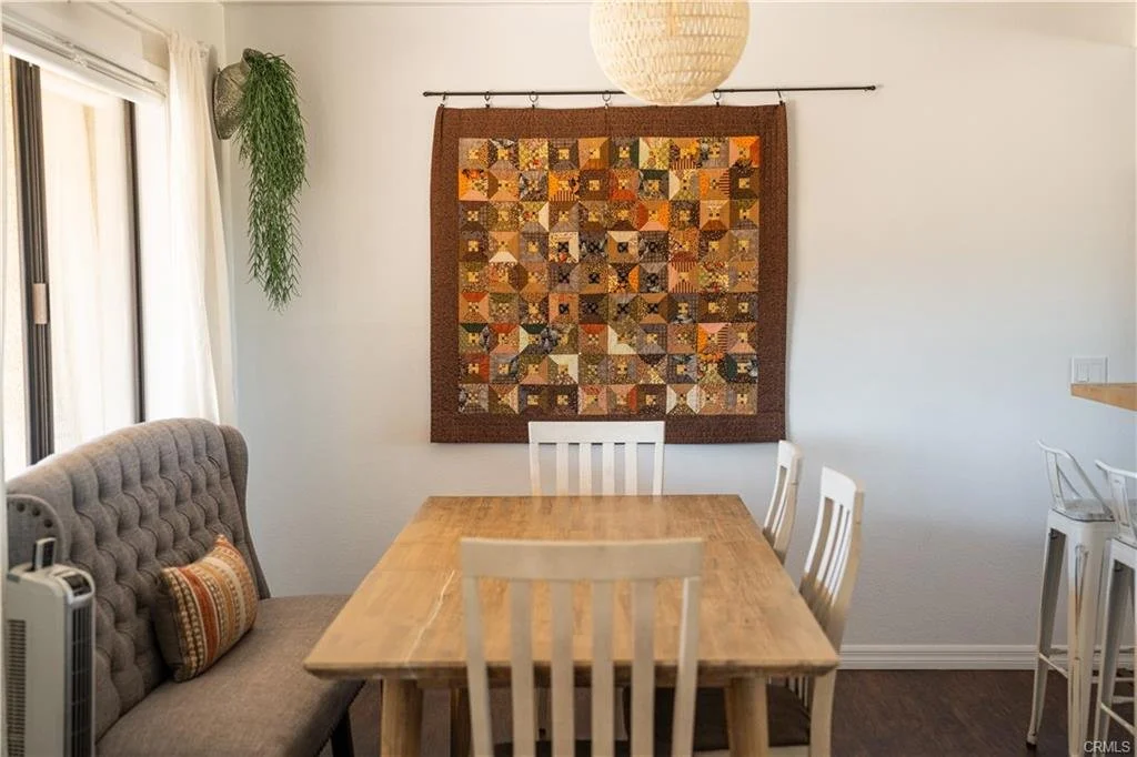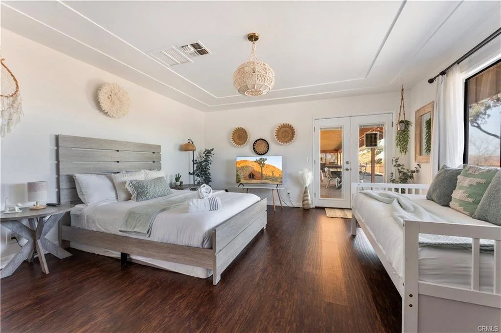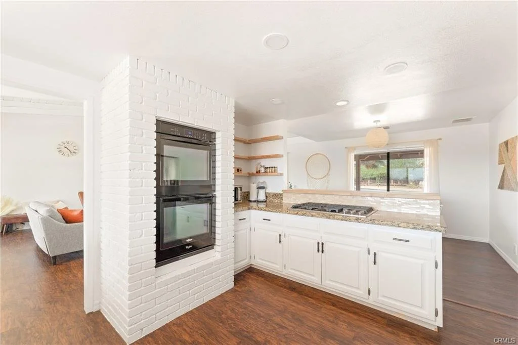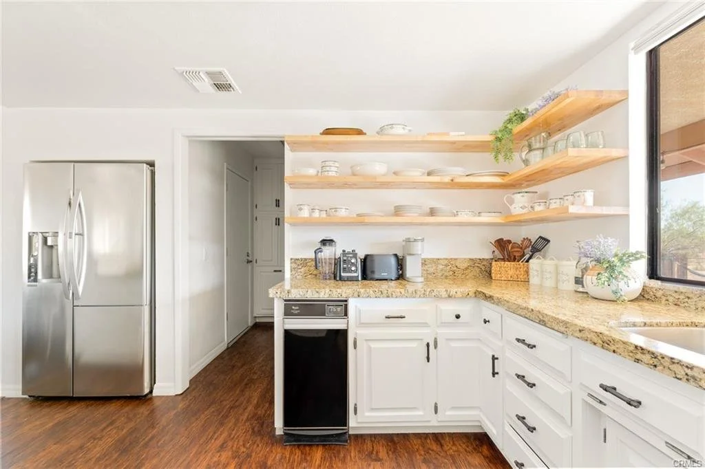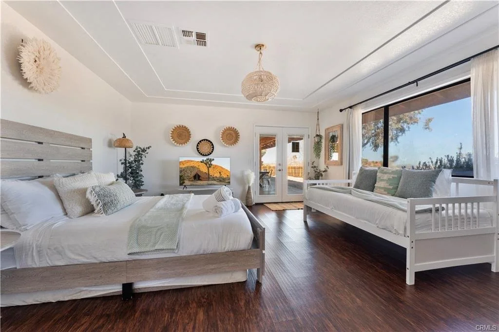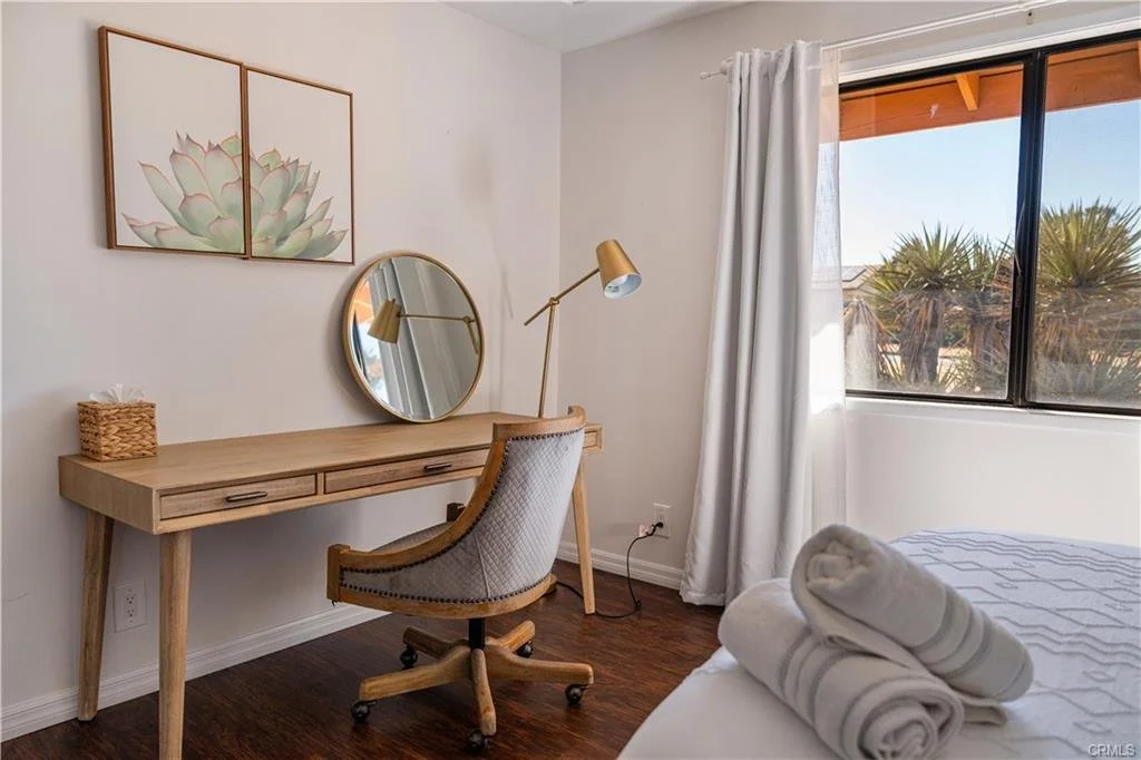 Coveted Western Hills Ranchos home - panoramic views of Joshua Tree National Park and vast wilderness from the backyard. Watch the sunrise from the back porch overlooking a forest of Joshua trees. Location is convenient to town and shopping yet has a rural feel on the eastern edge of town. Large home with nearly 1,900 square feet of living space, including three large bedrooms and three bathrooms. Living room is spacious with brick accents, a wood burning stove, and exposed wood-beamed ceiling. Rare formal dining room with built-in cabinets and a wide hallway with more built-in cabinets, in addition to a 3-car garage approximately 800 square feet; plenty of interior living space for entertaining or work-at-home areas and vast storage space throughout. PAID SOLAR for energy efficiency and reduced power bills. Natural gas meter (so no propane bills). Central AC/Heating. Mature landscaping with irrigation. Underground utilities, so no unsightly power cable running from a pole on the street. Fenced backyard for pets or children. Indoor/outdoor living at its best, with a sublime back porch with hot-tub, special areas for seating, including a dome for stargazing at night. Few homes on the market have so many upgraded interior and exterior living spaces – a must-see perfect forever home. Property TURN-KEY, FULLY-FURNISHED (to be inventoried outside of escrow). Seller purchased all furnishings exclusively for this home.