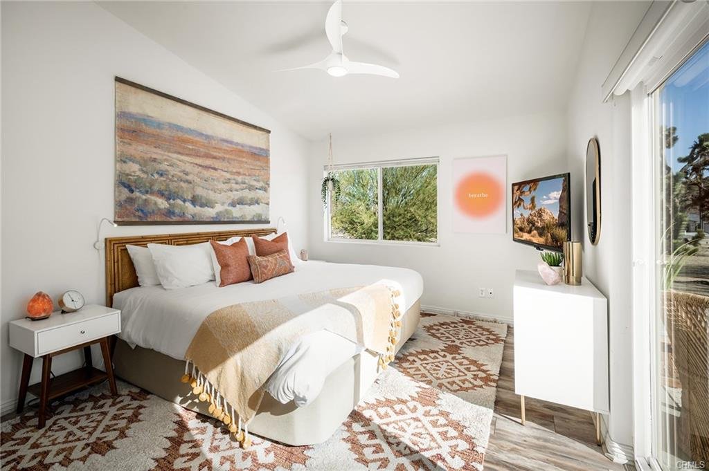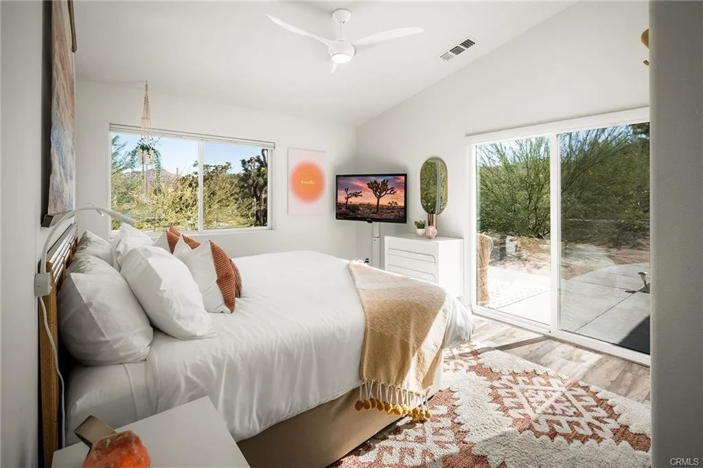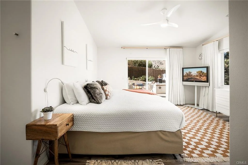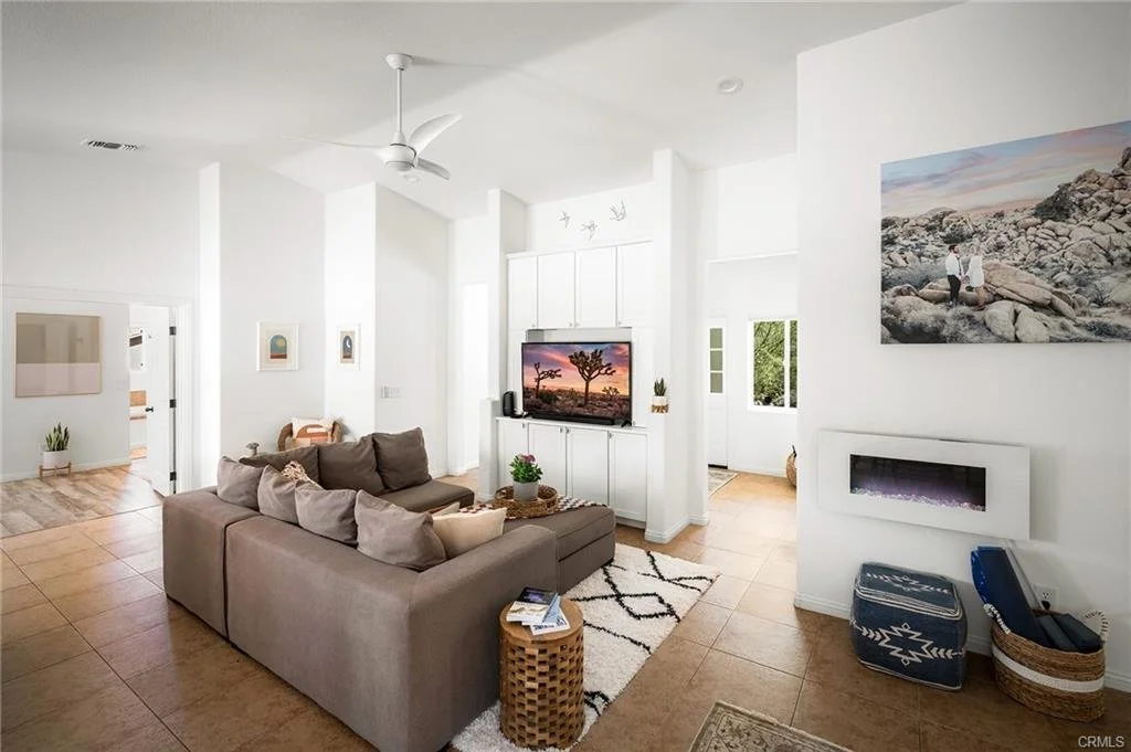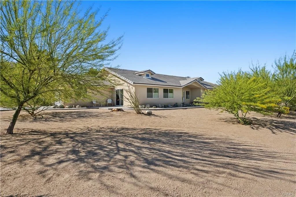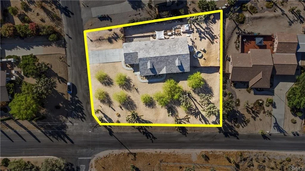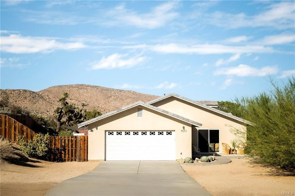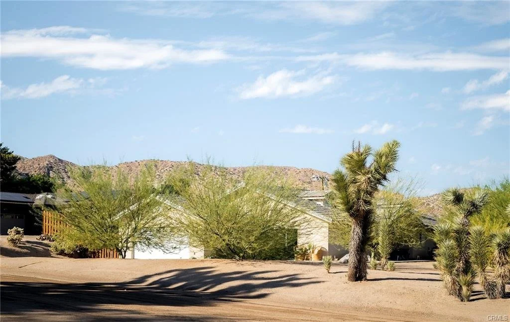 Set against sweeping mountain views in one of the area’s greenest and most established neighborhoods, this beautifully maintained 3-bedroom, 2-bath home with bonus room sits on a prime half-acre corner lot in desirable Country Club Estates. A mature, tree-lined front yard with lush desert landscaping creates exceptional curb appeal and a welcoming arrival. No HOA. Newly paved streets, connected to public sewer and natural gas, school bus stop, and a short walk to the area’s only golf course and popular café, The Roost. Conveniently and centrally located just a short drive to Joshua Tree, Pioneertown, and Palm Springs. The open-concept layout features high ceilings and abundant natural light, with mountain views visible from most rooms. Modern fixtures, ceiling fans throughout, custom blinds and curtains, and stylish flooring create a comfortable and inviting interior. The large primary suite offers a spacious bathroom with dual vanities, extra large soaking tub, walk-in shower, and a generous walk-in closet. TVs are included in all bedrooms. The fully fenced backyard is designed for entertaining and relaxation, featuring a custom patio with built-in gas fireplace and seating, raised lookout deck with outdoor queen bed, 4-person hot tub, oversized cowboy tub, shaded dining area, BBQ, and beautifully landscaped desert grounds. Additional features include a fully equipped kitchen with modern appliances, electric fireplace, laundry room with newer washer/dryer, attached two-car garage, and rare concrete roof. Offered partially furnished; buyers to request exclusions list. Property is move-in ready and perfectly suited as a full-time residence or an effortless desert getaway.