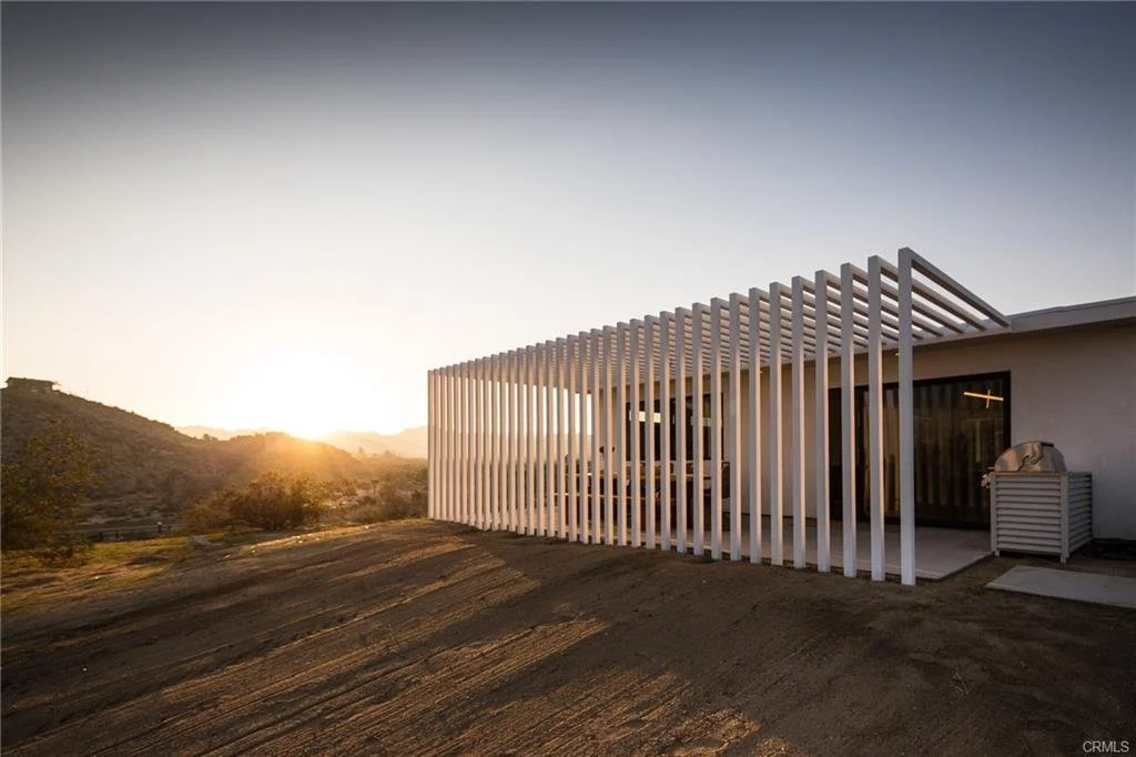 ZEBRA SHADOW: Reimagined 1957 Mid Century Modern tucked up in the hills near the National Park. Natural, elevated, private location with joshua trees, boulders and wildlife. Every aspect, interior & exterior, upgraded and remodeled to the highest aesthetic standard. High-grossing STR with proven track record provided on request. Turnkey, fully-furnished. Interior features include custom wishbone pattern counter-to-ceiling backsplash & quartz double-waterfall kitchen island. Polished concrete floors throughout. Mountain views from every window. Tastefully understated interior design with refined light fixtures, art work and furnishings. Exterior includes unique custom fabricated zebra design porch covers, two private patio areas, propane fire feature and hot tub in natural setting perfect for stargazing. Purchase includes two parcels covering over 3-acres of pristine desert. Majestic views in every direction from one of the most exquisitely designed homes in the coveted Joshua Highlands/Monument Manor area of town, minutes to the front gate of the National Park.