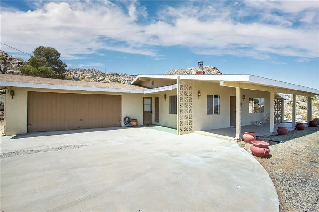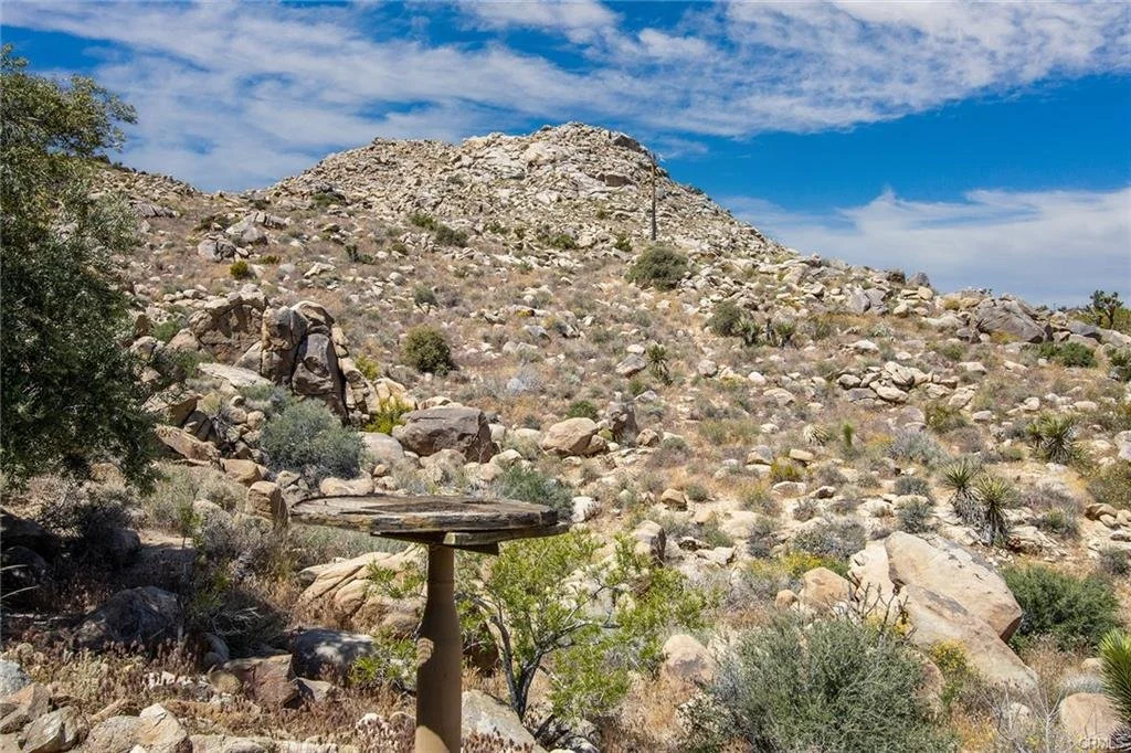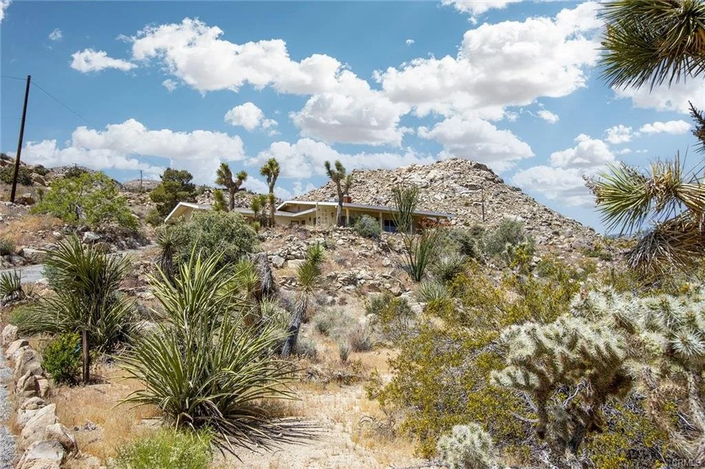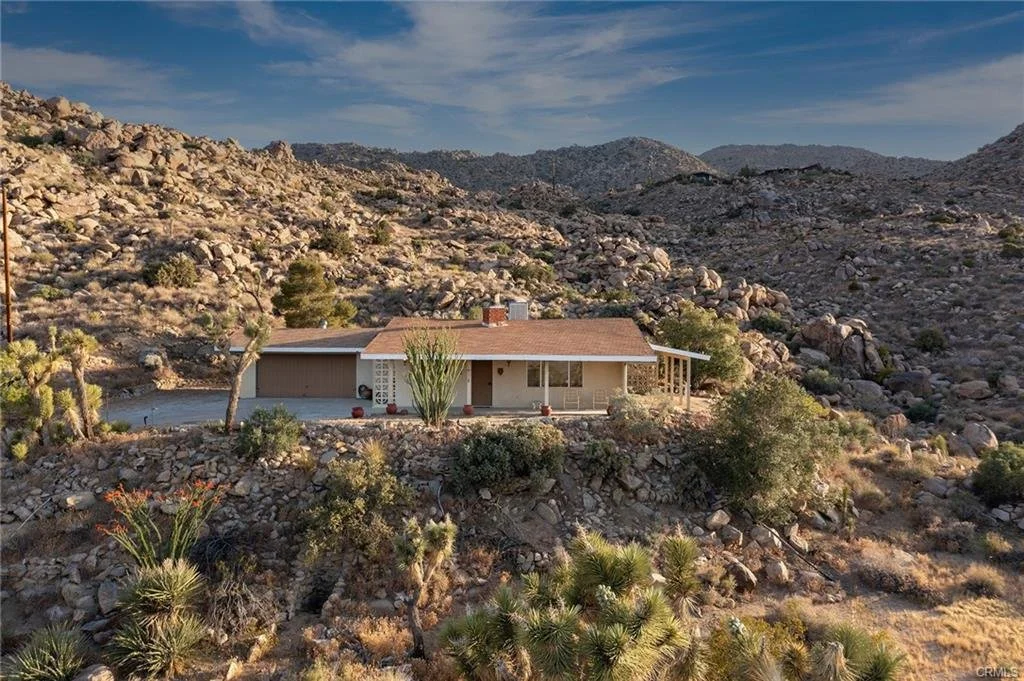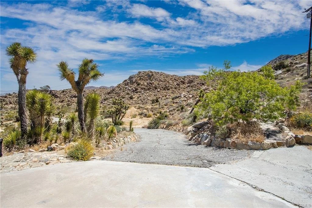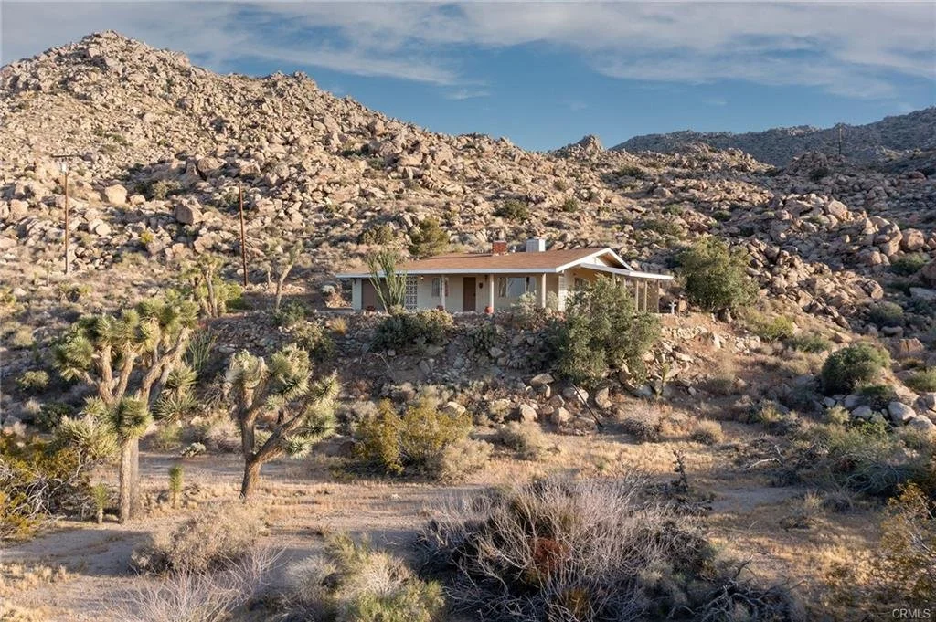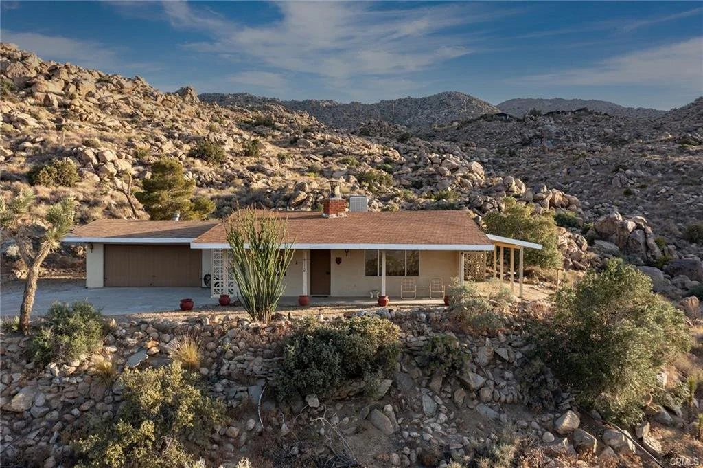 BOULDERS & JOSHUA TREES: Majestic private setting on rocky hillside with paved road access minutes to downtown. Walk out the backdoor, up your own boulder hillside and into a nature preserve connected to Joshua Tree National Park. Avoid the crowds – leave your car in the garage – while hiking from home! Over 20-acres, already split in two separate parcels: 15+ acres on which the house resides & 4.5-acre vacant parcel to develop or keep as a privacy buffer. One can build a primary home and guesthouse on each parcel – therefore you can still add a guesthouse to the 15-acre parcel and an additional home and guesthouse to the second parcel, allowing for 3 additional dwellings – or keep as your own nature preserve. Elegant, understated midcentury interior, featuring block fireplace partitioning dining and living room. Quality concrete flooring ready to be polished to luster. Surrounding shade porches for authentic indoor/outdoor living to experience rural serenity while sipping your morning coffee or an evening beverage at sunset. Home needs complete remodel/updating to be sold in As-Is Condition. No bumpy dirt roads to reach your front door – smooth sailing on paved roads – convenient to public amenities (dining, entertainment, shopping and hospital – all only minutes away) yet so private and remote.
