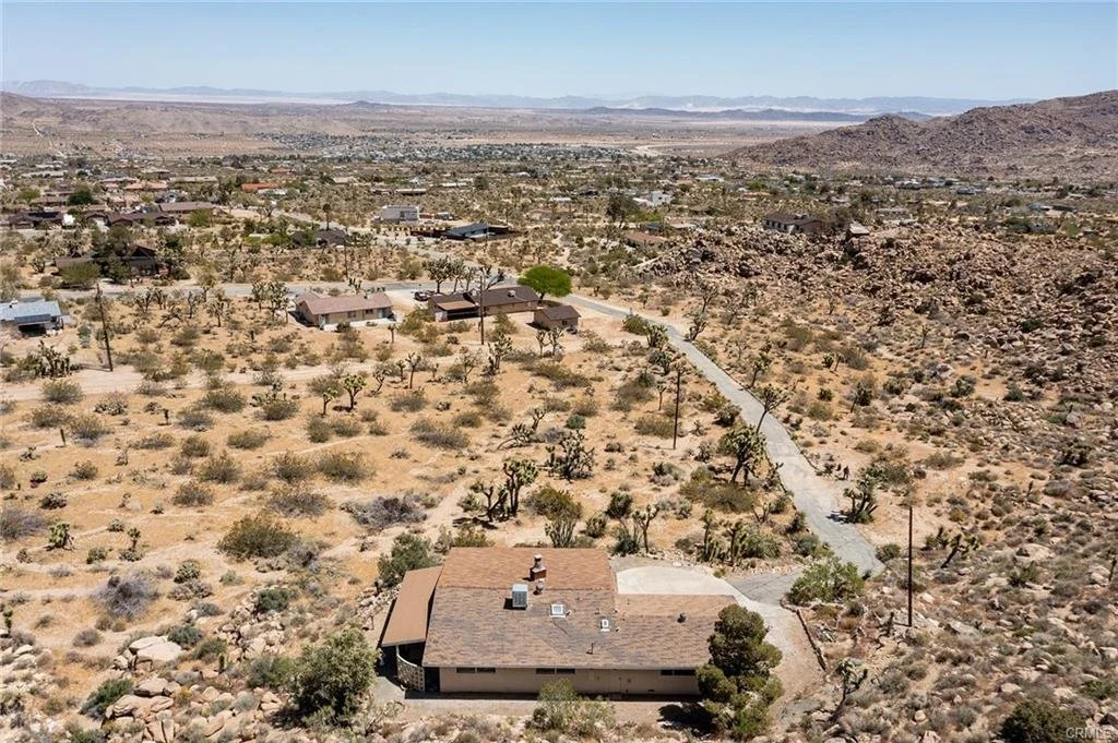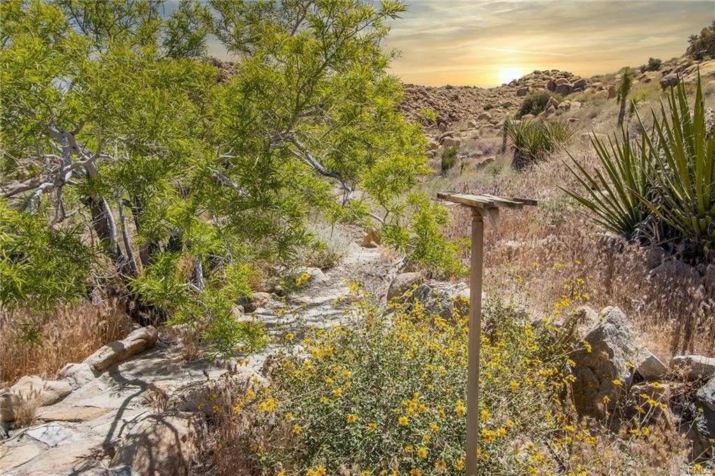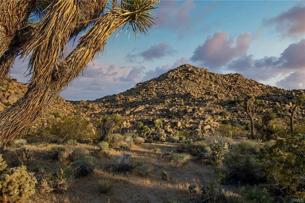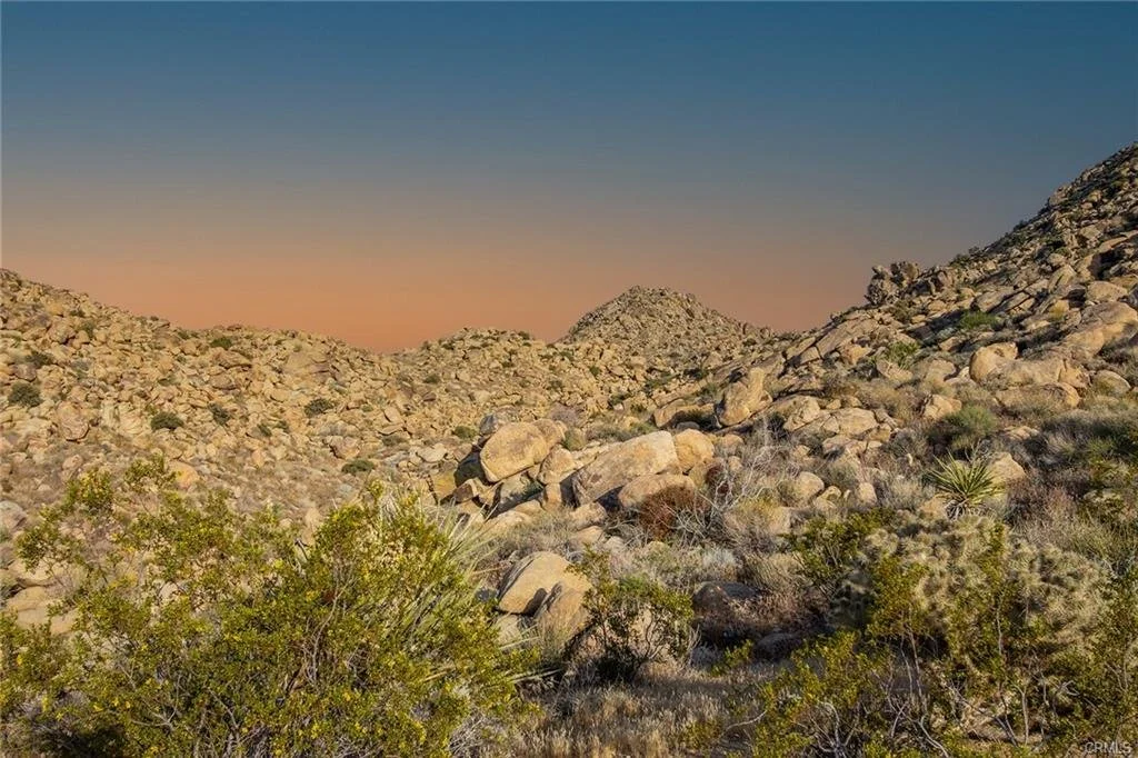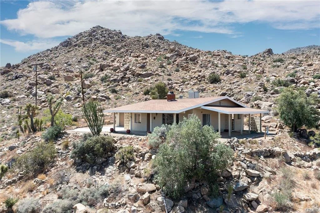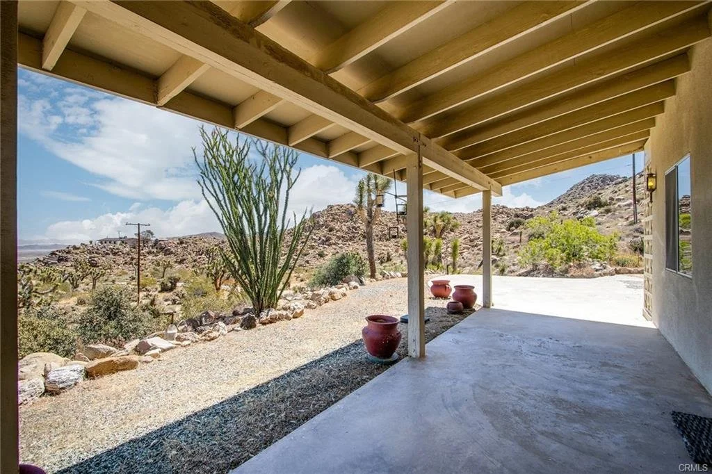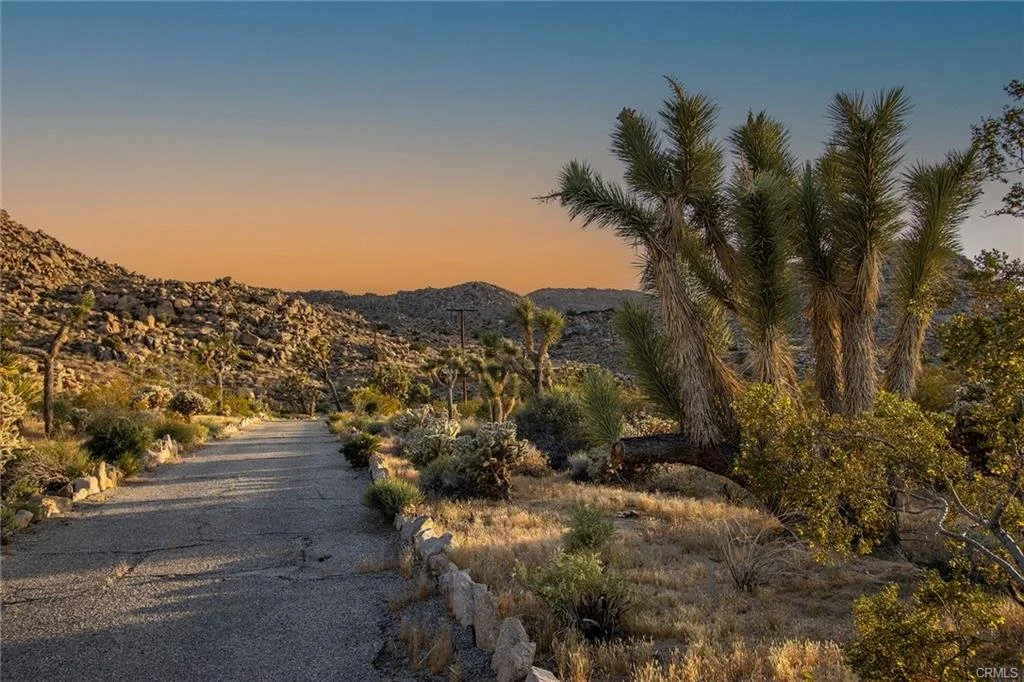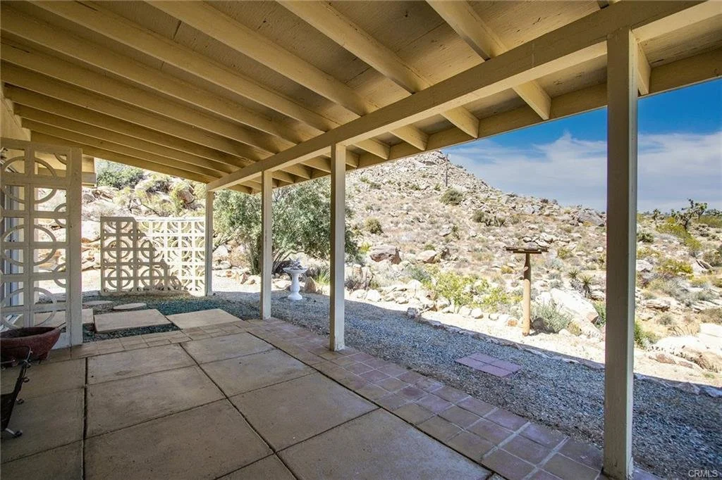 BOULDERS & JOSHUA TREES: Majestic private setting on rocky hillside with paved road access minutes to downtown. Walk out the backdoor, up your own boulder hillside and into a nature preserve connected to Joshua Tree National Park. Avoid the crowds – leave your car in the garage – while hiking from home! Over 20-acres, already split in two separate parcels: 15+ acres on which the house resides & 4.5-acre vacant parcel to develop or keep as a privacy buffer. One can build a primary home and guesthouse on each parcel – therefore you can still add a guesthouse to the 15-acre parcel and an additional home and guesthouse to the second parcel, allowing for 3 additional dwellings – or keep as your own nature preserve. Elegant, understated midcentury interior, featuring block fireplace partitioning dining and living room. Quality concrete flooring ready to be polished to luster. Surrounding shade porches for authentic indoor/outdoor living to experience rural serenity while sipping your morning coffee or an evening beverage at sunset. Home needs complete remodel/updating to be sold in As-Is Condition. No bumpy dirt roads to reach your front door – smooth sailing on paved roads – convenient to public amenities (dining, entertainment, shopping and hospital – all only minutes away) yet so private and remote.