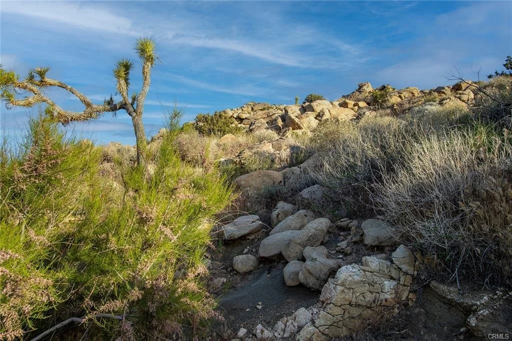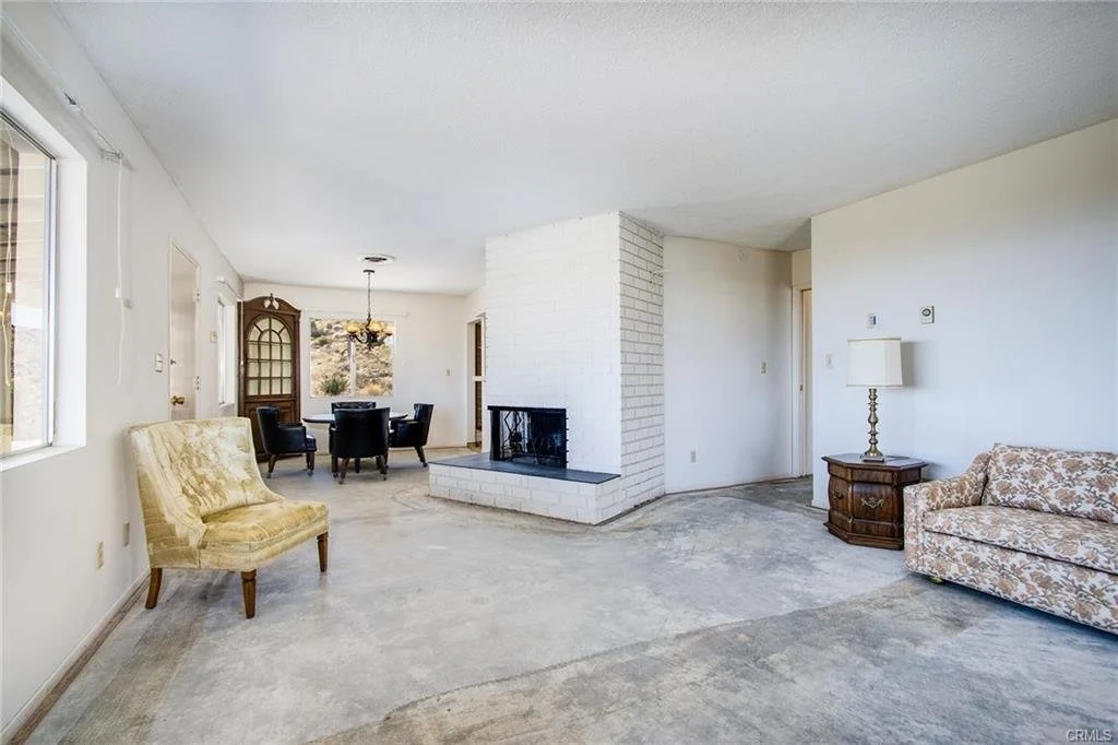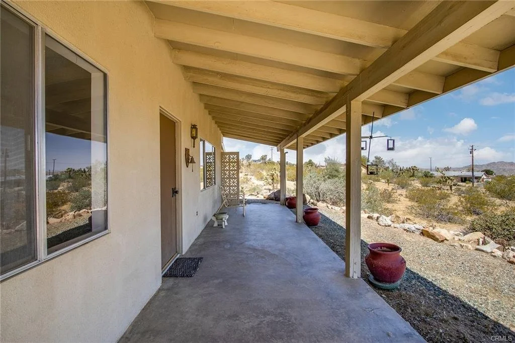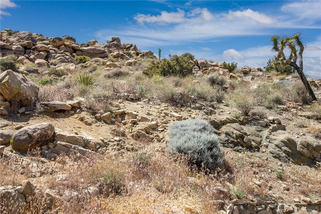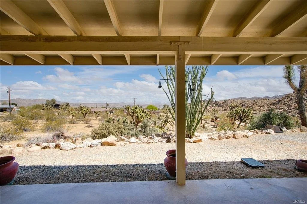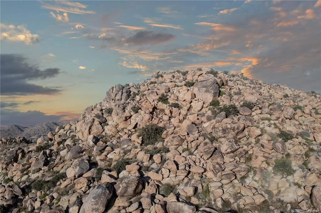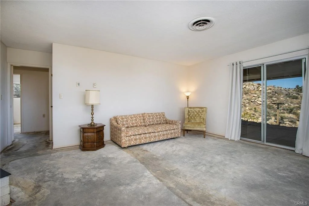 BOULDERS & JOSHUA TREES: Majestic private setting on rocky hillside with paved road access minutes to downtown. Walk out the backdoor, up your own boulder hillside and into a nature preserve connected to Joshua Tree National Park. Avoid the crowds – leave your car in the garage – while hiking from home! Over 20-acres, already split in two separate parcels: 15+ acres on which the house resides & 4.5-acre vacant parcel to develop or keep as a privacy buffer. One can build a primary home and guesthouse on each parcel – therefore you can still add a guesthouse to the 15-acre parcel and an additional home and guesthouse to the second parcel, allowing for 3 additional dwellings – or keep as your own nature preserve. Elegant, understated midcentury interior, featuring block fireplace partitioning dining and living room. Quality concrete flooring ready to be polished to luster. Surrounding shade porches for authentic indoor/outdoor living to experience rural serenity while sipping your morning coffee or an evening beverage at sunset. Home needs complete remodel/updating to be sold in As-Is Condition. No bumpy dirt roads to reach your front door – smooth sailing on paved roads – convenient to public amenities (dining, entertainment, shopping and hospital – all only minutes away) yet so private and remote.