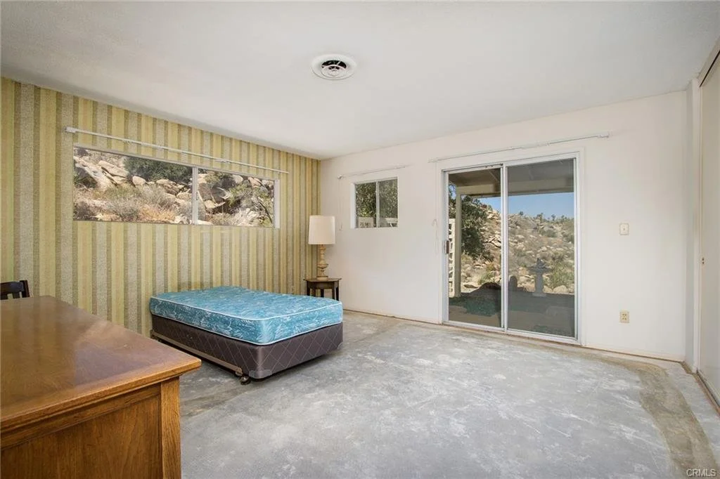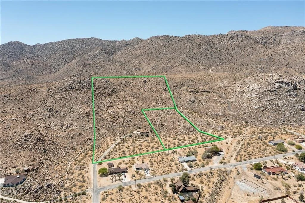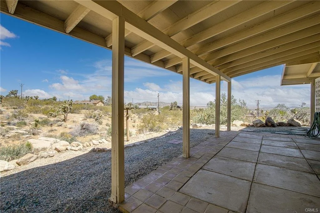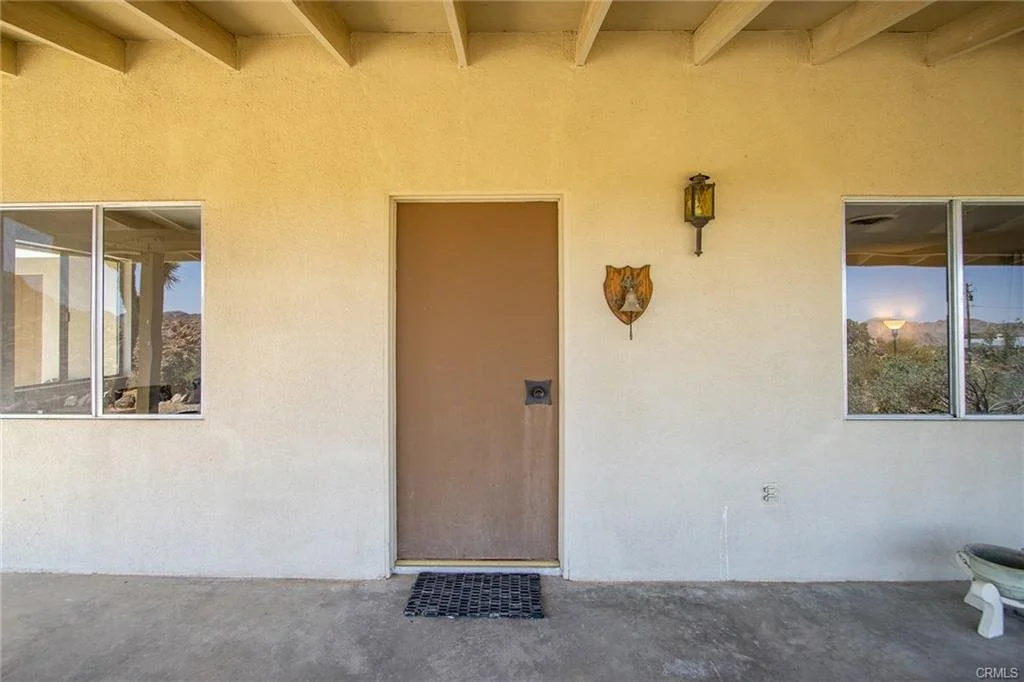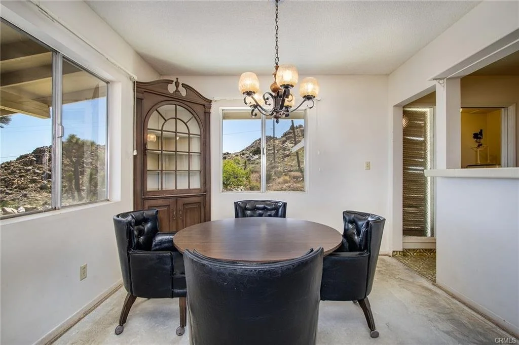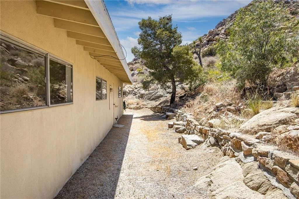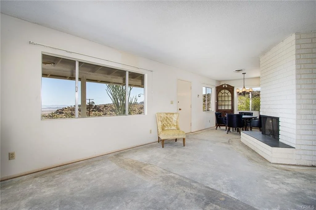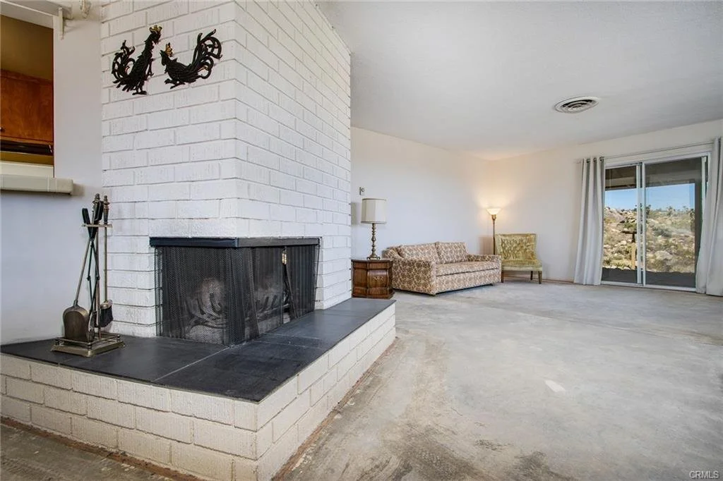 BOULDERS & JOSHUA TREES: Majestic private setting on rocky hillside with paved road access minutes to downtown. Walk out the backdoor, up your own boulder hillside and into a nature preserve connected to Joshua Tree National Park. Avoid the crowds – leave your car in the garage – while hiking from home! Over 20-acres, already split in two separate parcels: 15+ acres on which the house resides & 4.5-acre vacant parcel to develop or keep as a privacy buffer. One can build a primary home and guesthouse on each parcel – therefore you can still add a guesthouse to the 15-acre parcel and an additional home and guesthouse to the second parcel, allowing for 3 additional dwellings – or keep as your own nature preserve. Elegant, understated midcentury interior, featuring block fireplace partitioning dining and living room. Quality concrete flooring ready to be polished to luster. Surrounding shade porches for authentic indoor/outdoor living to experience rural serenity while sipping your morning coffee or an evening beverage at sunset. Home needs complete remodel/updating to be sold in As-Is Condition. No bumpy dirt roads to reach your front door – smooth sailing on paved roads – convenient to public amenities (dining, entertainment, shopping and hospital – all only minutes away) yet so private and remote.